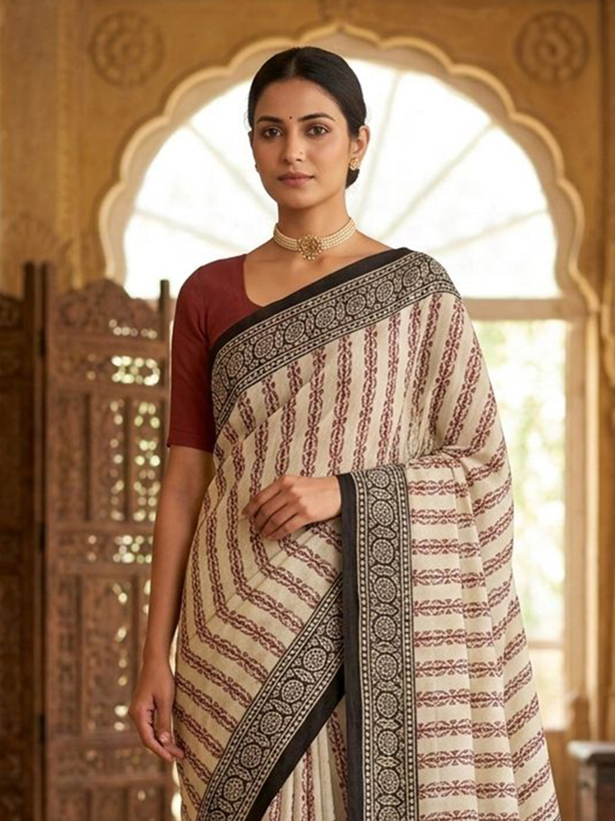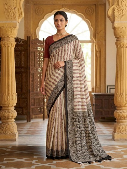 Gracefully enhancing your elegance, this beige muslin saree brings soft charm and effortless beauty to your festive wardrobe. Detailed with delicate ethnic printed patterns that create a subtle yet refined appeal. Perfect for festive occasions, it comes with an unstitched blouse piece, offering comfort and the freedom to style it with timeless sophistication.