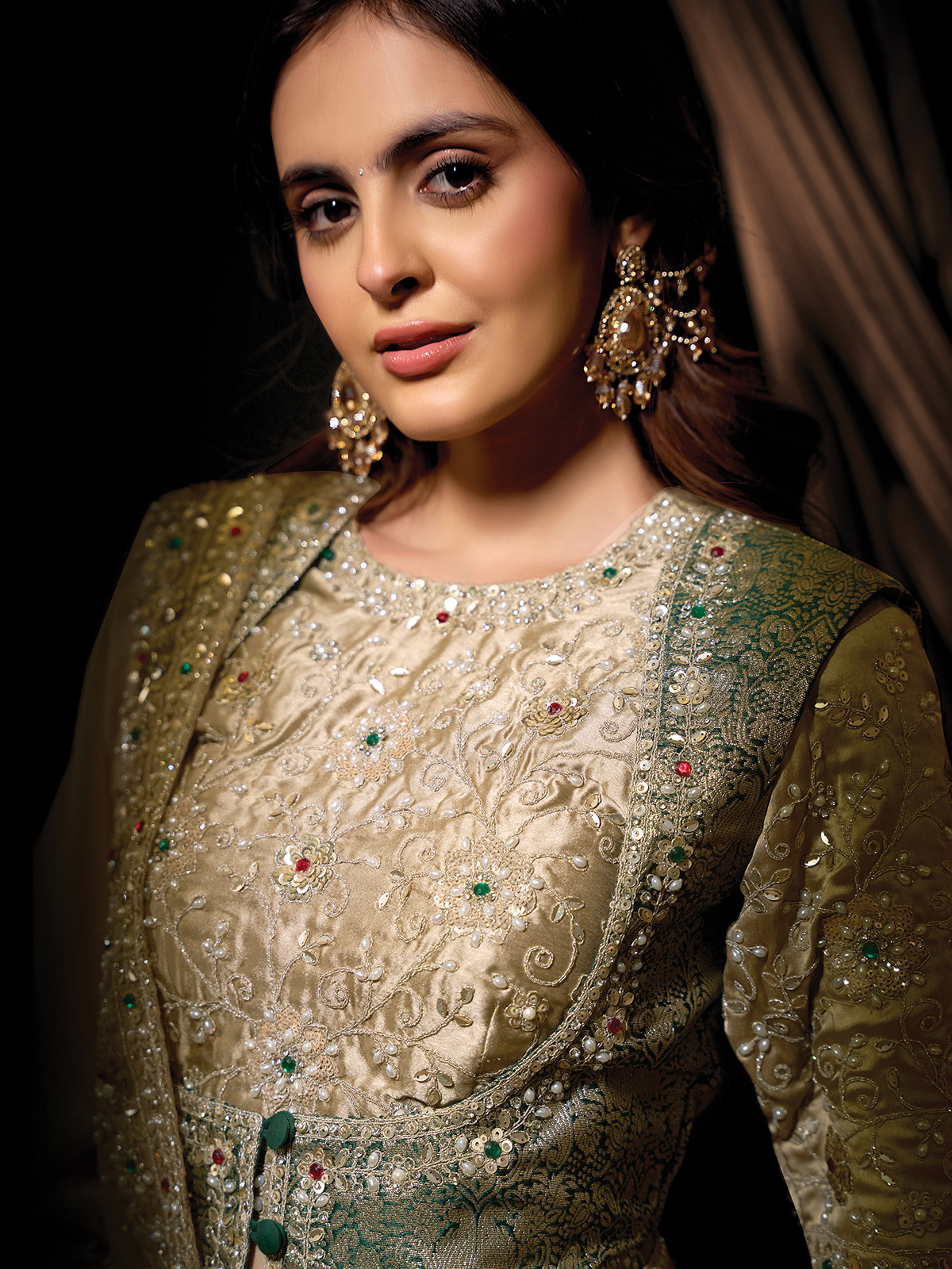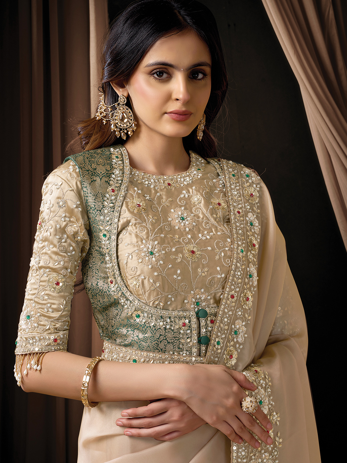 Enhancing the graceful aura of women who adore refined elegance, this beige organza satin saree radiates soft sophistication in every drape. It is beautifully adorned with resham, sequins, stones, and beads work that creates a rich, luminous texture throughout. Perfect for festivals, receptions, and weddings, it comes with an unstitched blouse featuring heavy embroidery for a complete festive look.