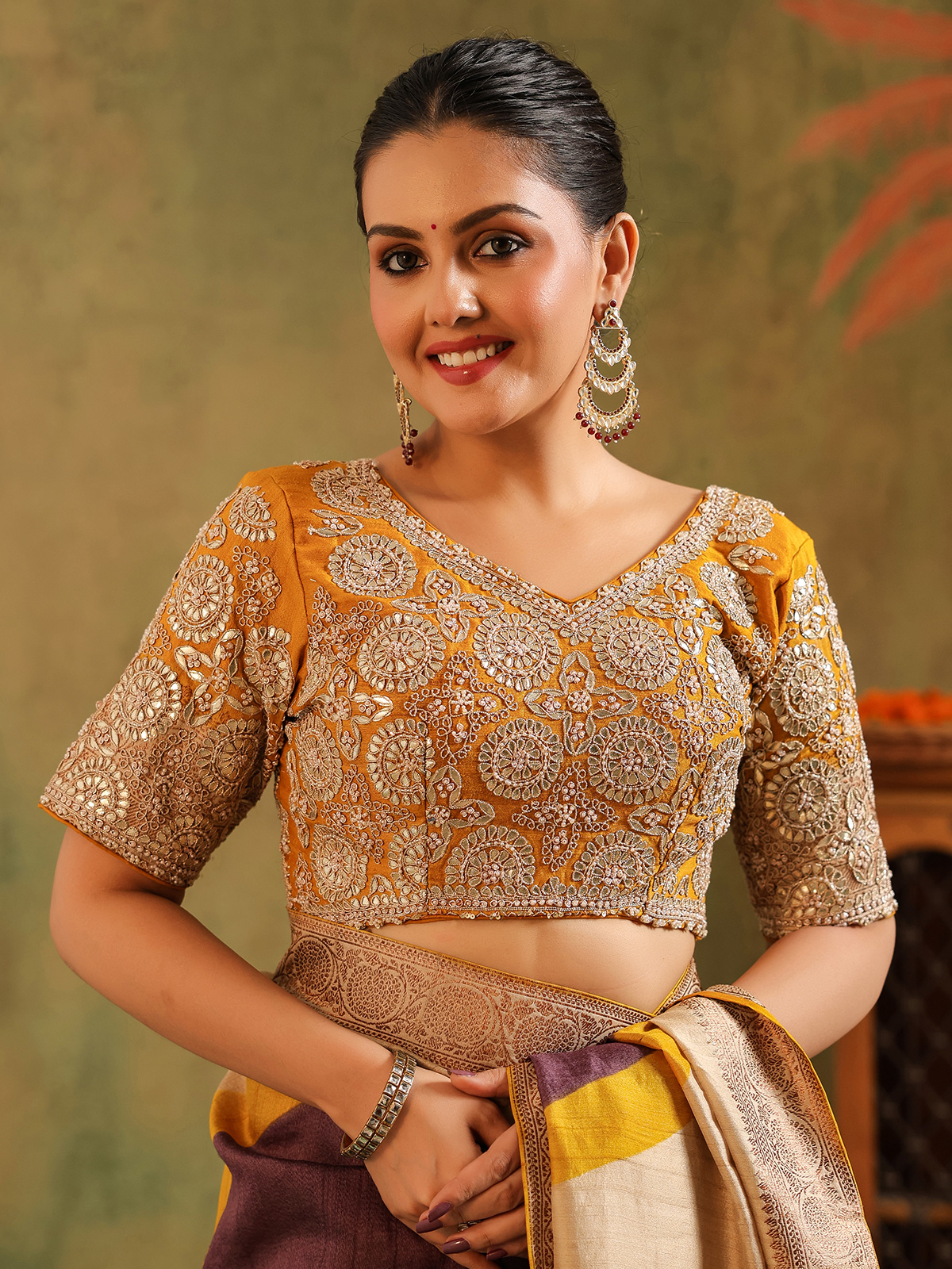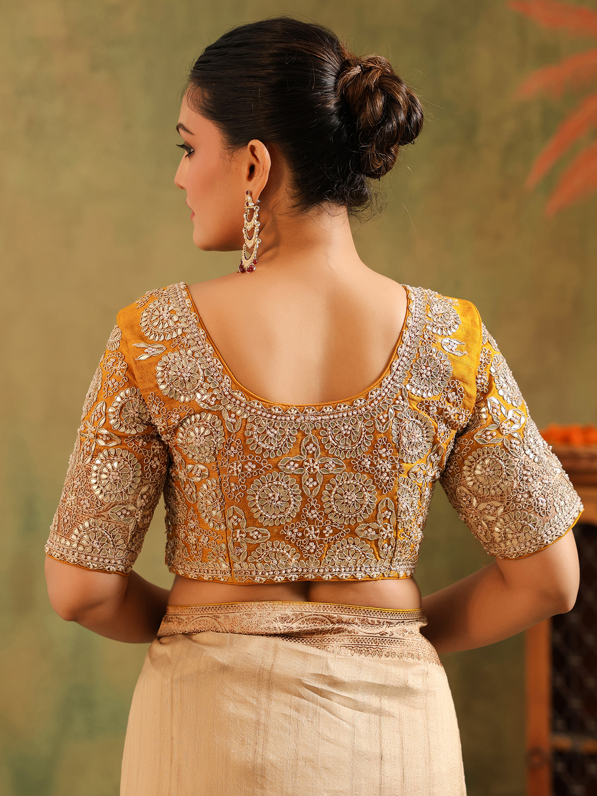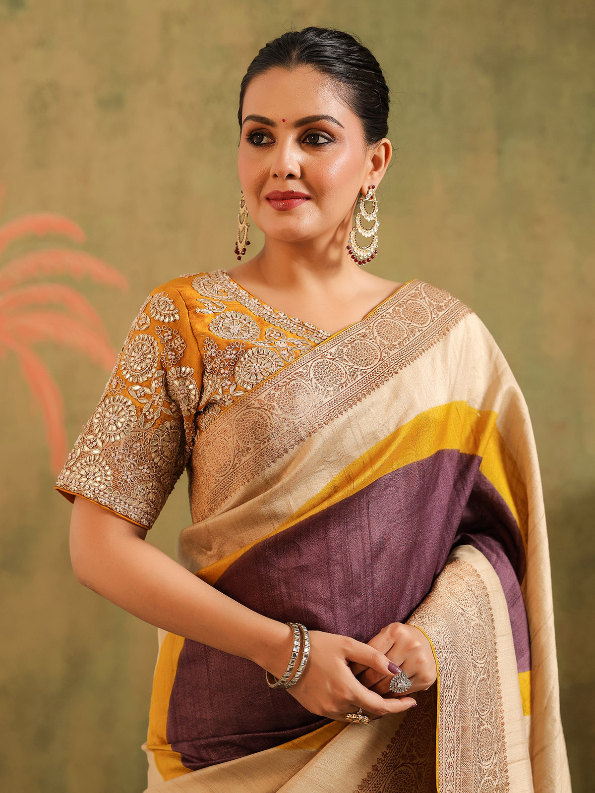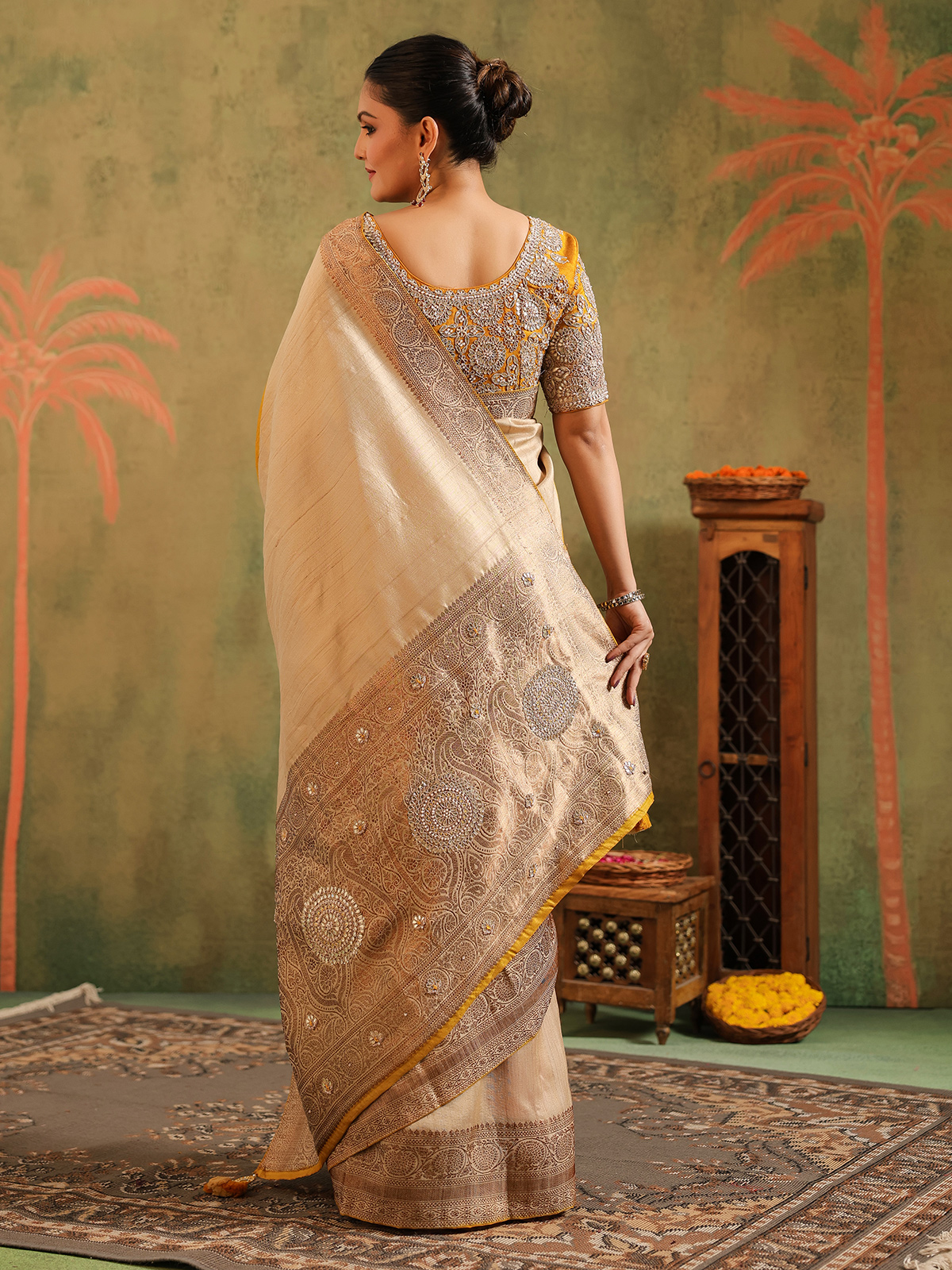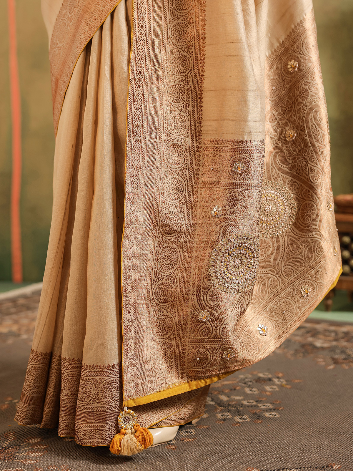 Unprinted and serene, this beige silk saree carries sequins, beads, thread, zardosi, and gota like soft echoes of craftsmanship. Its minimalism lets the embroidery breathe with delicate pride. Comes with an unstitched blouse piece, ready to grace intimate weddings and traditional gatherings with its understated beauty and timeless soul.