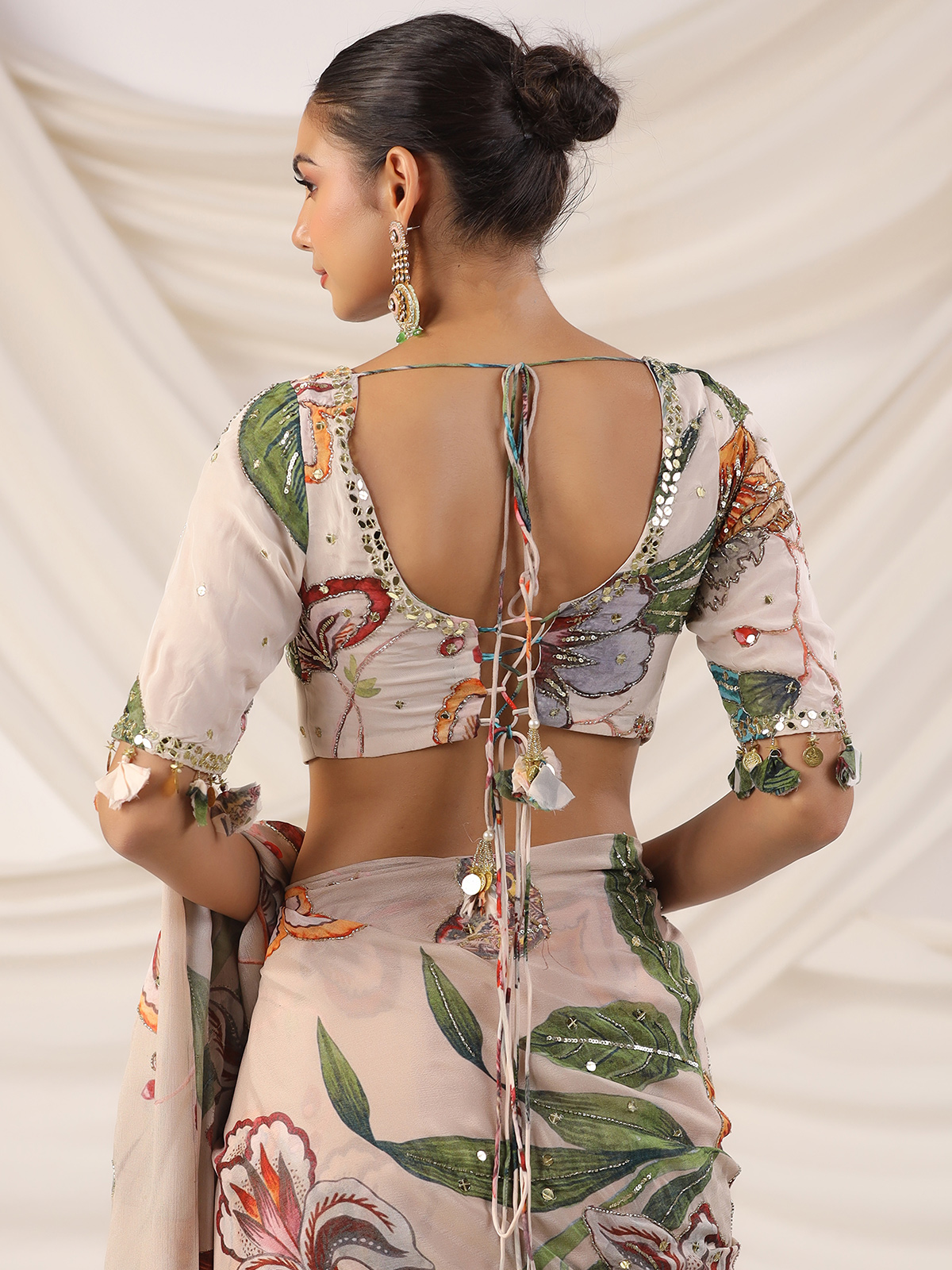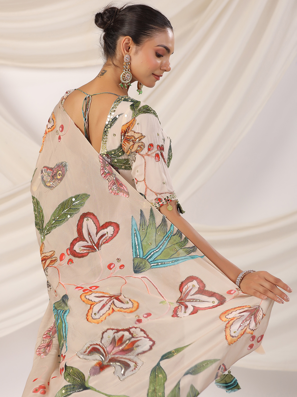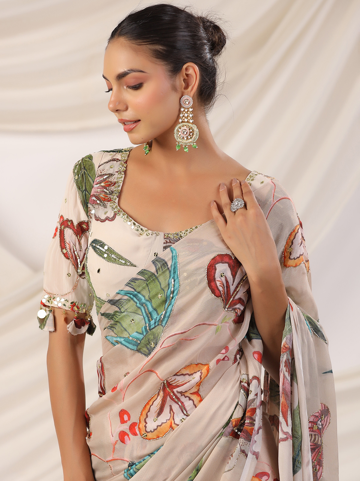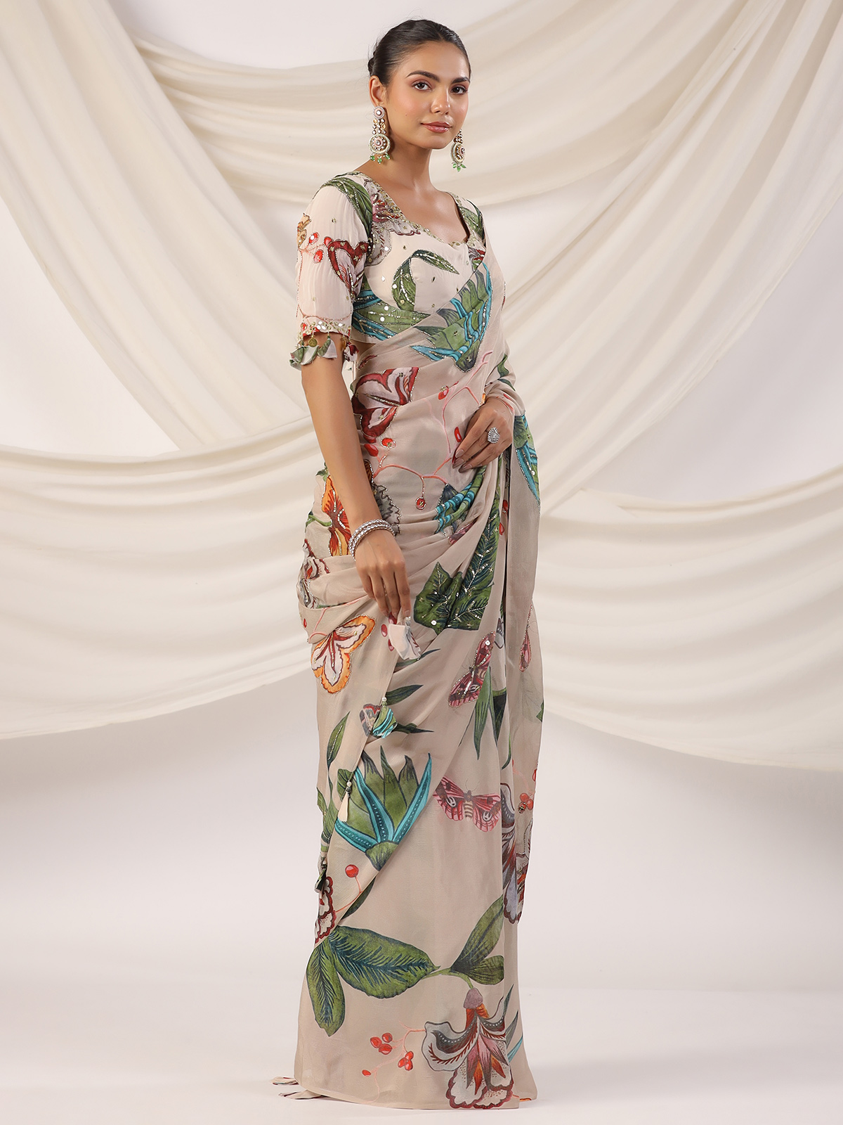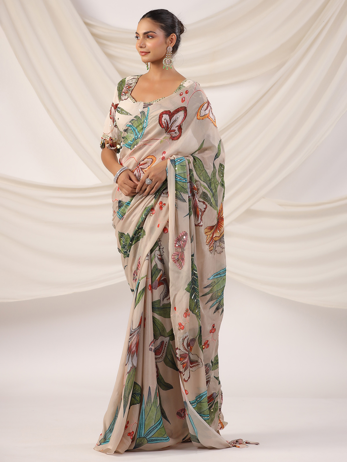 Beige Printed Satin Saree For Festive