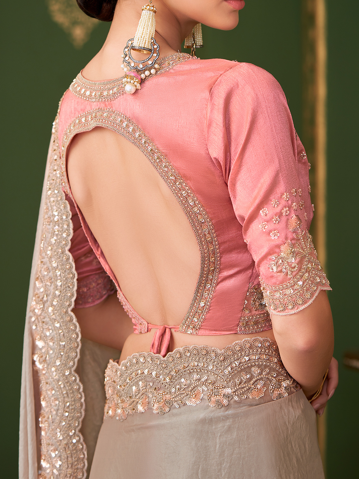Designed in elegant beige satin georgette silk saree is adorned with delicate embroidery, sequins and cutdana work. Complemented by a contrast unstitched blouse piece, it offers understated luxury ideal for weddings, receptions, sangeet and festive gatherings.