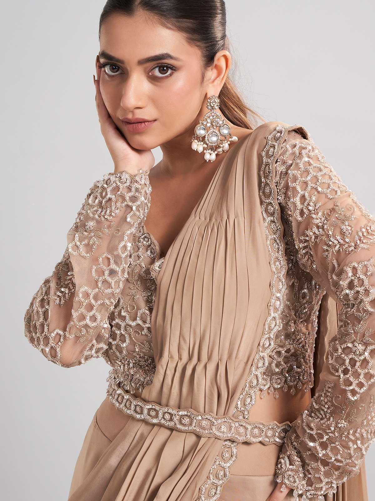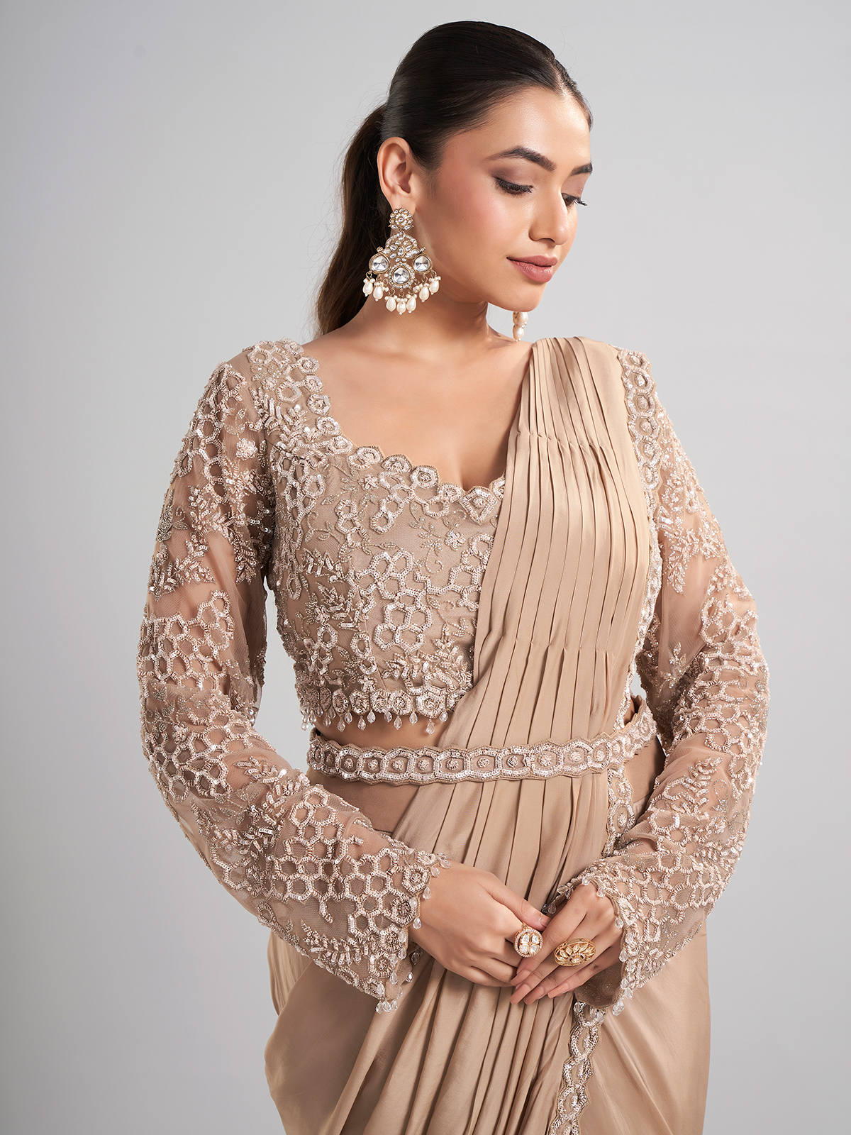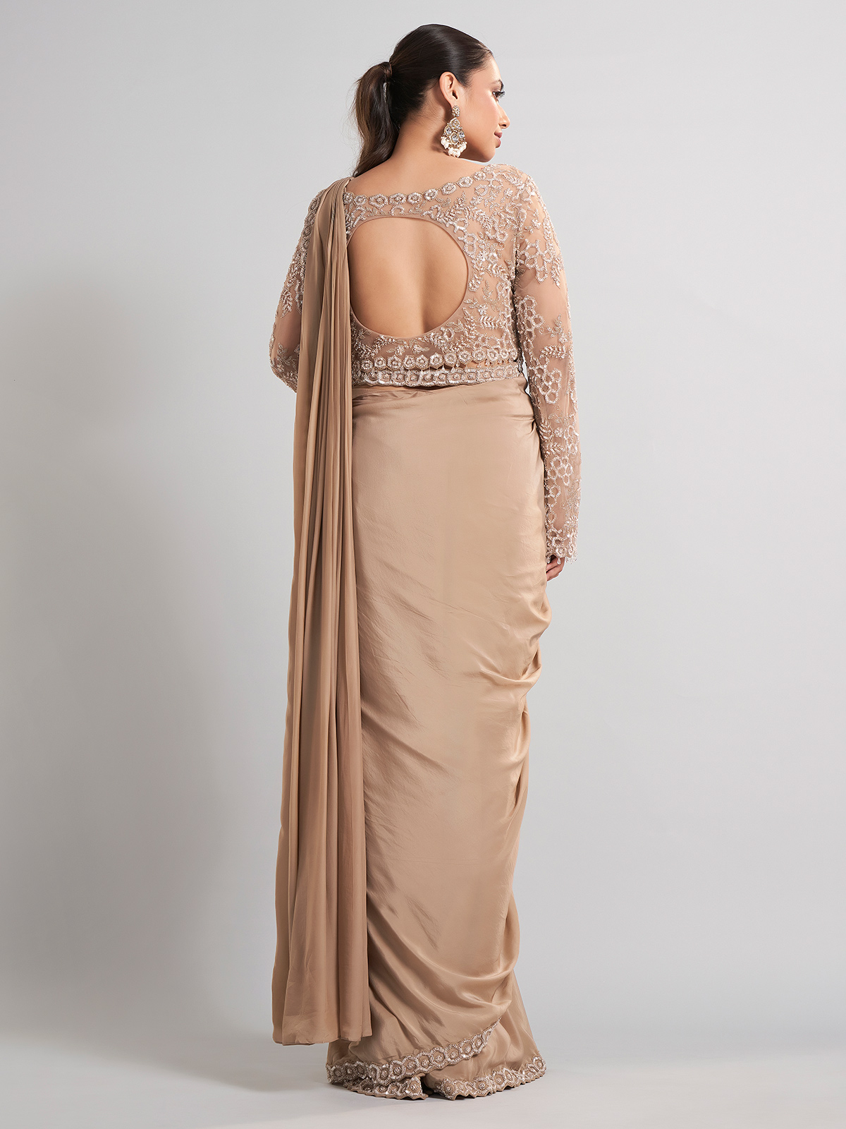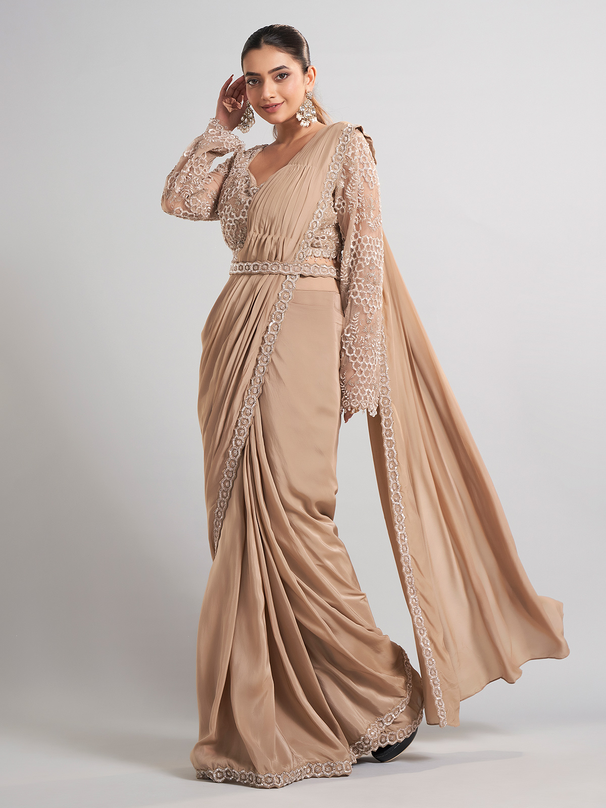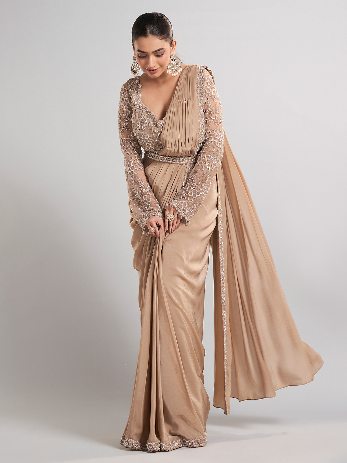 Crafted in rich satin silk, this beige designer saree features detailed cutdana and sequins work, offering a soft, flowing drape. An ideal pick for high-profile occasions like weddings and receptions.