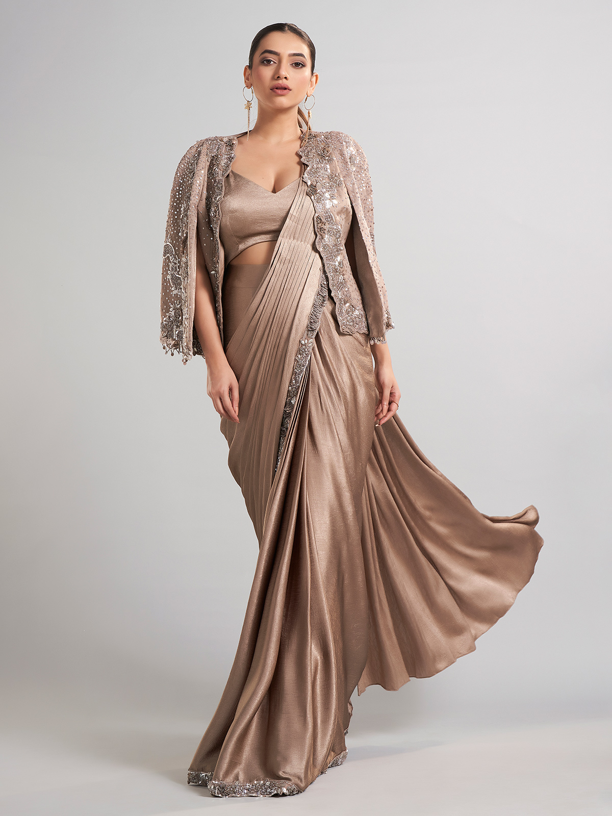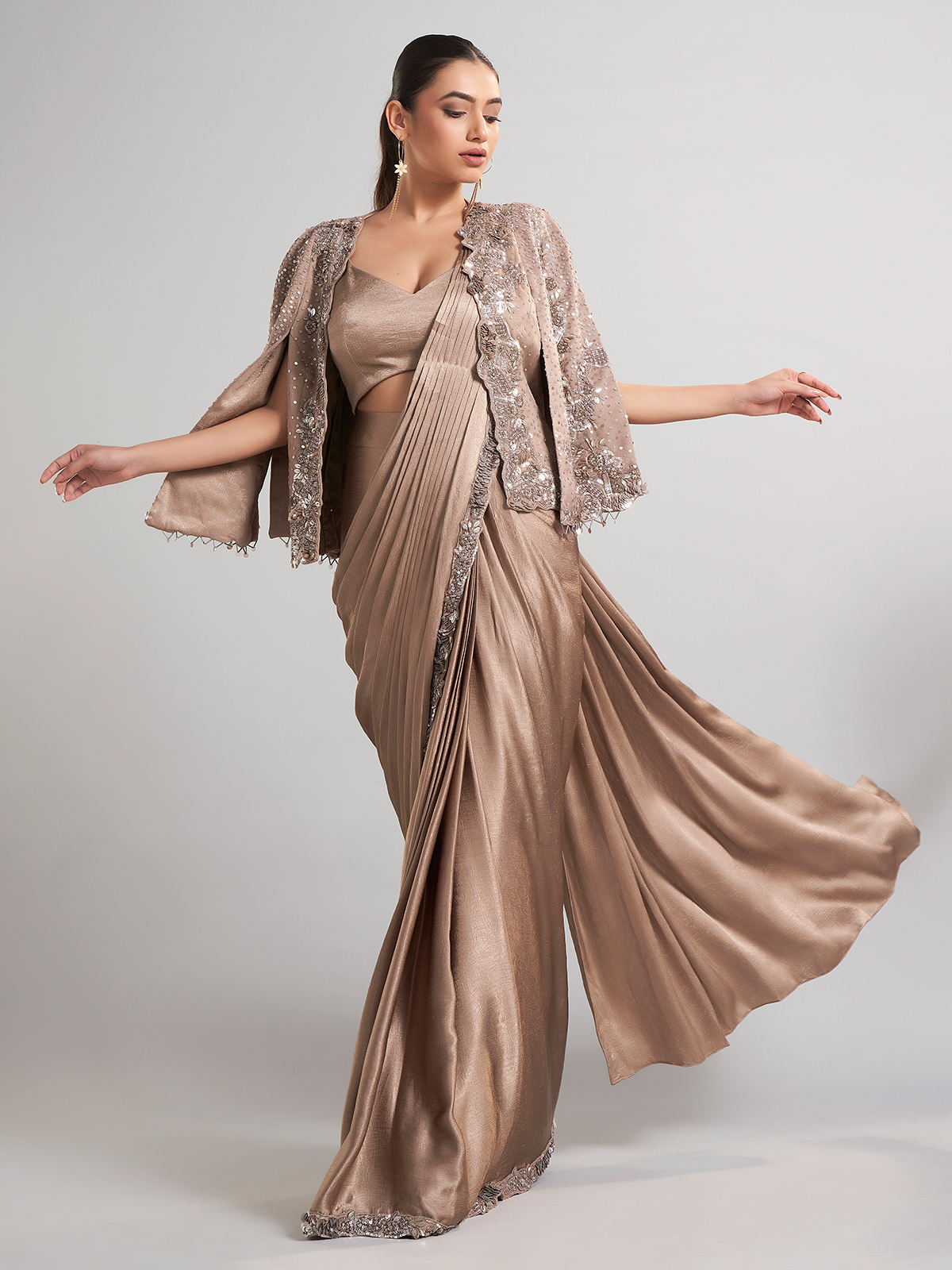 Redefine luxury in this beige satin silk saree, paired with a contemporary jacket-style blouse. Accentuated with cutdana, sequins, beads, and diamond work, it’s perfect for weddings, receptions, and grand festivities.