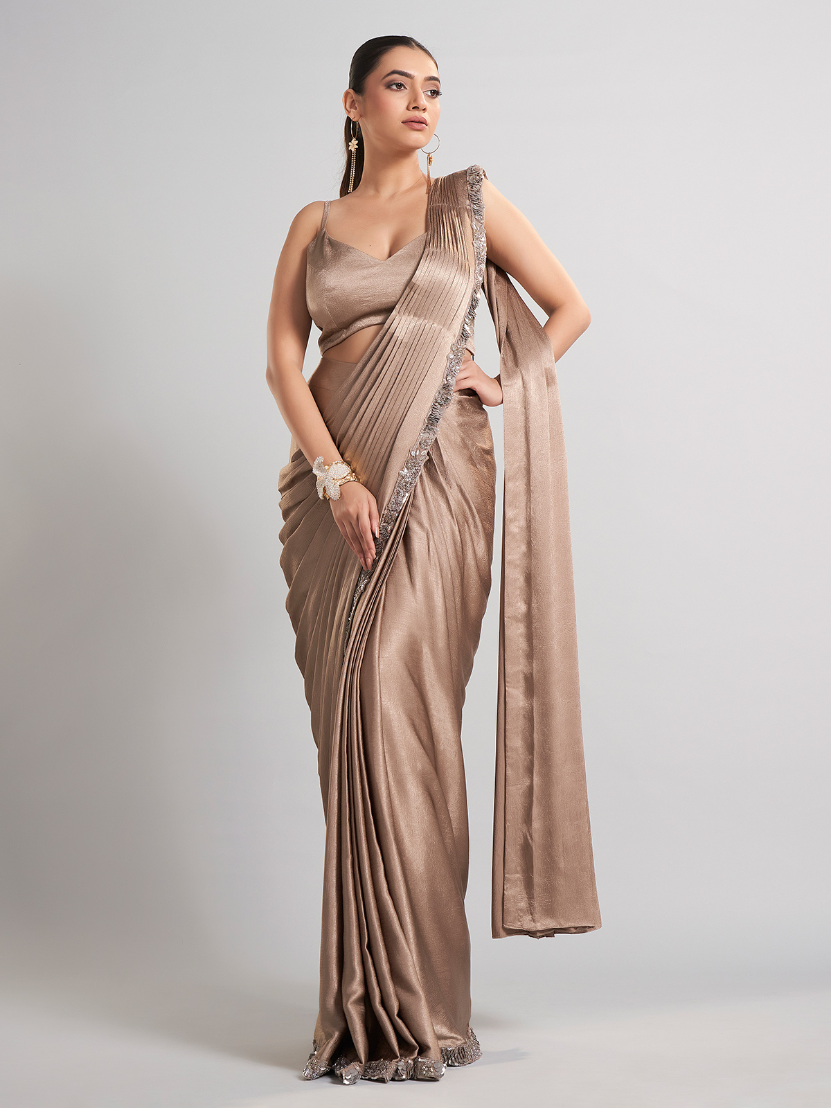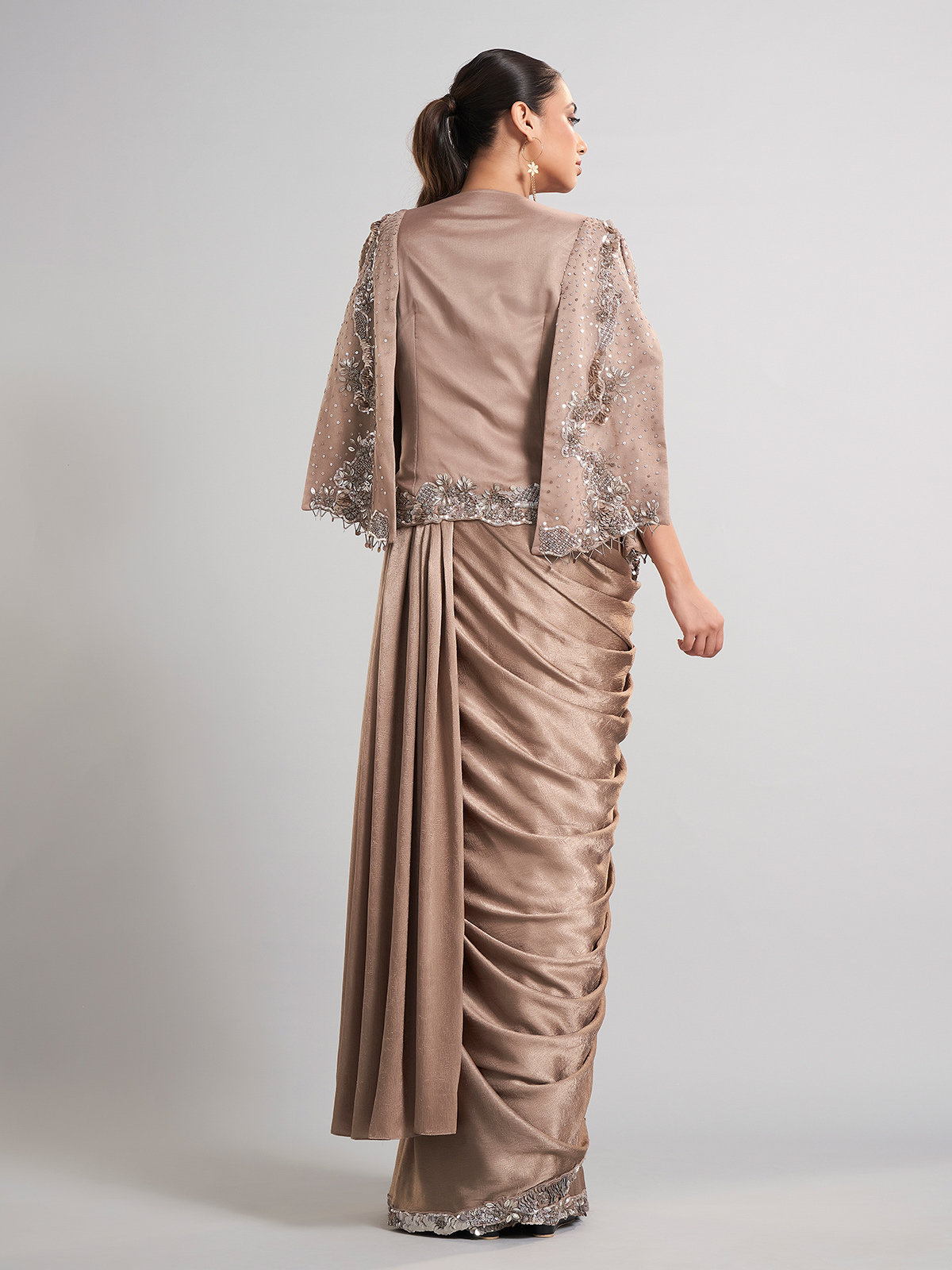 Beige Satin Silk Jacket Style Designer Ready To Wear Saree