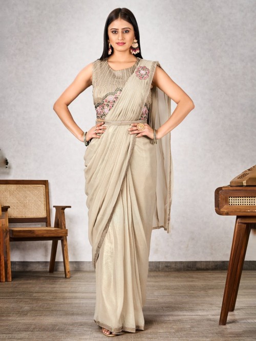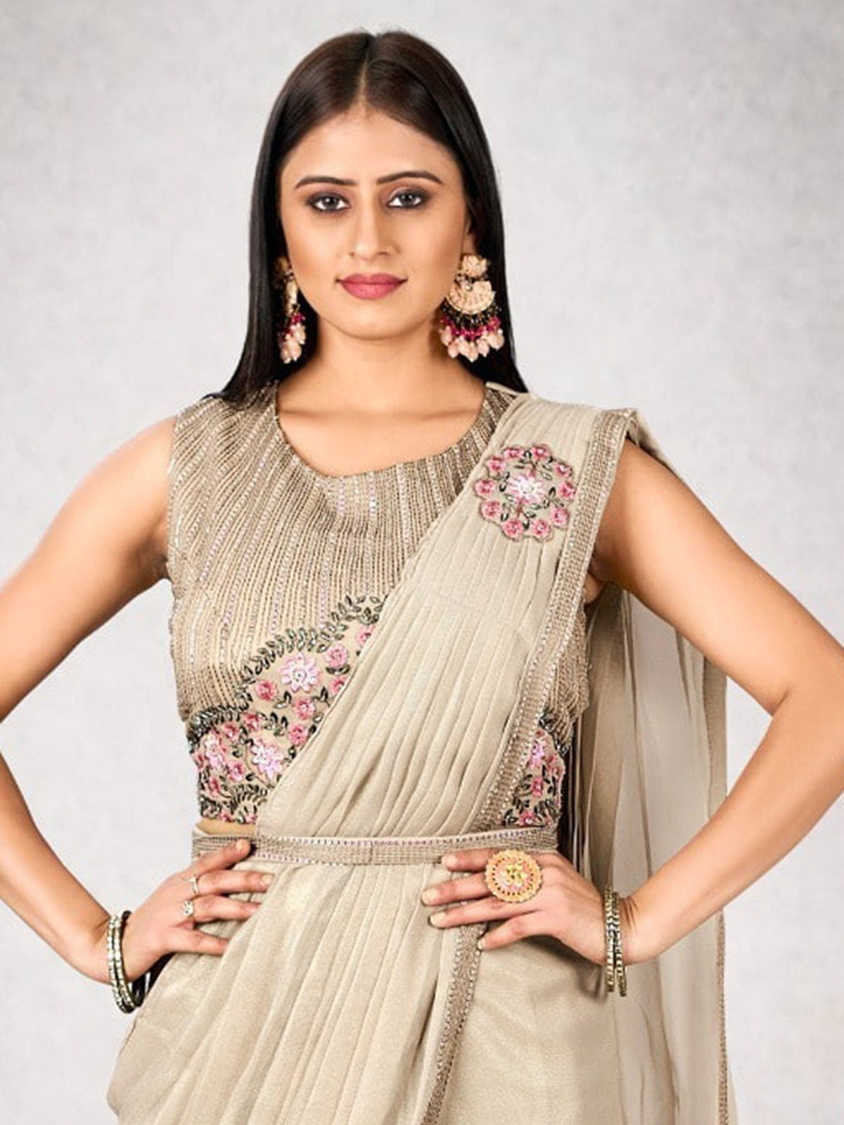 Within the fashion world, the beige shimmer georgette ready to wear saree radiates vibrant and captivating elegance. It features exquisite embroidery and sequins work. Comes with a matching ready made blouse.