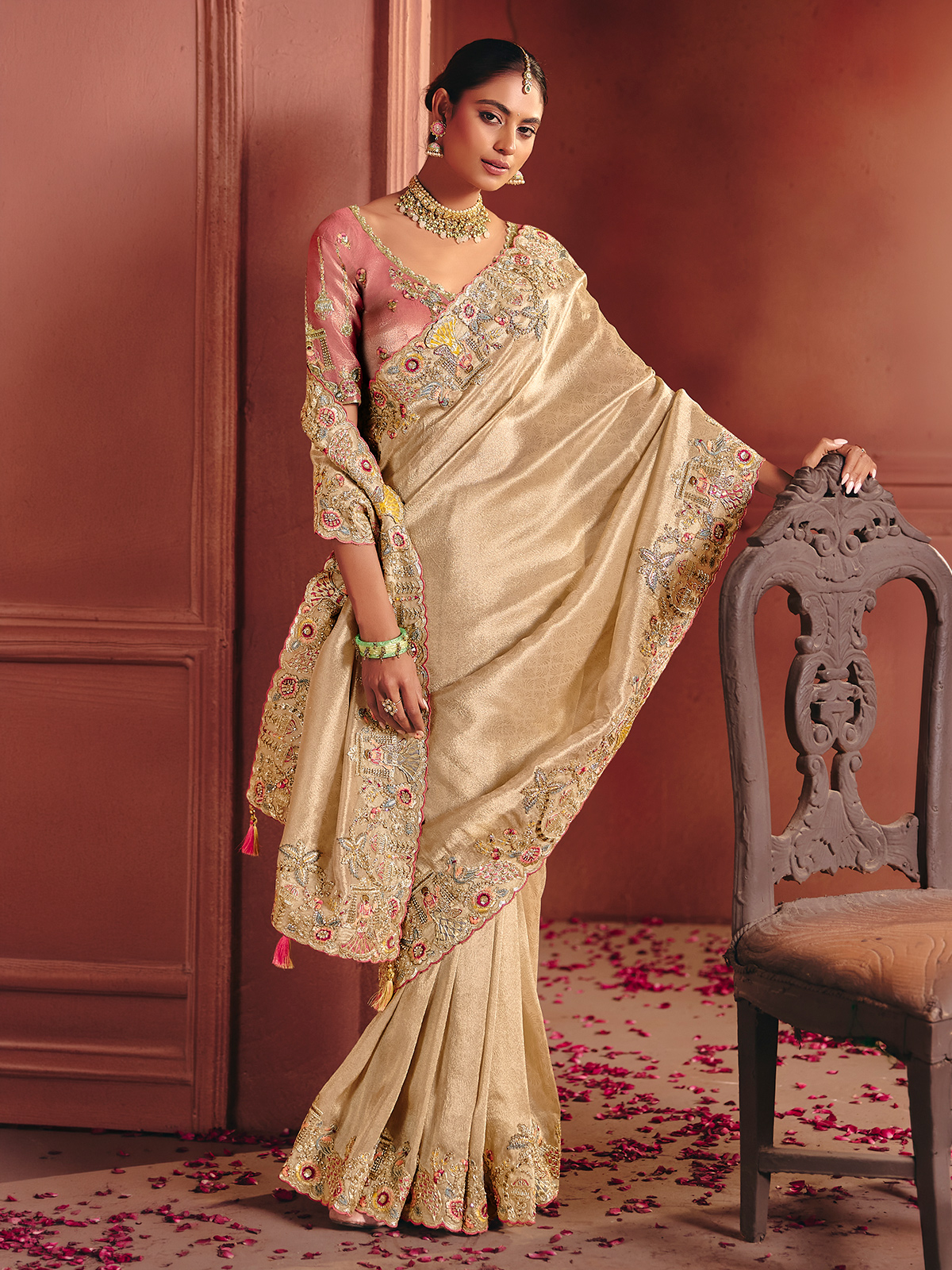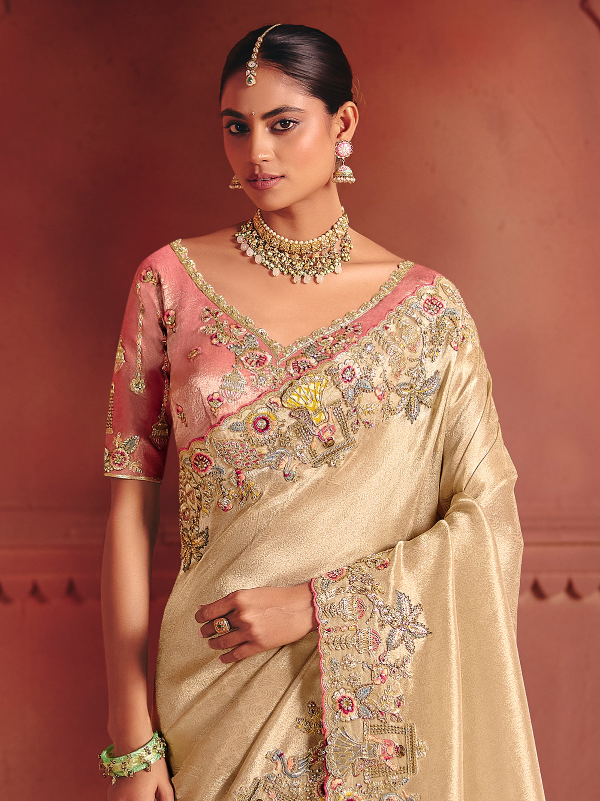 Unstitched silk blouse designed for women featuring elegant zari and zardosi work across borders. Neutral beige shade offers versatile pairing with traditional sarees. Ideal for wedding, bridal, reception, sangeet occasions. Provides comfortable fabric feel with scope for customized stitching according to personal style preferences.