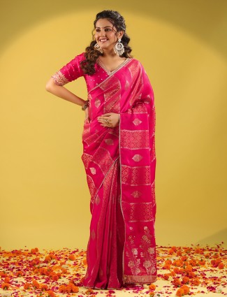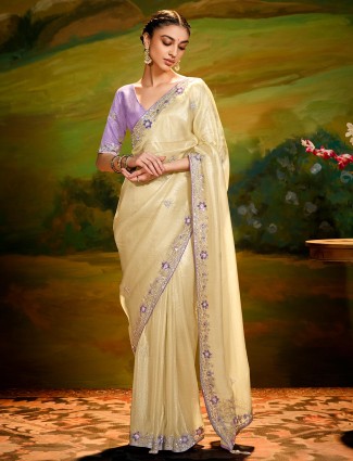 A graceful beige tissue silk saree, intricately decorated with sequins and resham threadwork, offering a festive appeal. Comes with an unstitched blouse piece for perfect tailoring.