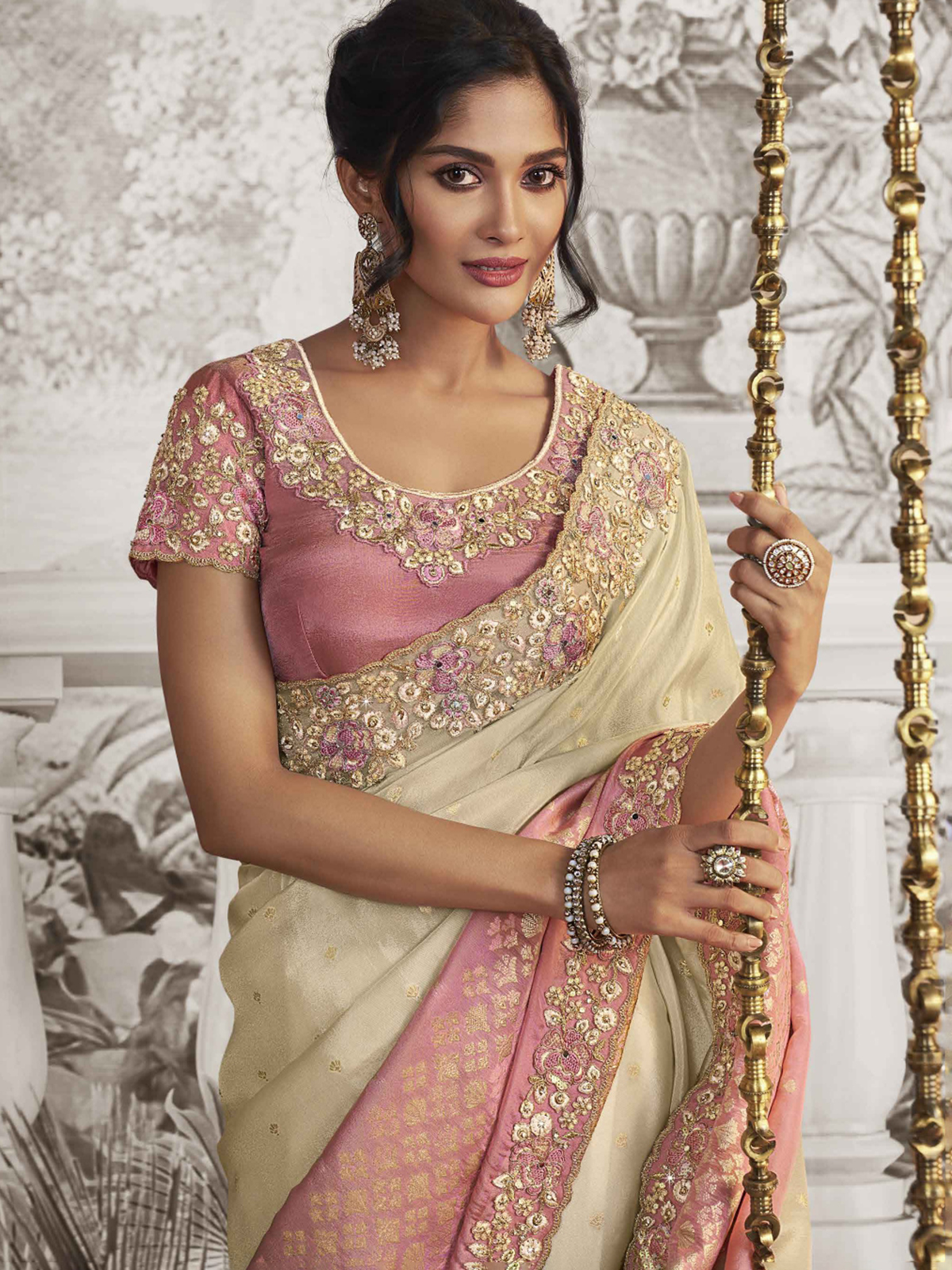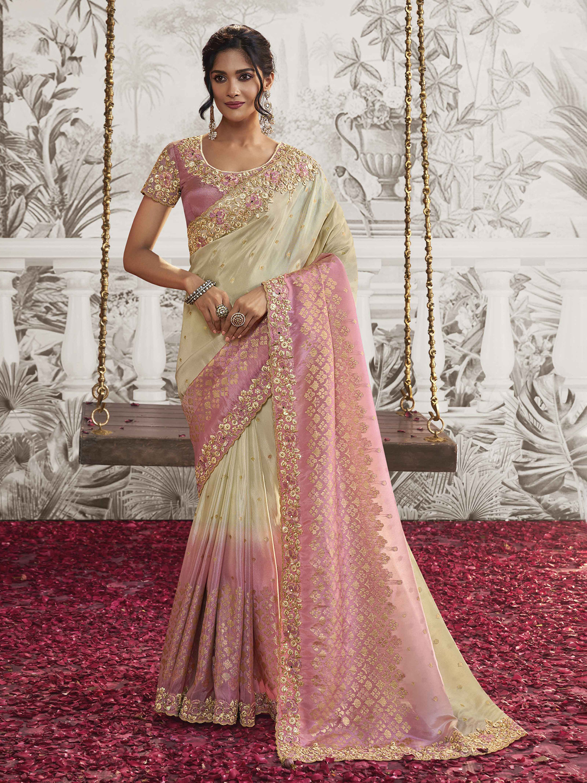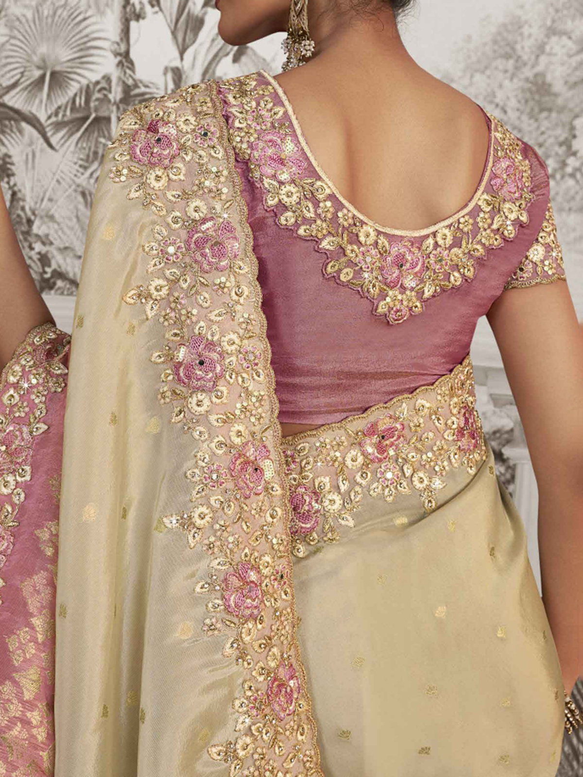 Opt for understated opulence with this shaded beige silk saree, finely crafted with zari and an eye-catching border of sequins, mirror, resham, stones, and embroidery. A complementary embellished blouse completes this stunning pick for weddings and grand festivities.