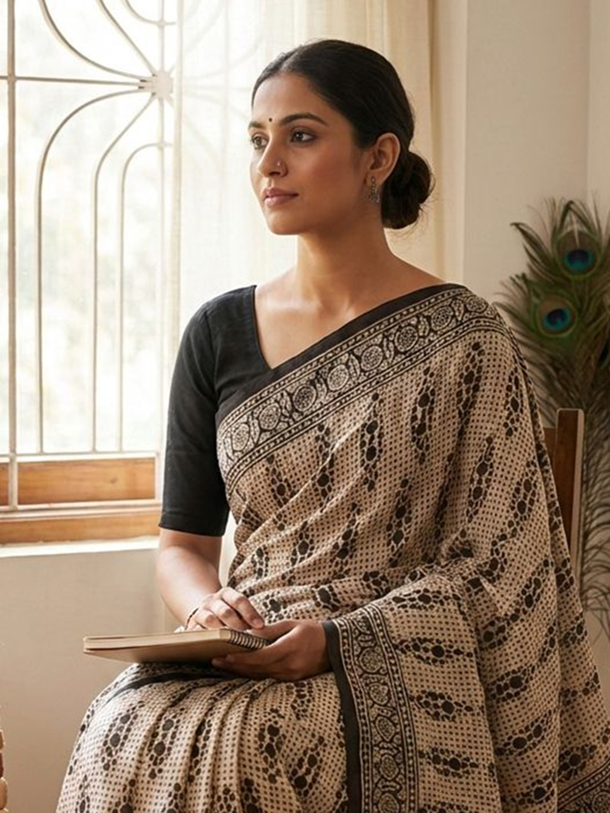 Reflecting effortless grace, this beige muslin saree carries a soothing festive charm with classic elegance. Designed with elegant ethnic printed patterns that enhance its subtle beauty. Ideal for festive wear, it is paired with an unstitched blouse piece, allowing comfortable and versatile styling.