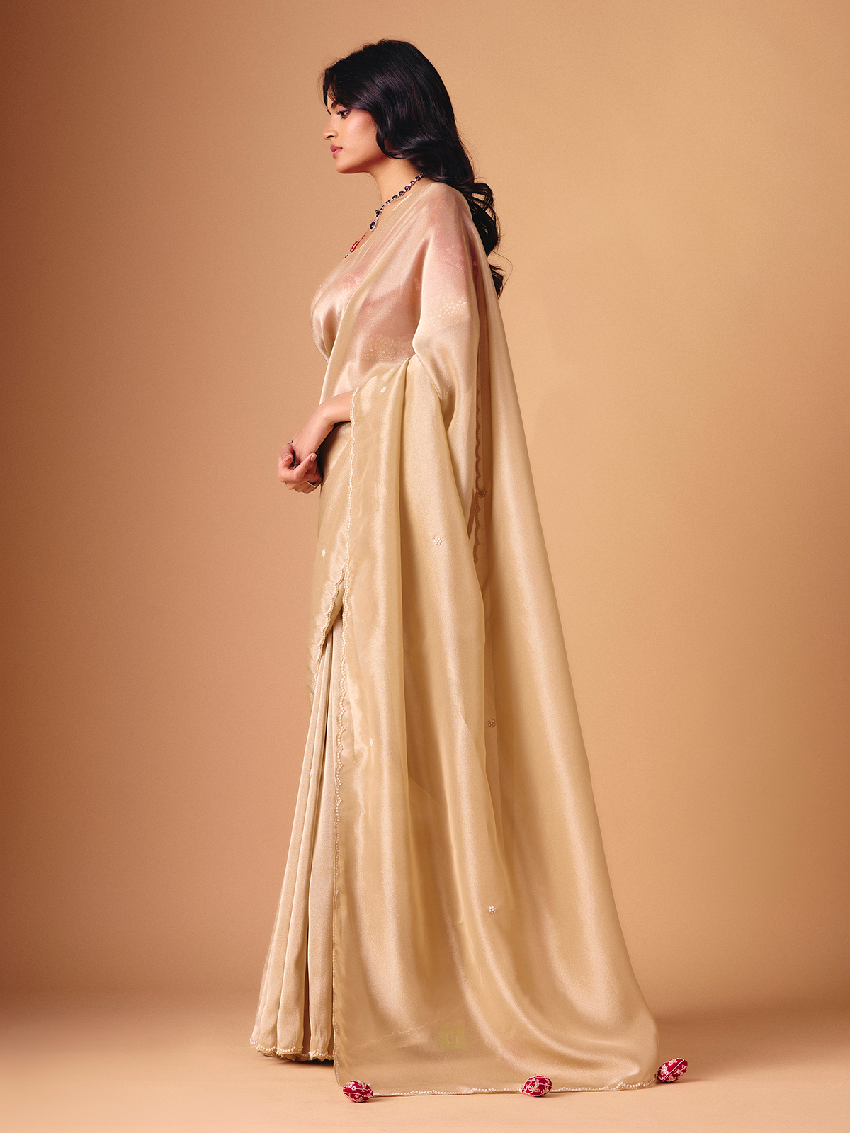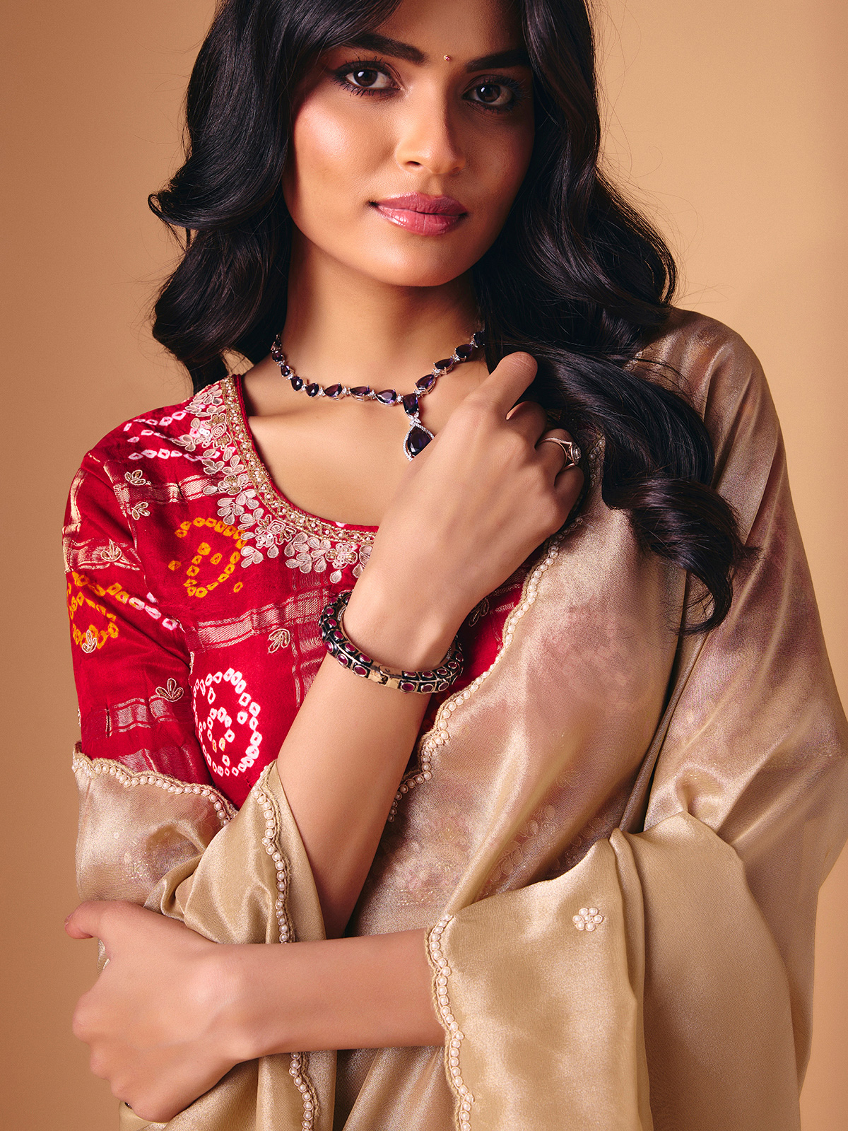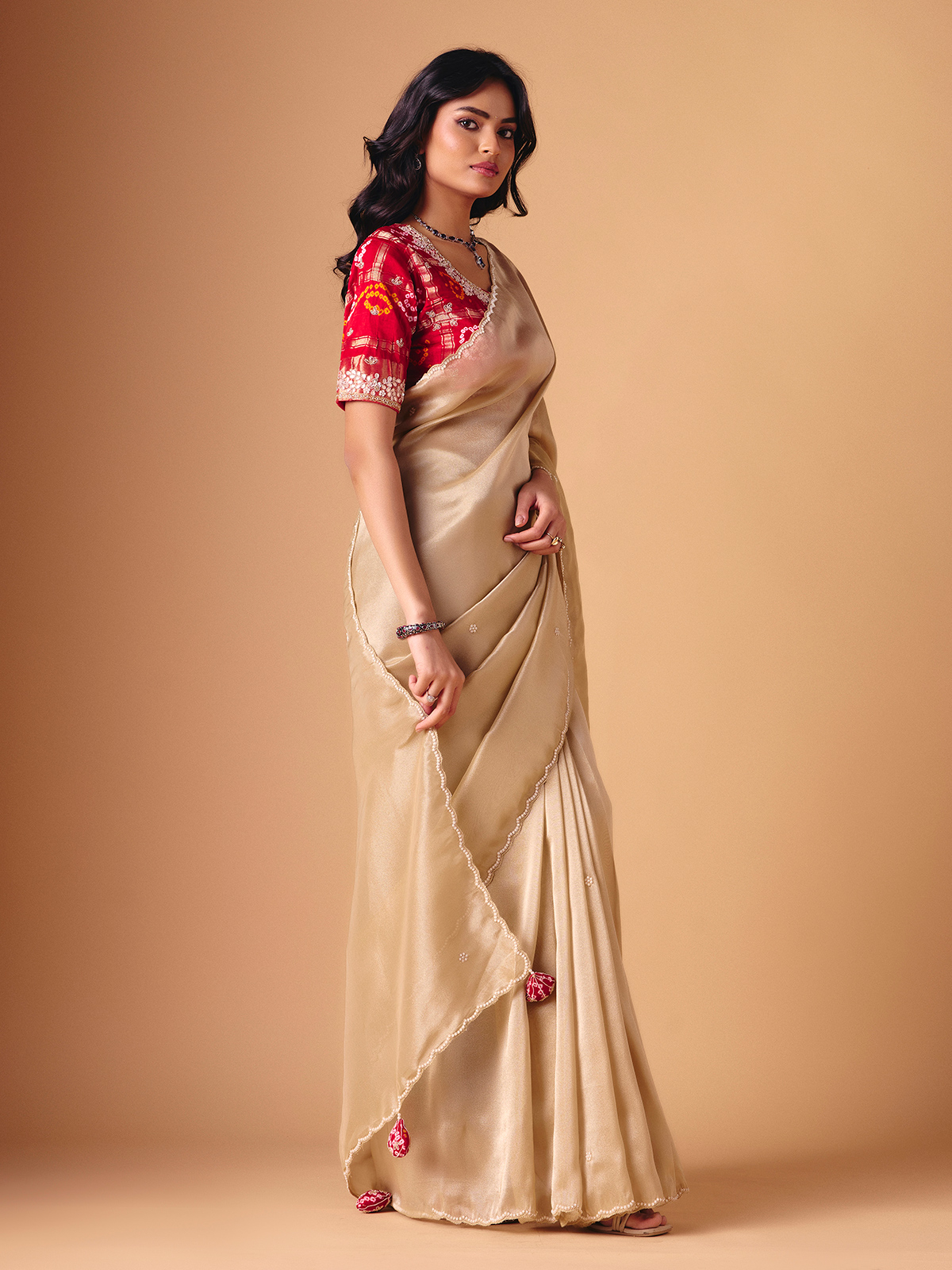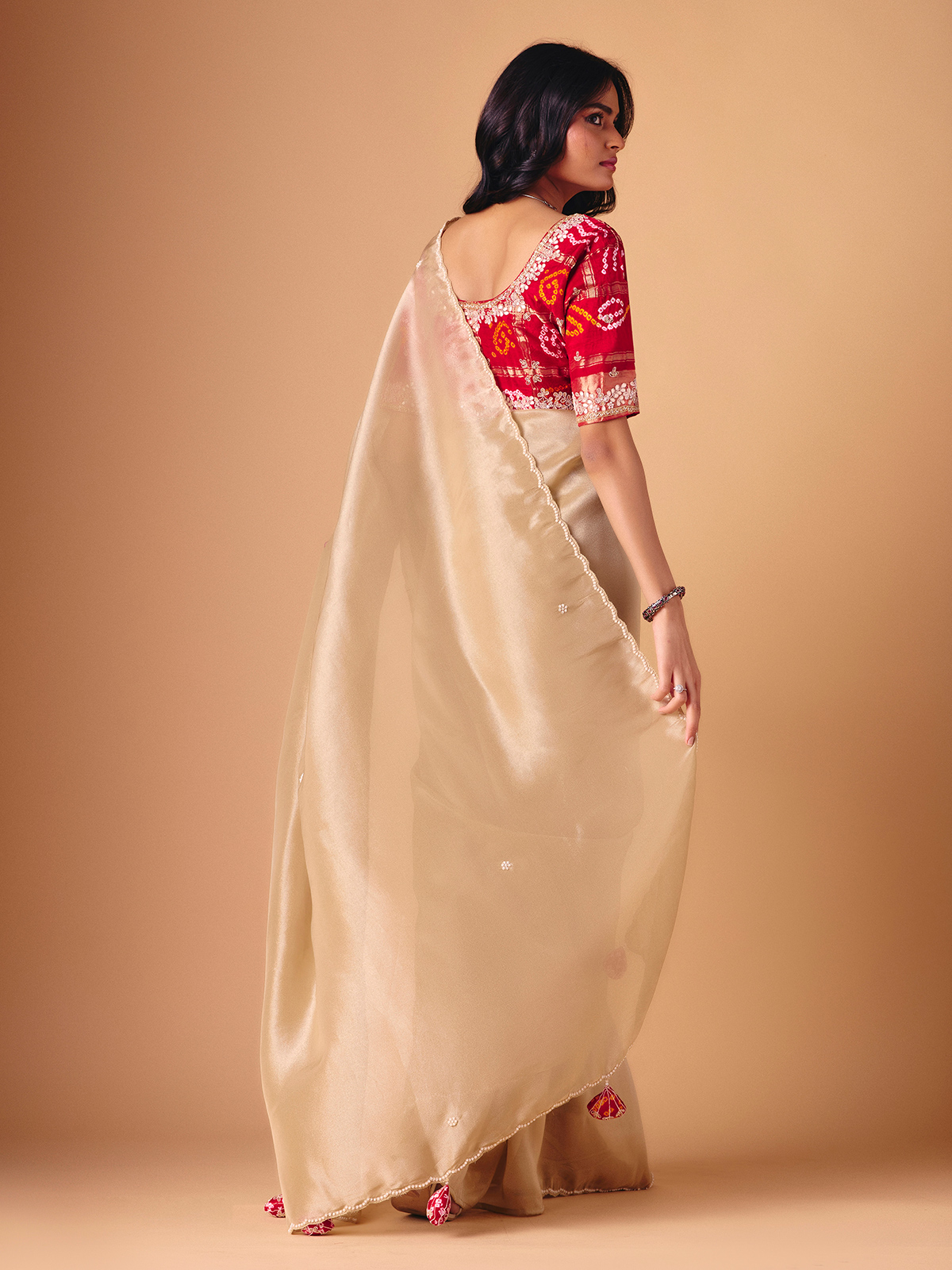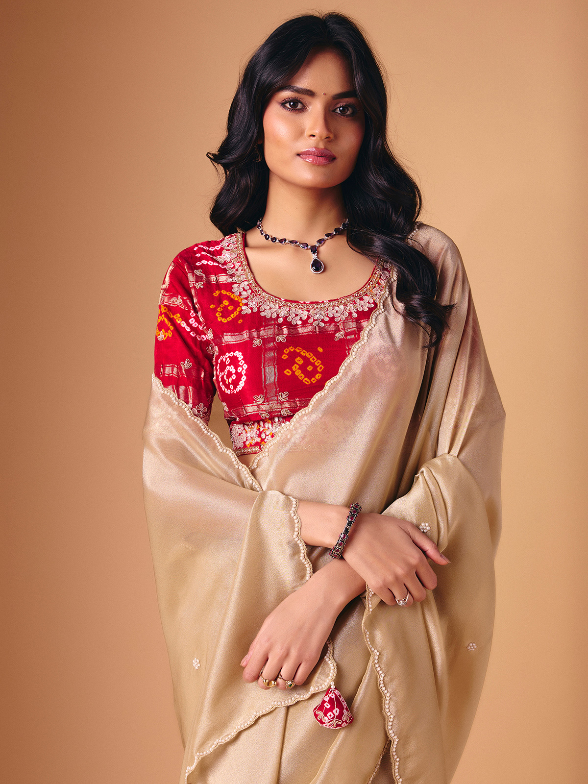 This beige tissue silk saree with features delicate cutdana, zardosi, pearl, sequin and gota embellishments. Paired with a bandhej printed ready made blouse, it creates a subtle yet luxurious festive look ideal for weddings, receptions and traditional celebrations.