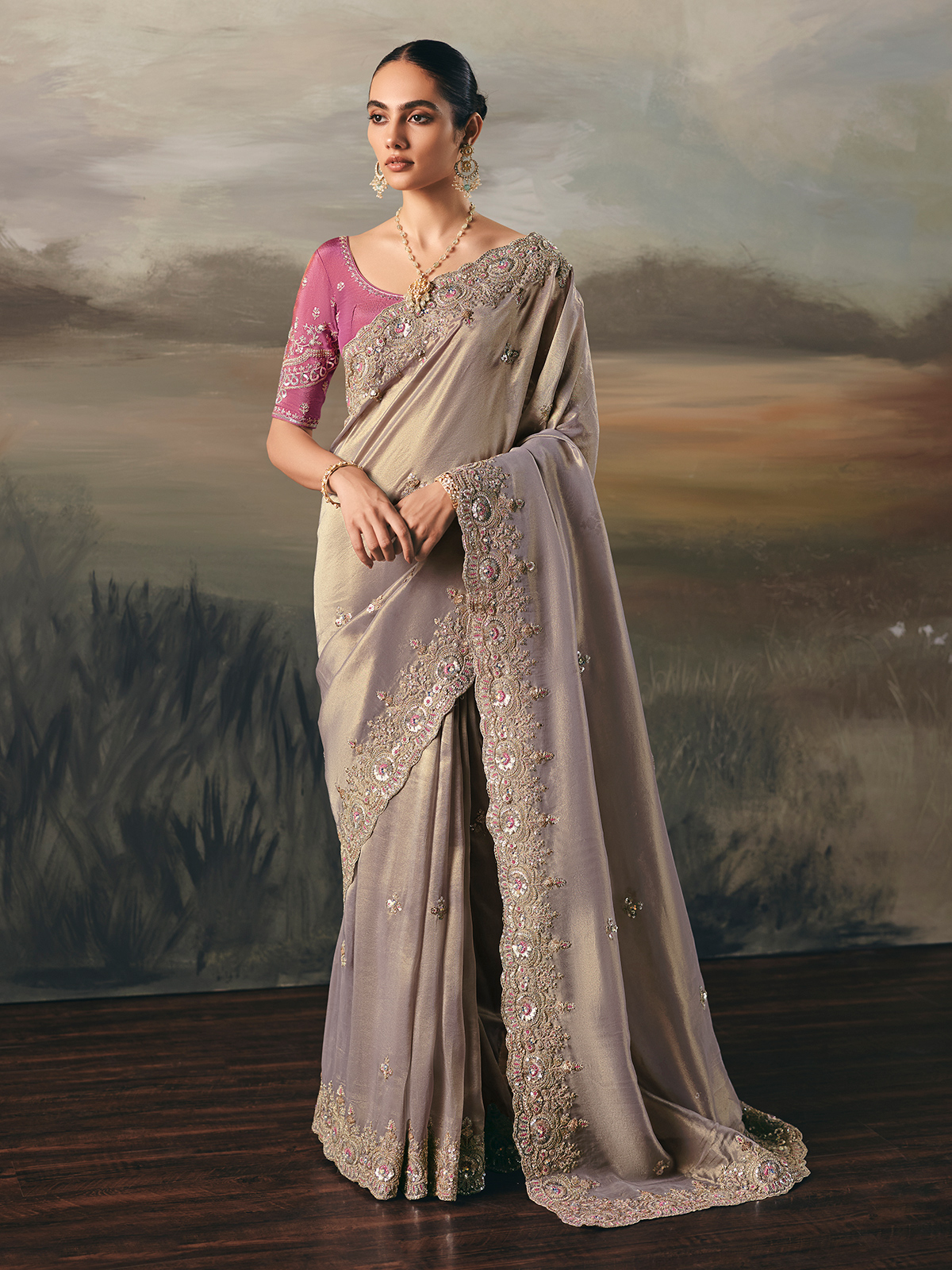 Rendered in refined beige tissue silk, this saree carries a soft grand allure with its smooth, luminous texture. The delicate blend of resham, beads and sequins creates intricate shimmering depth that elevates the look. Paired with an unstitched blouse, it suits festivals, wedding occasions, upscale receptions and special celebrations.