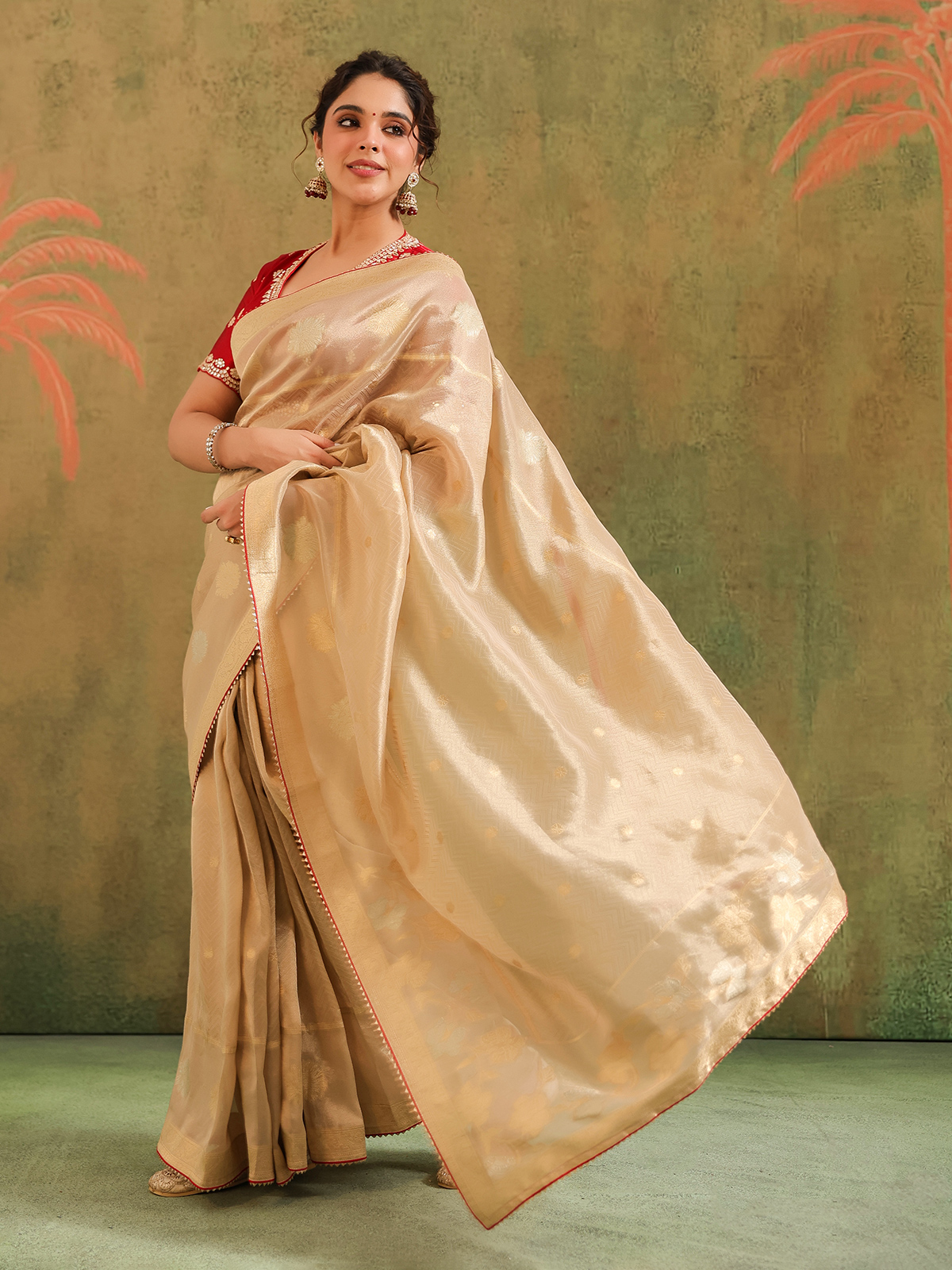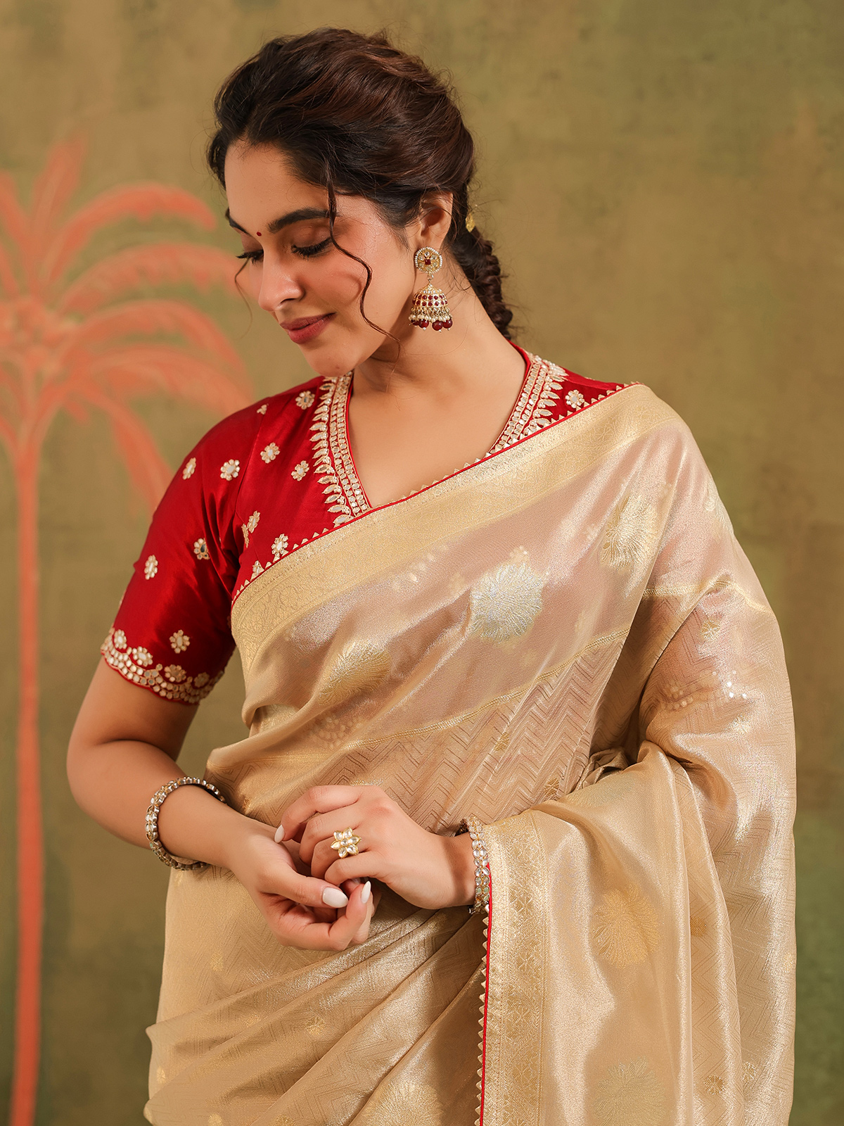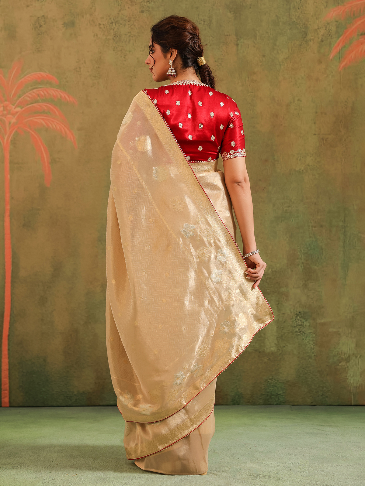 Beige Zari Worked Silk Saree With Maroon Blouse For Women