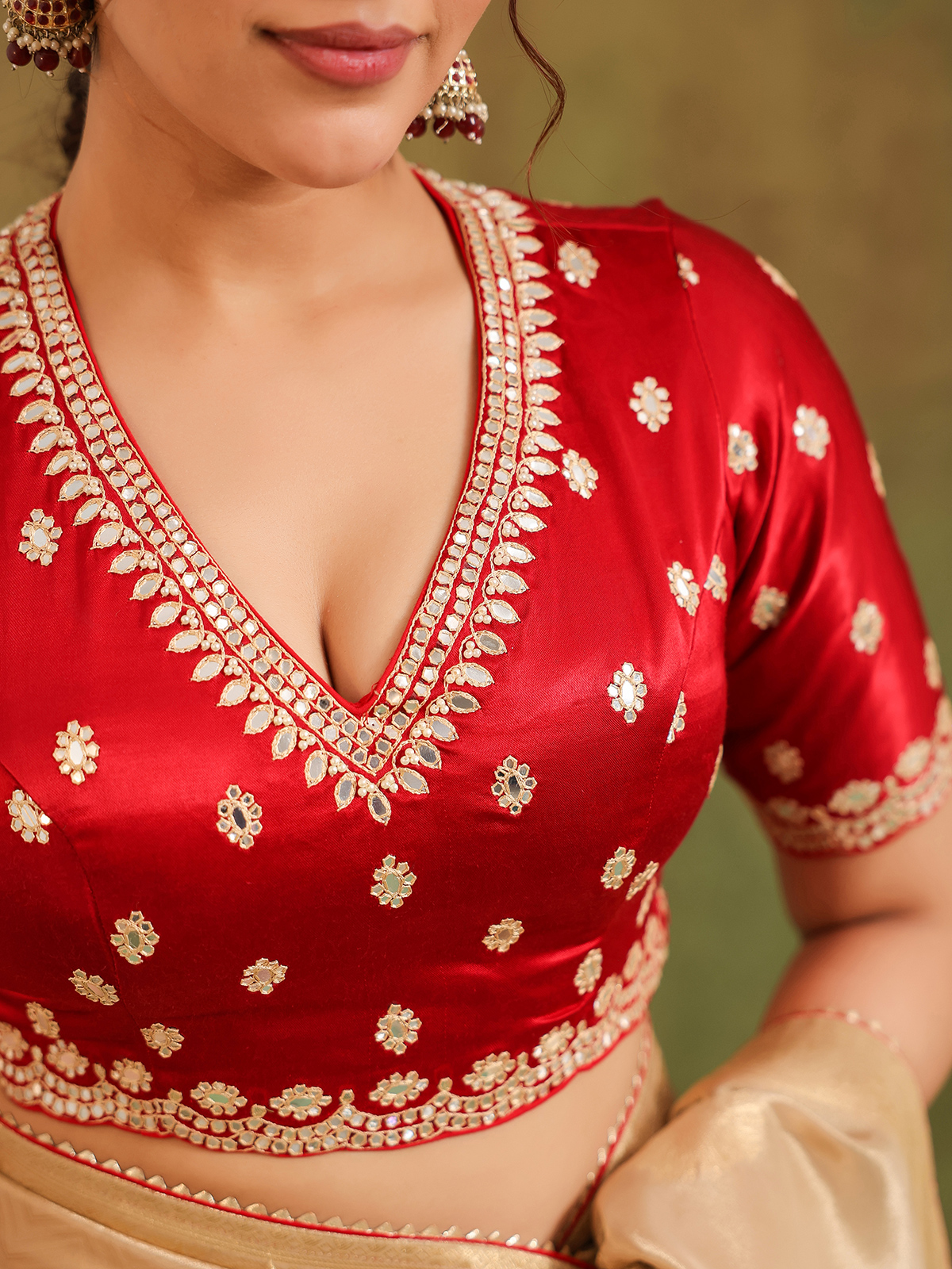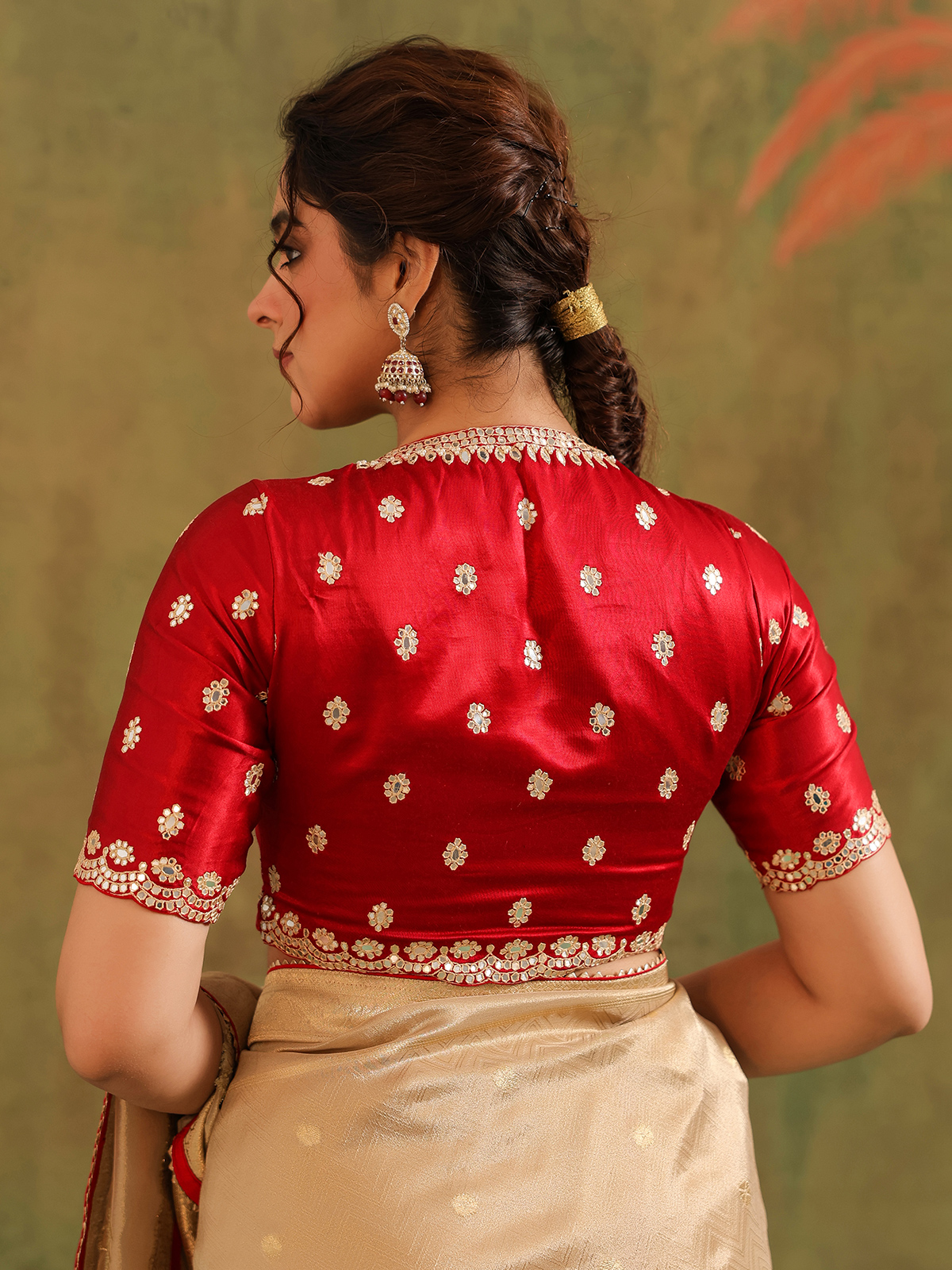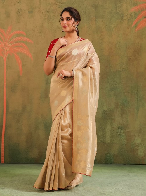 Timeless beige silk radiates classic charm, with zari, mirror, and beads tracing motifs that sparkle gently across the fabric. Comes with a maroon unstitched blouse piece, perfect for weddings, family celebrations, and grand festive gatherings.