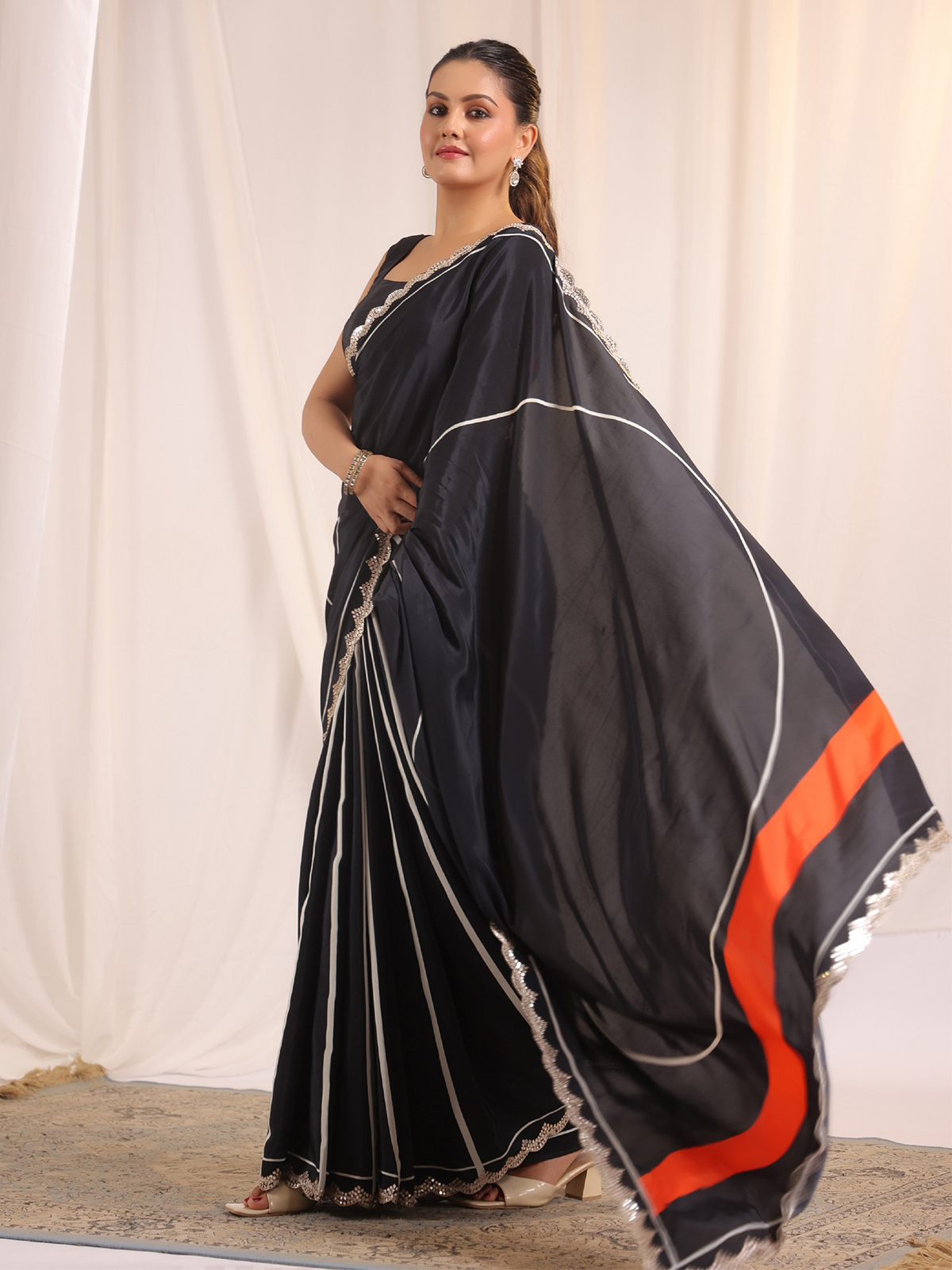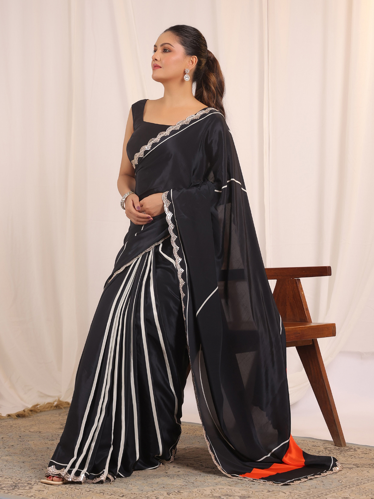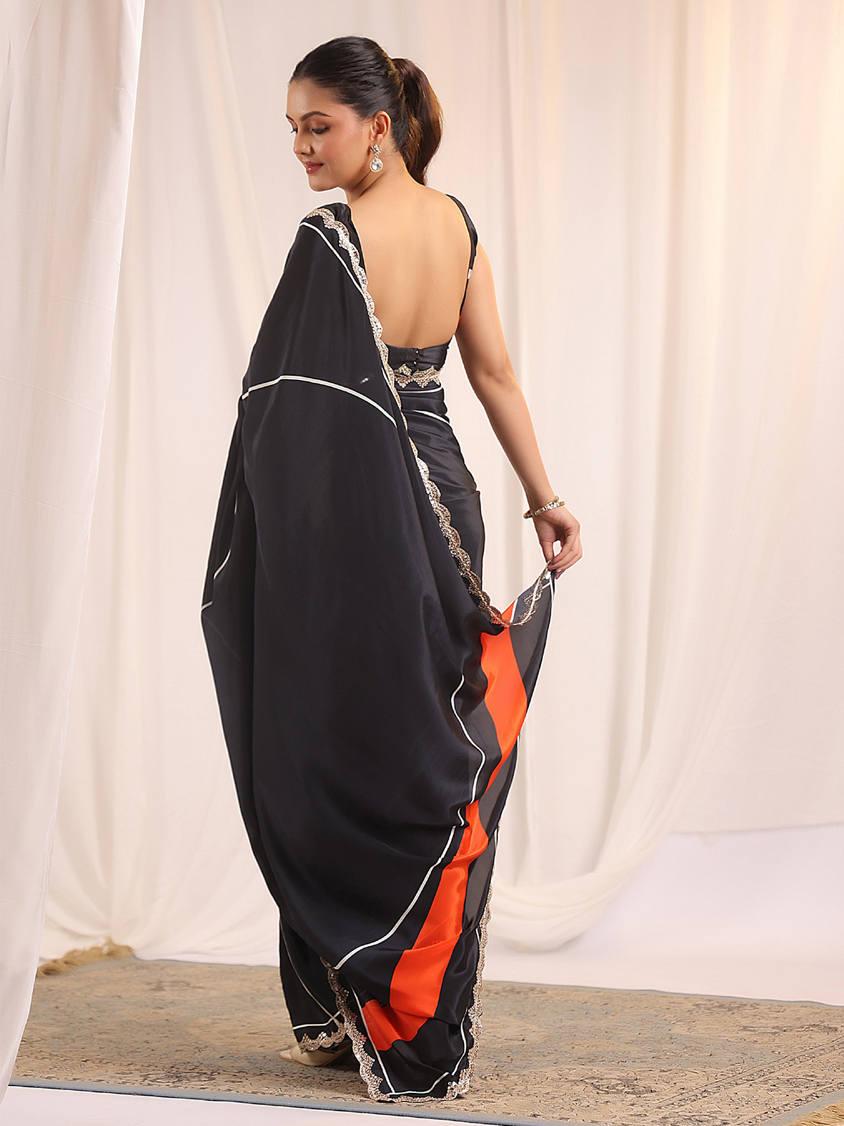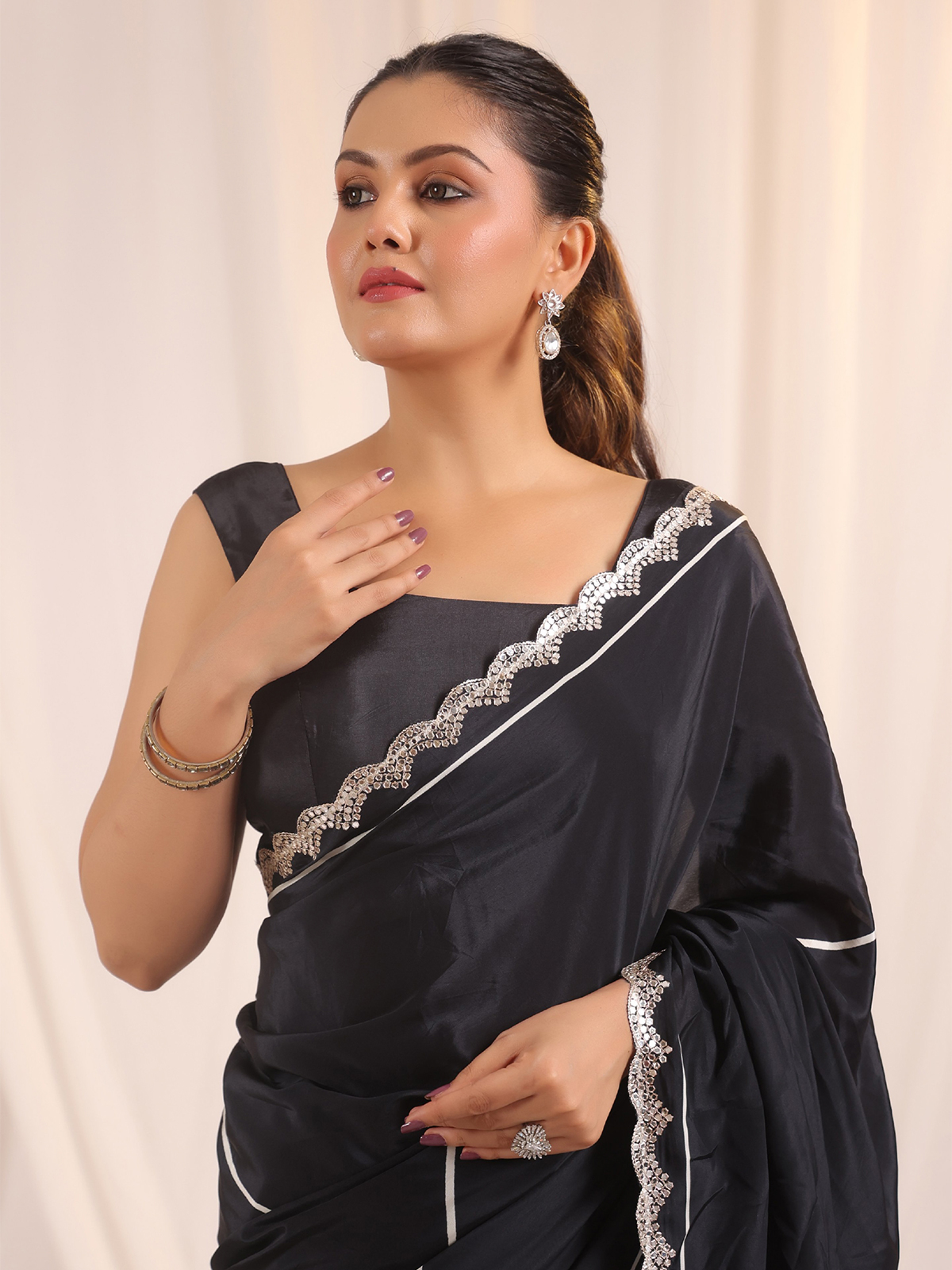 Crafted in black crepe silk, this unstitched blouse is adorned with classic aabla work and delicate prints. A perfect pick for festive evenings and party wear, it brings together heritage detailing with a chic, contemporary silhouette.