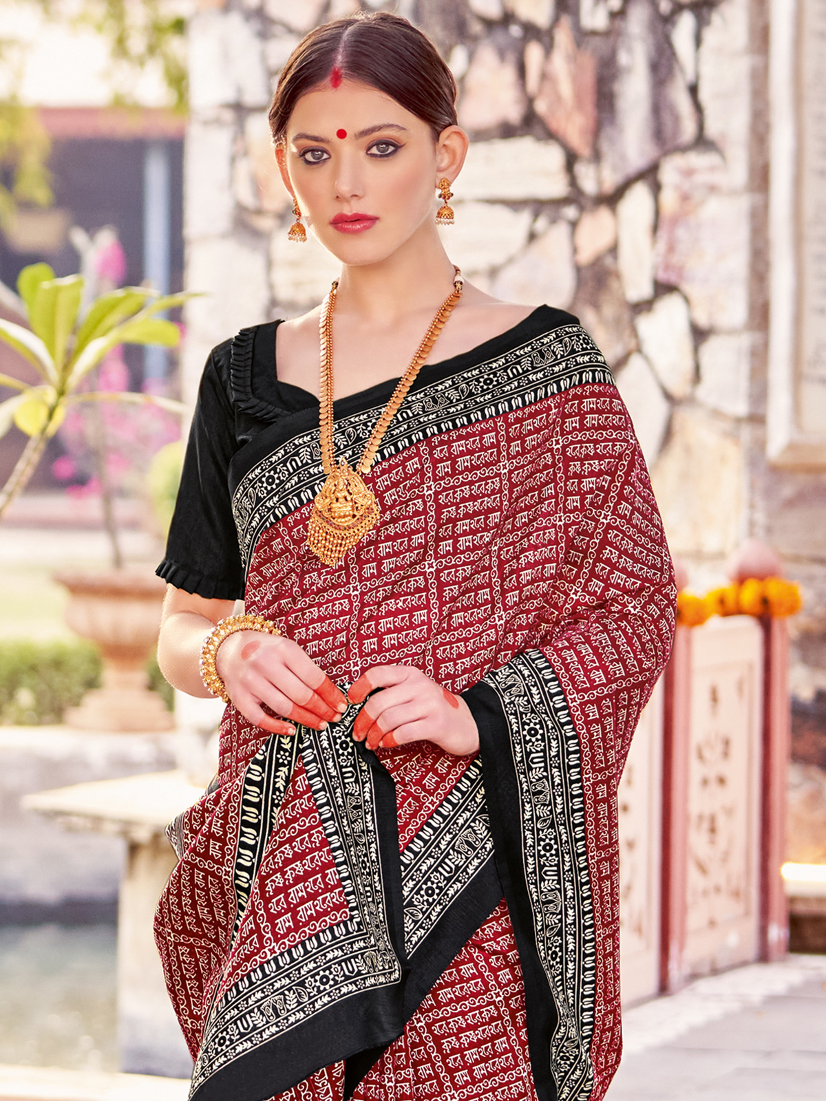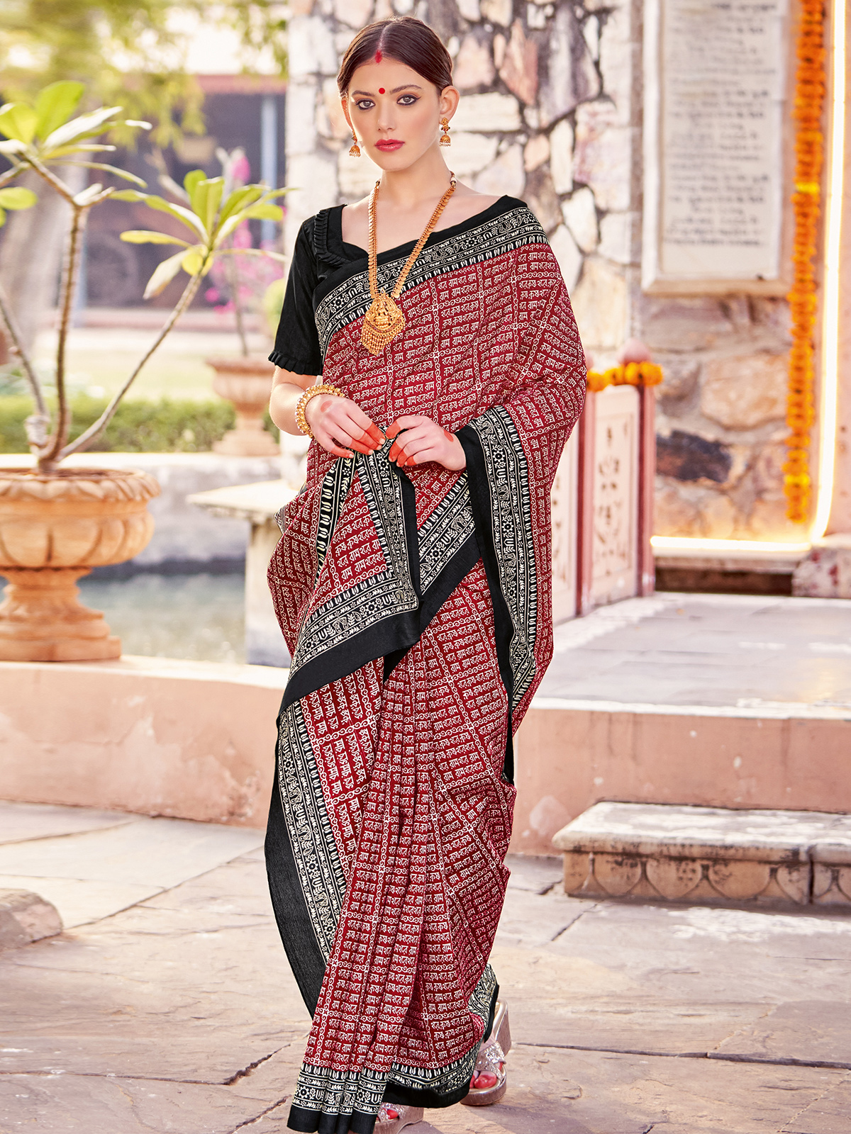 Black And Maroon Printed Bhagalpuri Silk Saree For Women