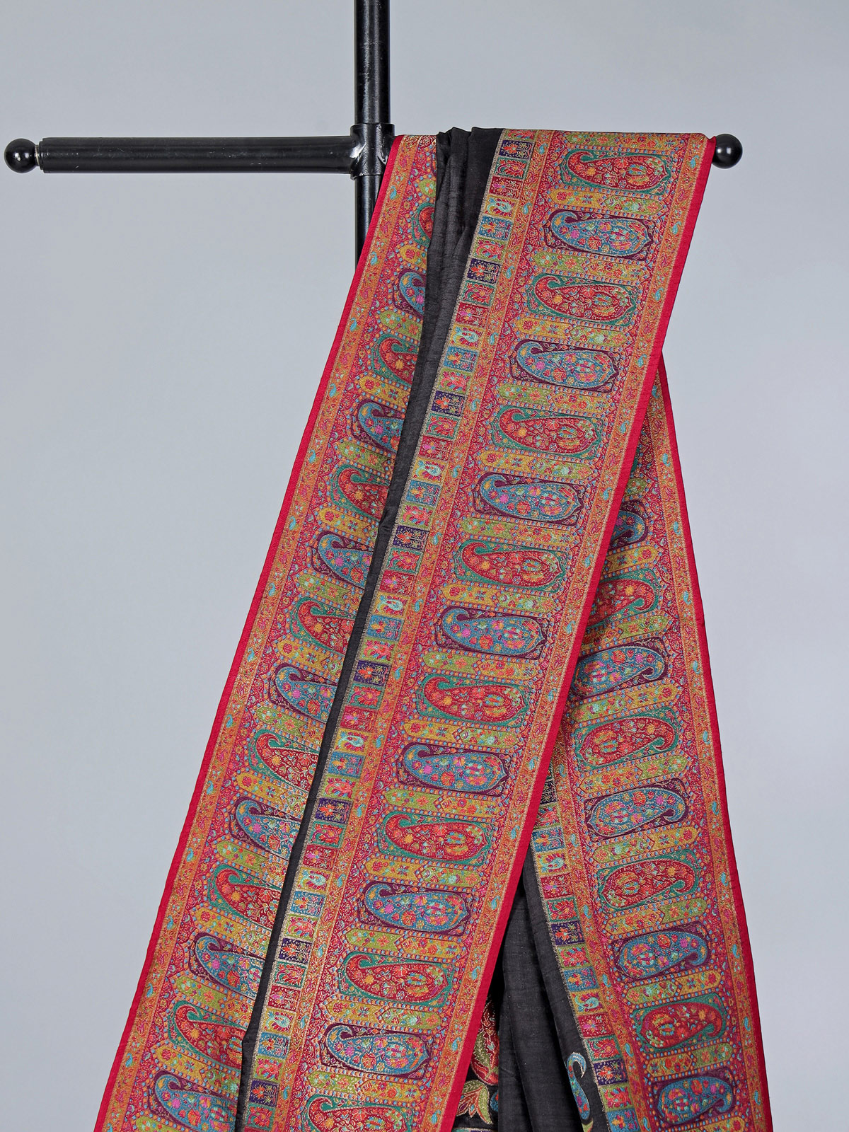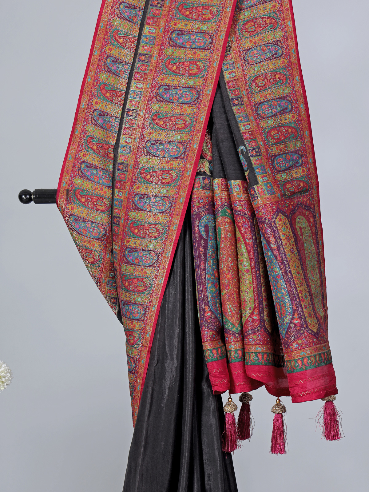 This black art pasmina silk saree features rich embroidery, thread, and zari work, highlighted by a wide contrasting red border and an elaborate pallu adorned with multicolored ethnic and paisley-inspired motifs. Paired with an unstitched blouse, it is perfect for weddings, sangeet, receptions, and festive occasions.