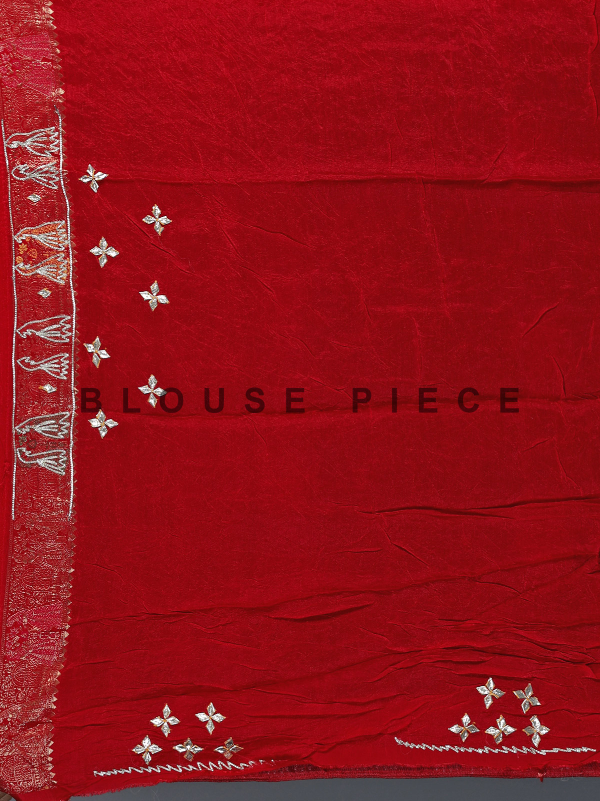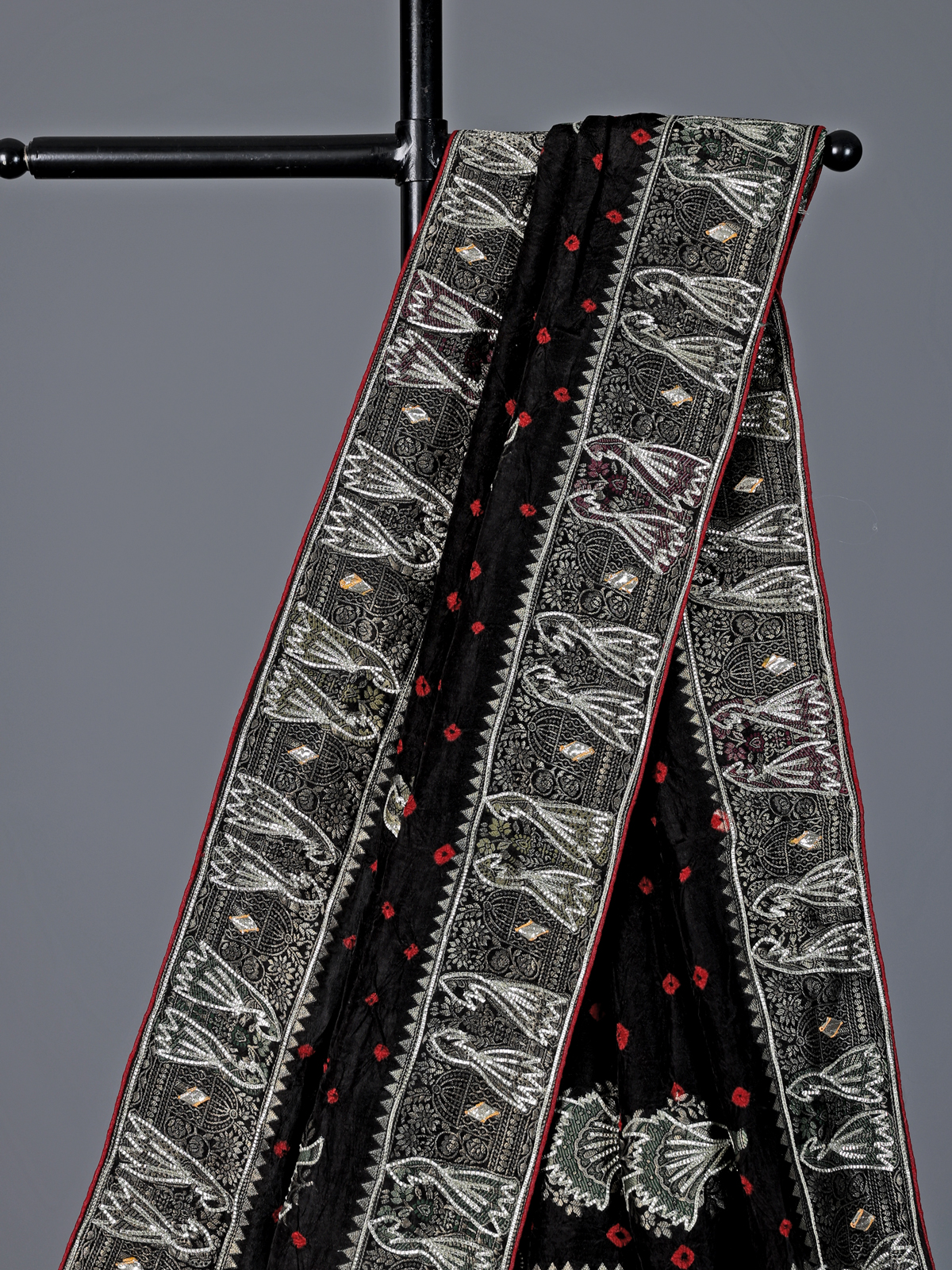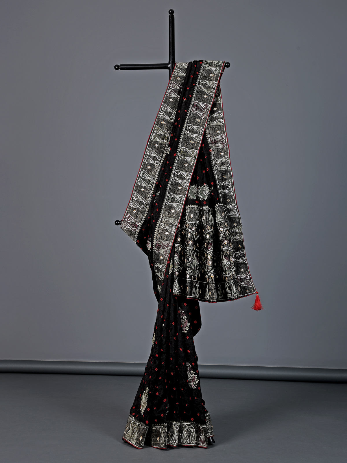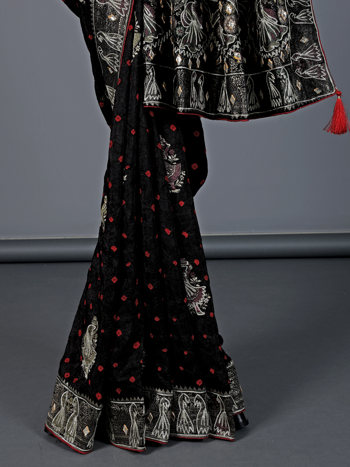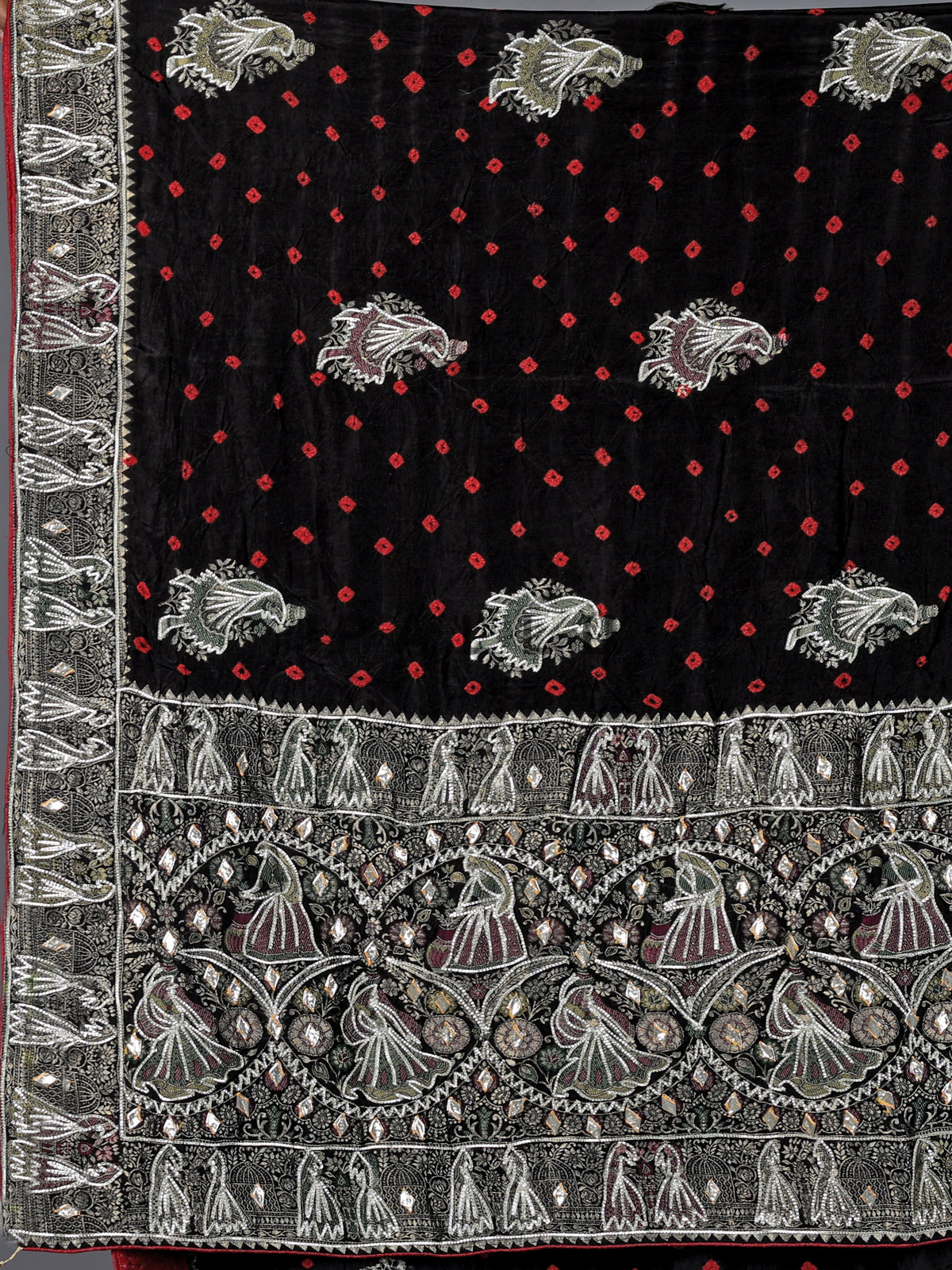 Bold and striking black bandhej silk saree offers a dramatic festive appeal. The intricate print enhanced with gota and zari work creates a captivating look. Ideal for weddings and evening celebrations. It includes an unstitched blouse piece for elegant customization.