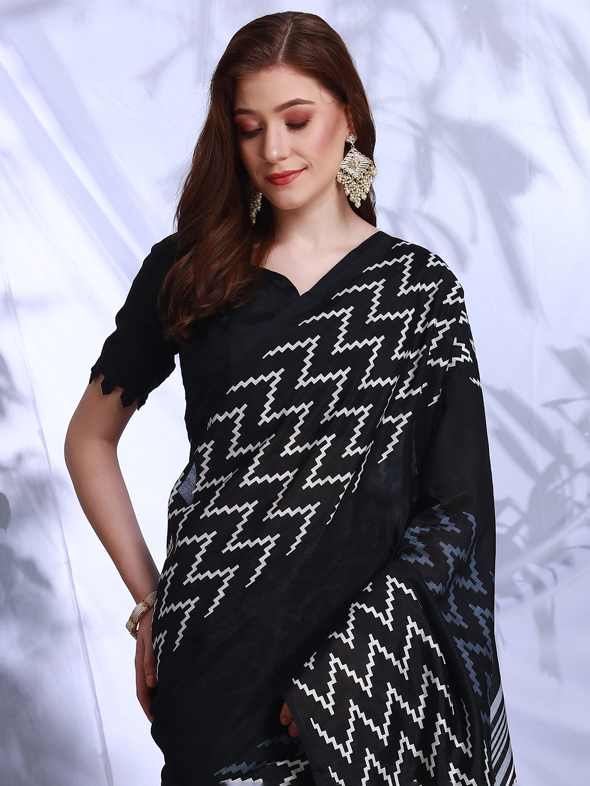 Drape yourself in elegance with this black Bhagalpuri silk saree. Made from rich, luxurious fabric and featuring a fashionable zig zag print, it delivers a chic and graceful appearance. Includes an unstitched blouse piece for a tailored fit.