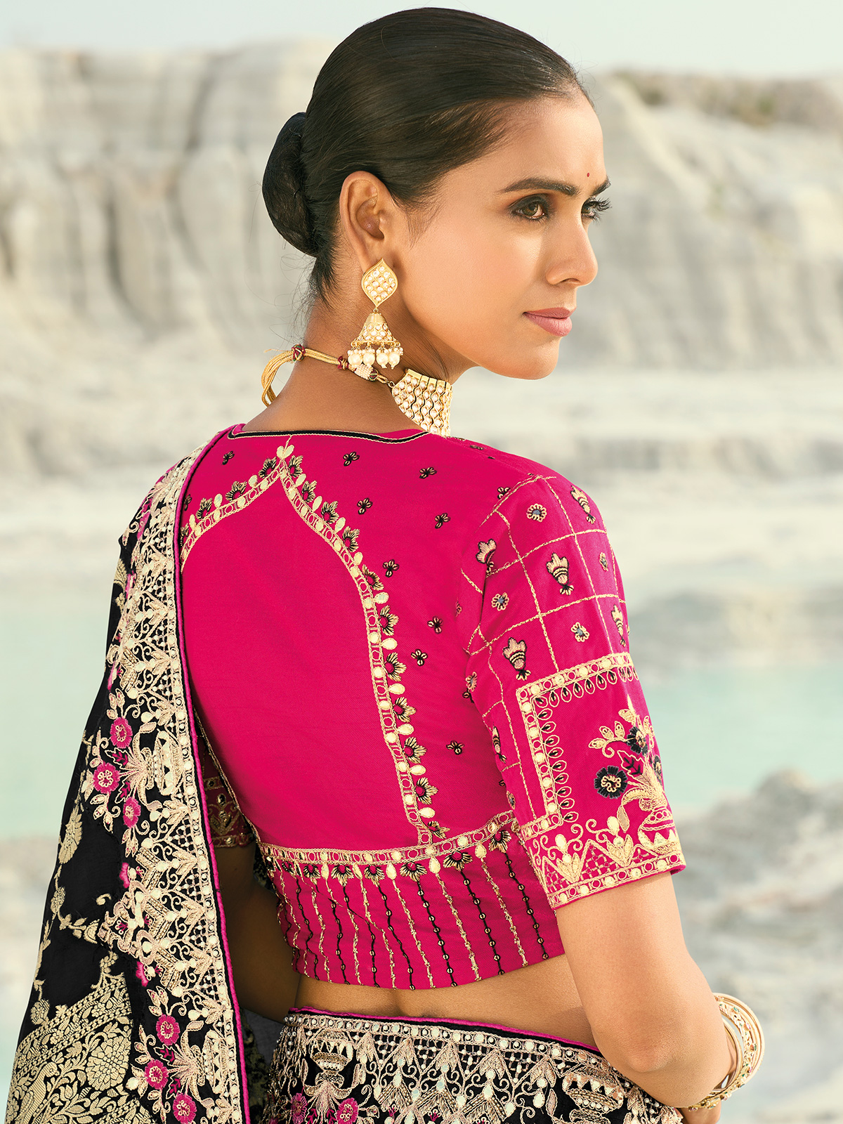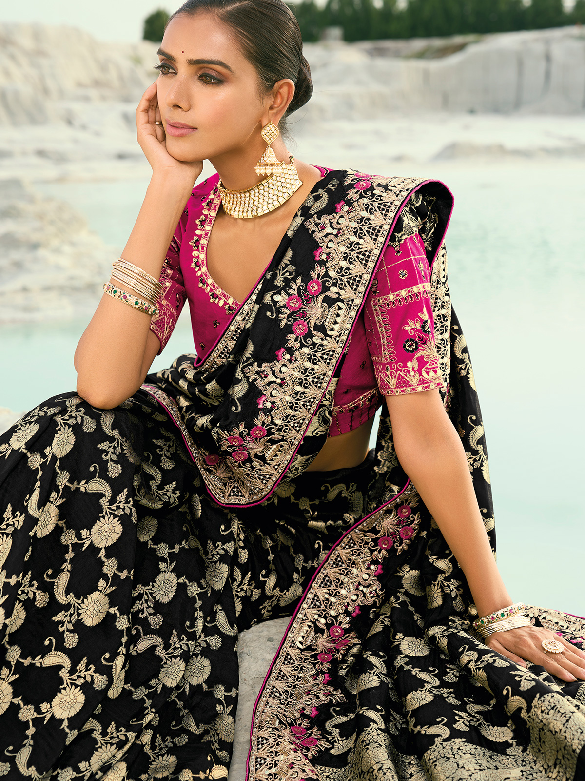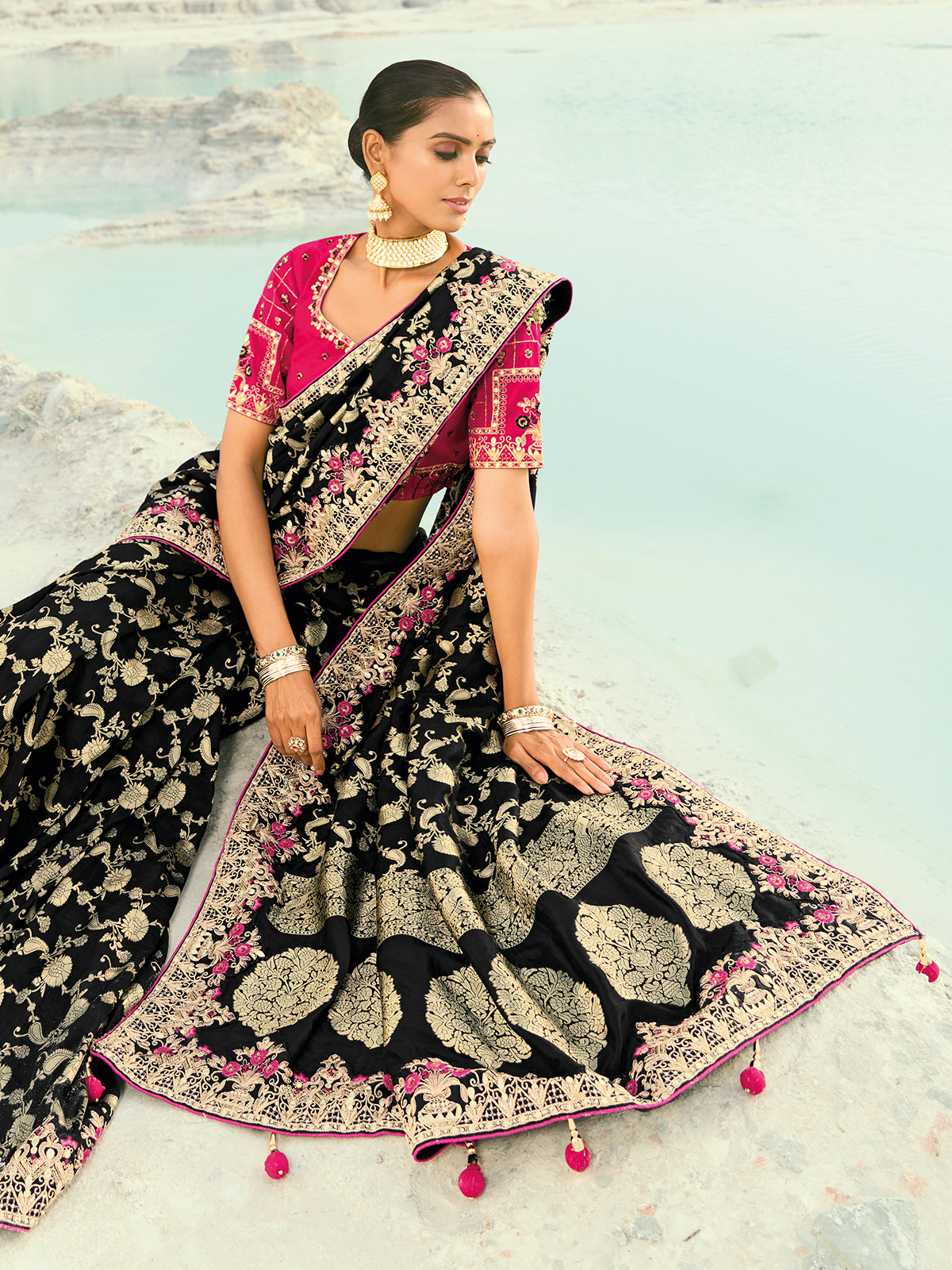 In deep black dola viscose, this saree sparkles with resham, thread, sequins, and zari detailing. The smooth texture and radiant sheen exude royal elegance, making it perfect for festive evenings. Includes a contrasting unstitched blouse piece.