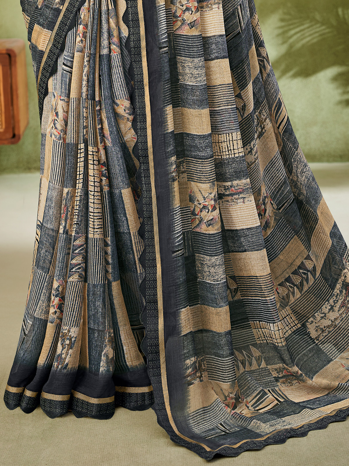 This black georgette saree features bold geometric prints complemented by a delicate lace border for understated sophistication. Lightweight and easy to style, it is paired with an unstitched blouse, suitable for casual, puja, and festive wear.