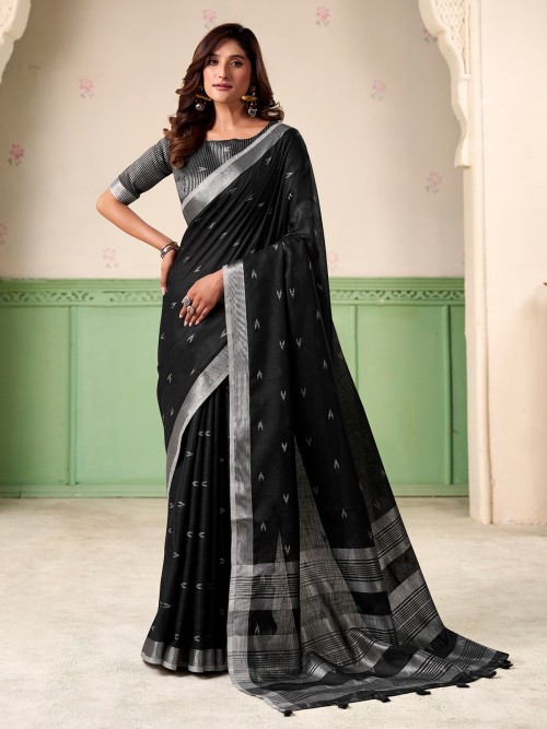This black linen silk unstitched blouse displays fine zari work and graceful tassel touches. Its subtle sheen brings elegant appeal, perfect for partywear, puja rituals, and special celebrations. Tailored to fit, it completes festive saree looks with polished ease.