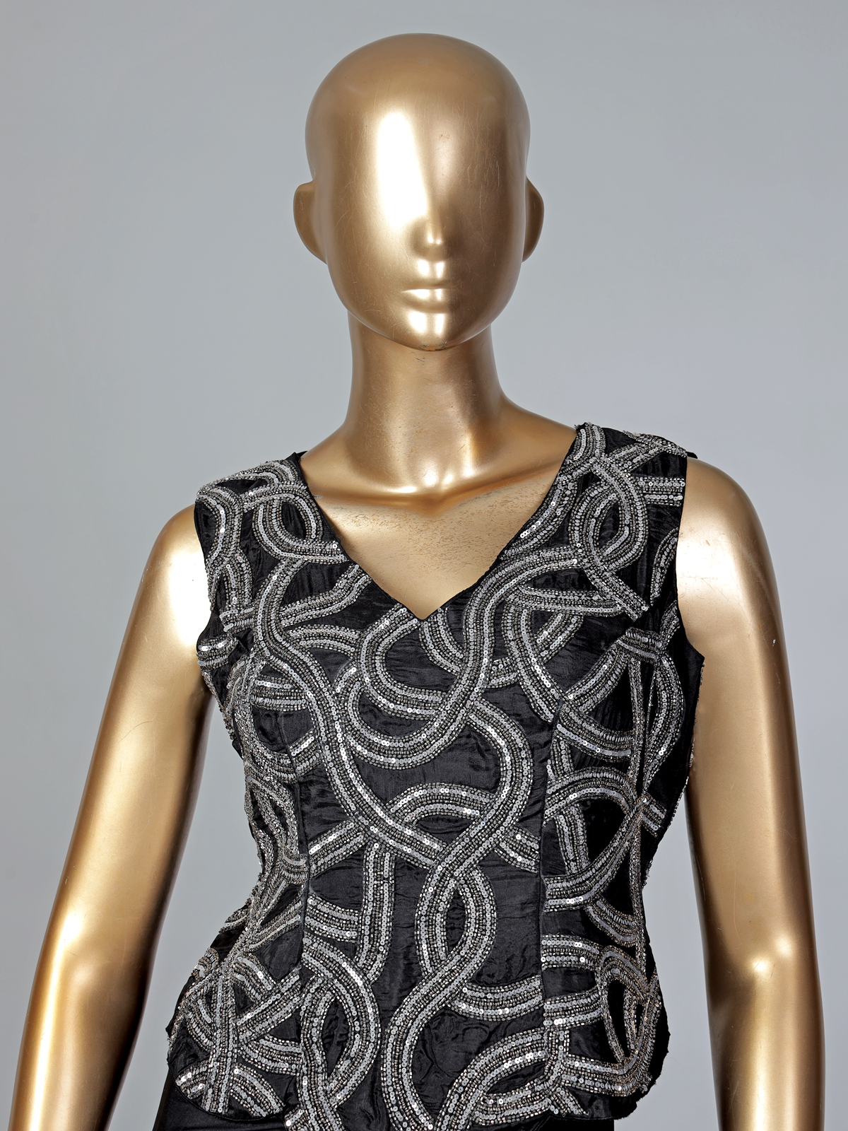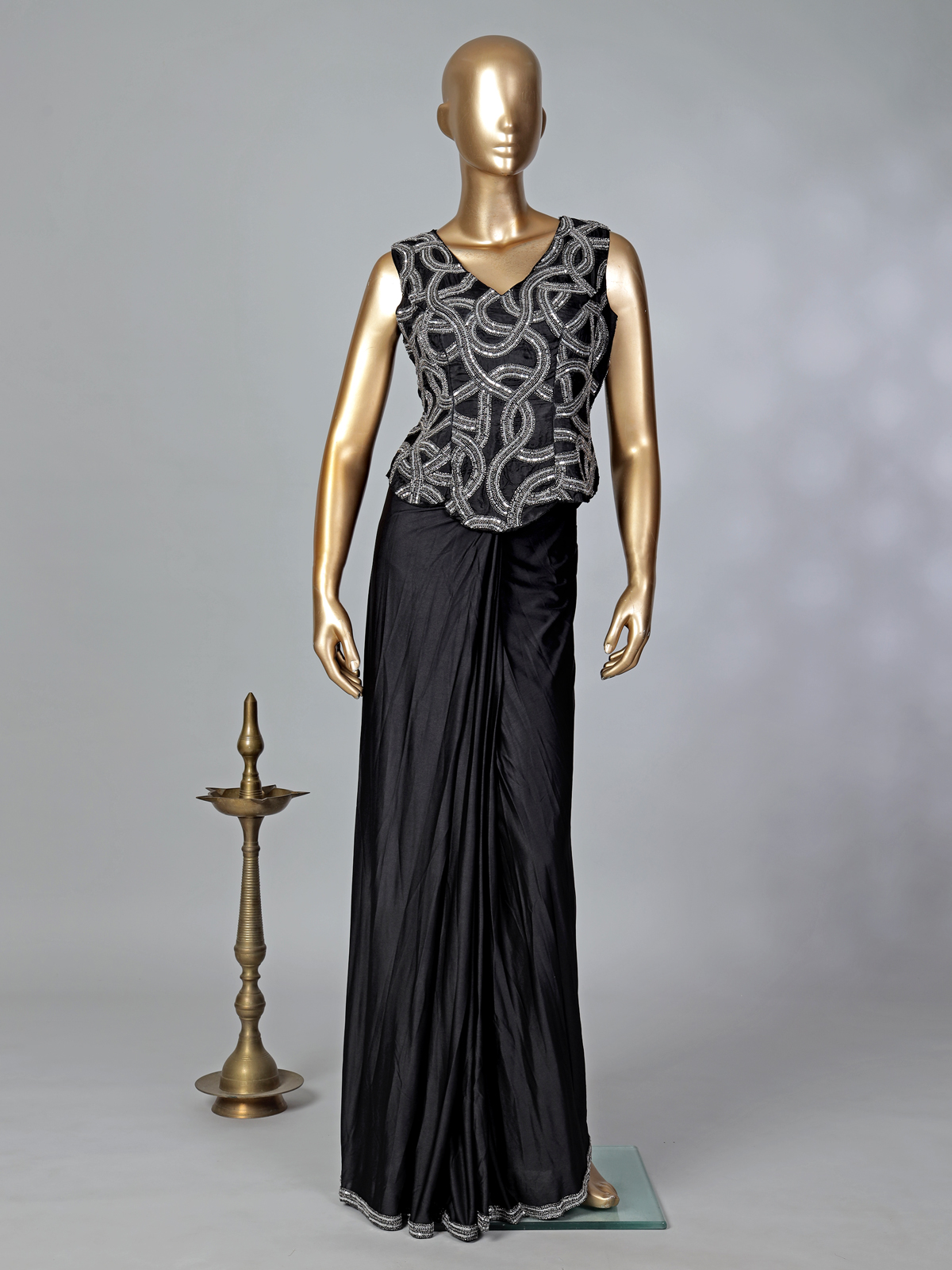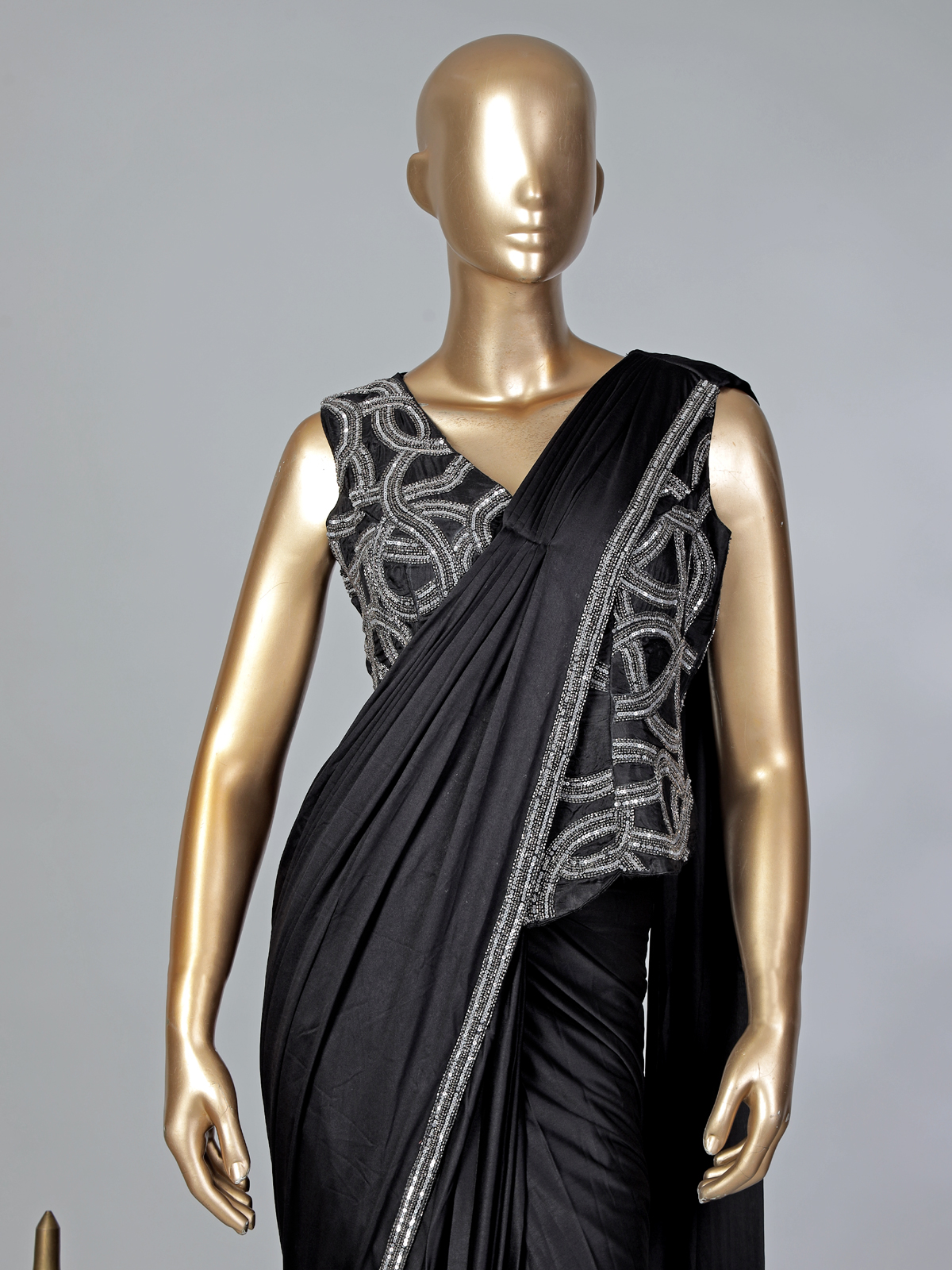Timeless glamour meets modern charm in this stunning black lycra ready-to-wear saree. The sleeveless V-neck blouse sparkles with intricate cutdana, beads, and sequins, creating a radiant festive glow. Its fluid drape enhances the figure beautifully, making it ideal for receptions, parties, and special celebrations.