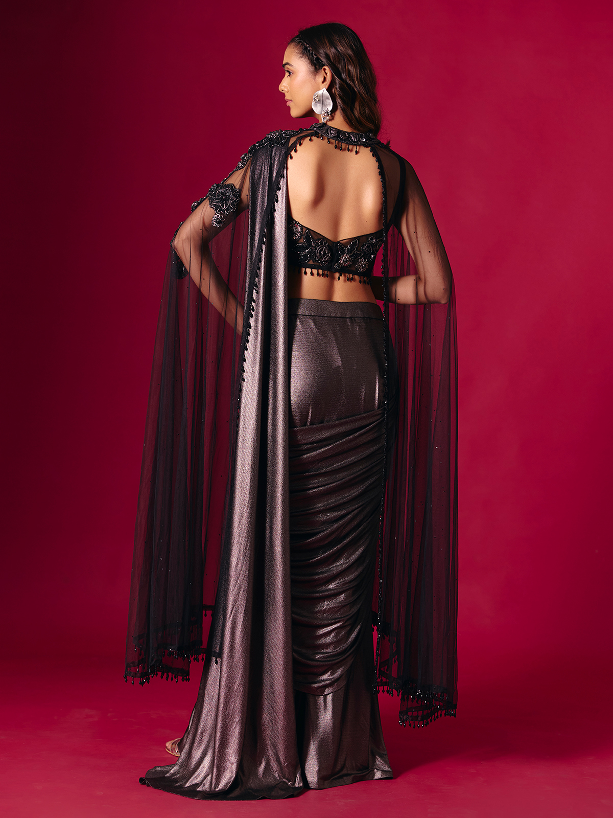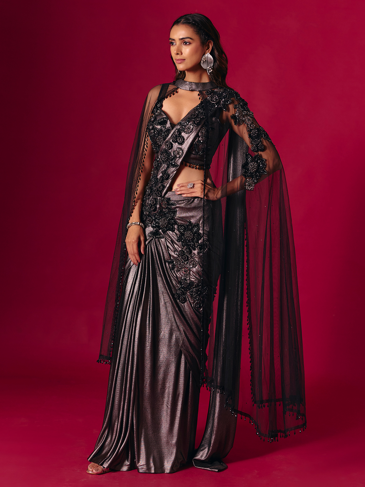 This black lycra ready-to-wear saree stands out with intricate cutdana, bead, and sequins work, giving it a sleek festive shine. Its smooth drape and modern fall make it perfect for receptions and parties, offering a blend of comfort and contemporary sophistication.