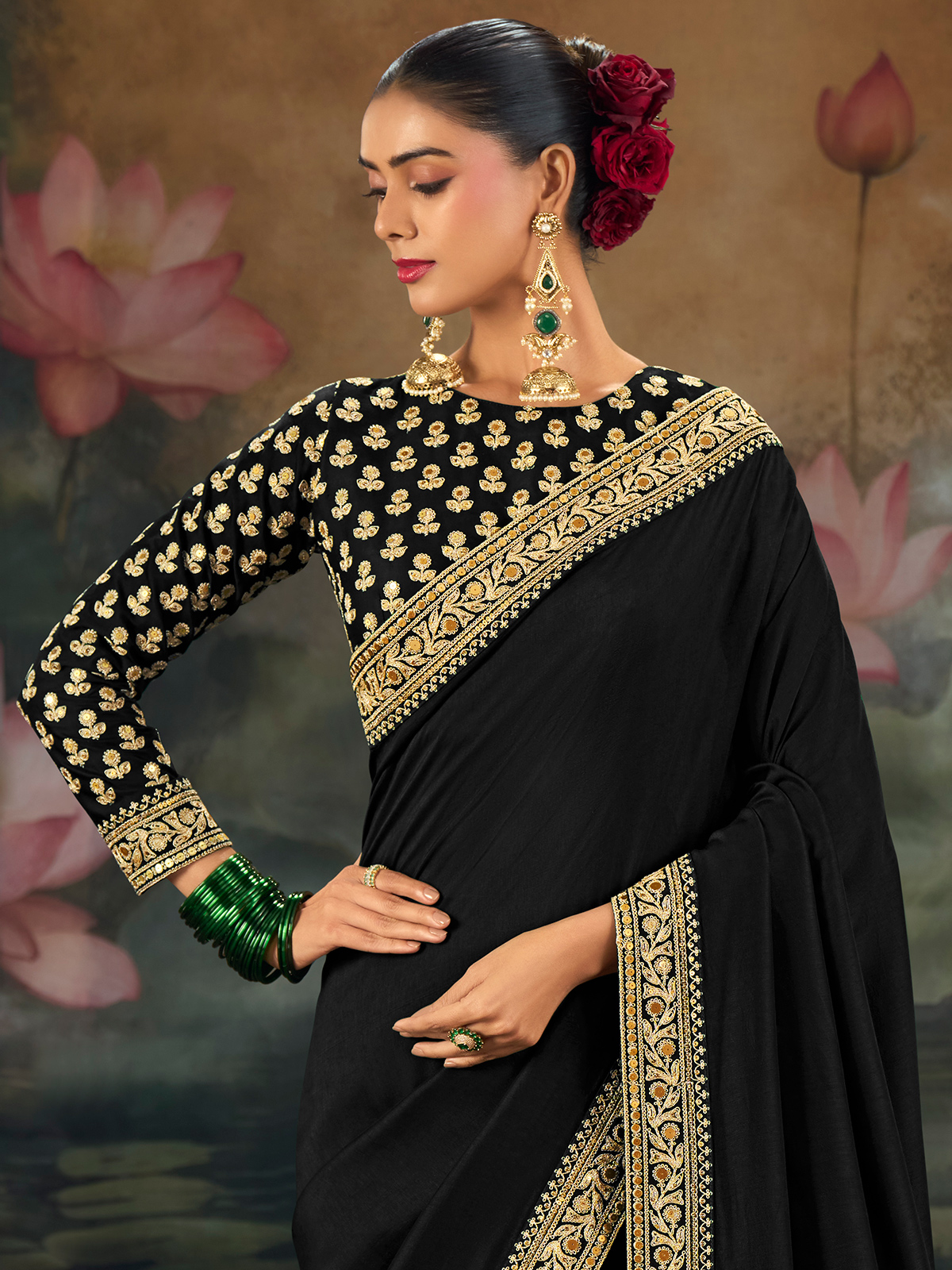 Radiating classic elegance, this black saree captures enduring ethnic charm. Made from high-sheen pure munga silk, it is enhanced with a striking golden border featuring intricate resham and sequin floral designs. Paired with a richly embroidered unstitched blouse with gold buttis, it is perfect for weddings, receptions, and festive gatherings.