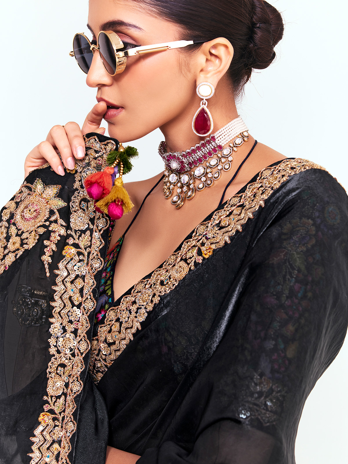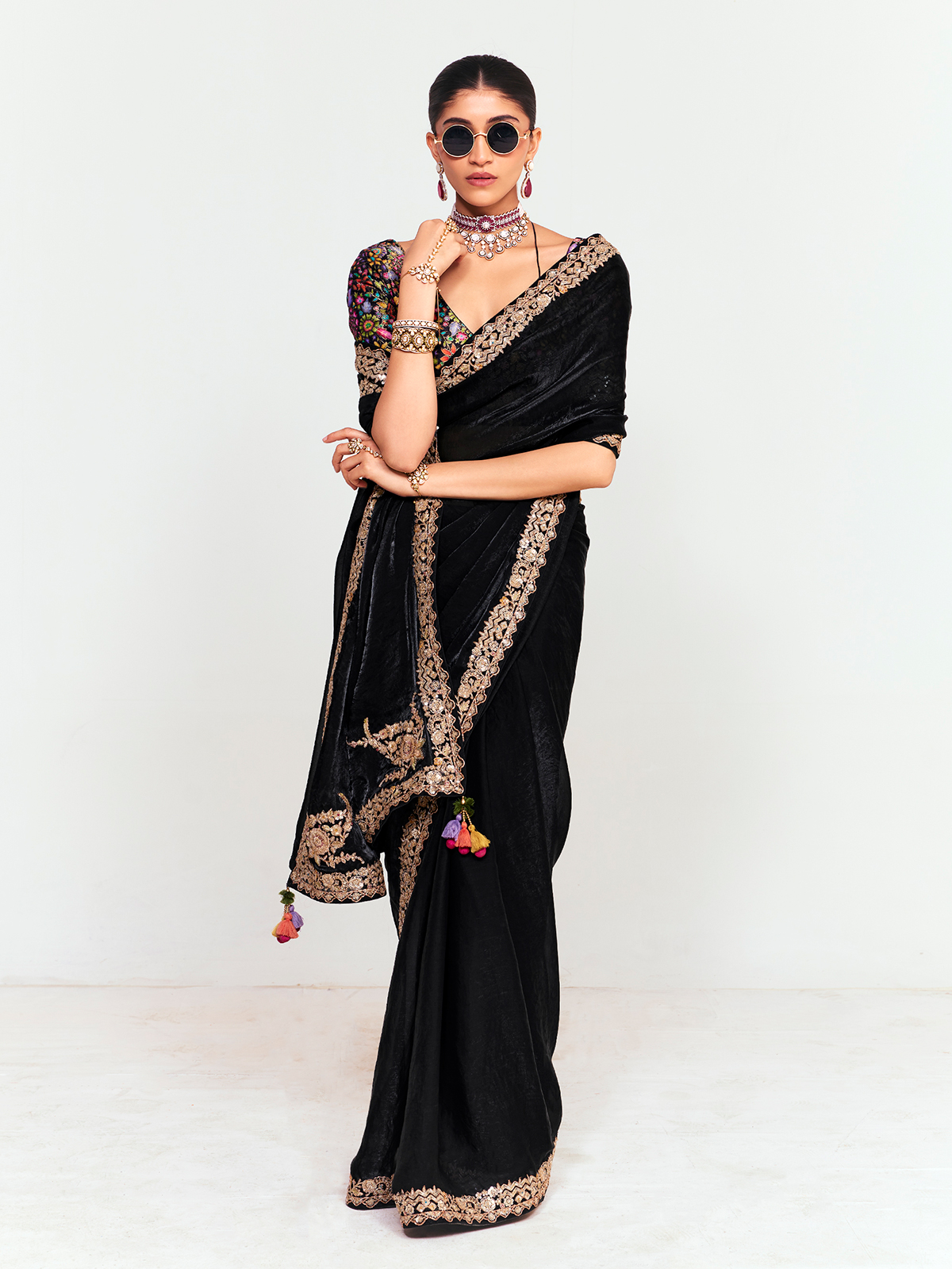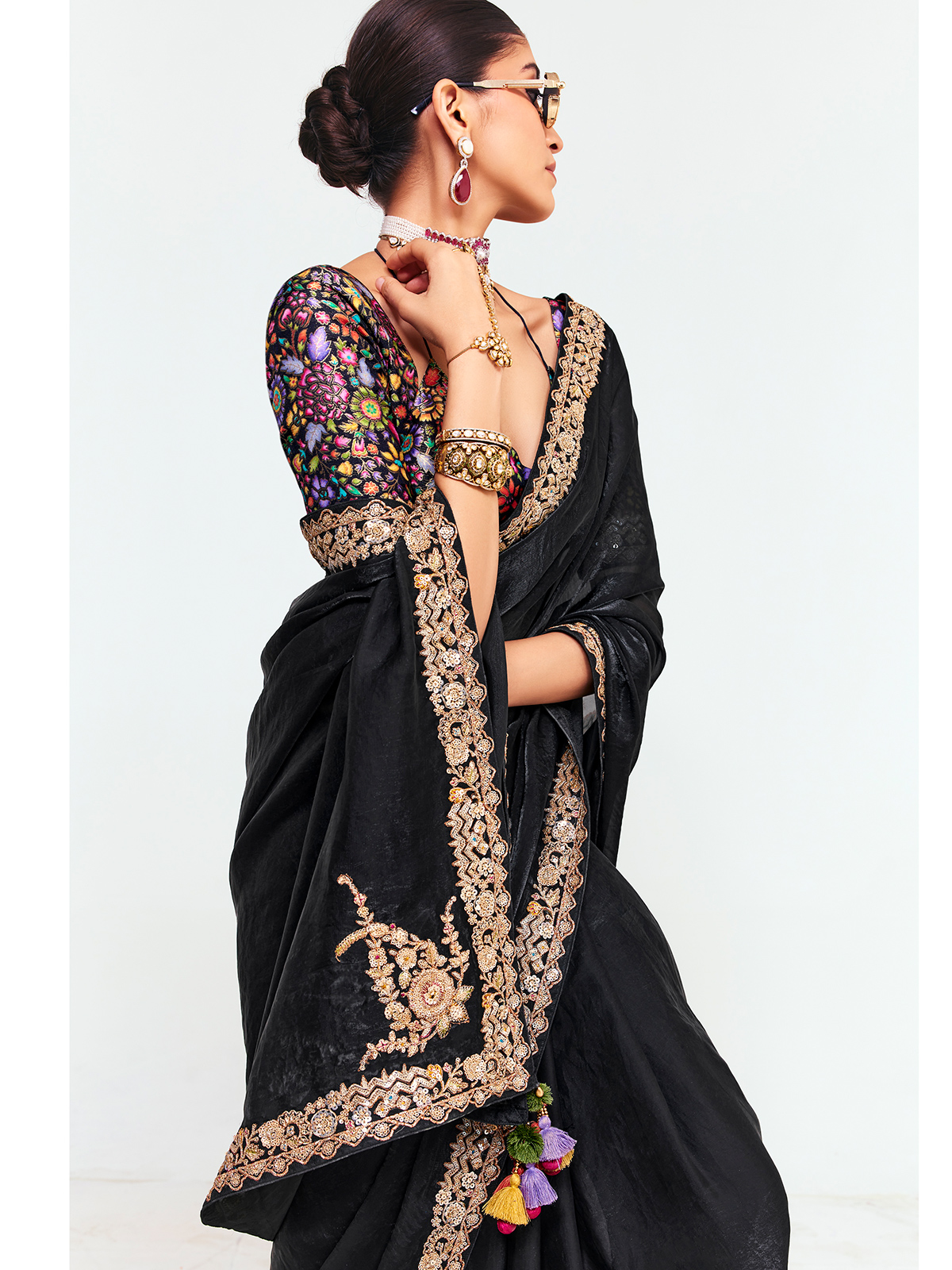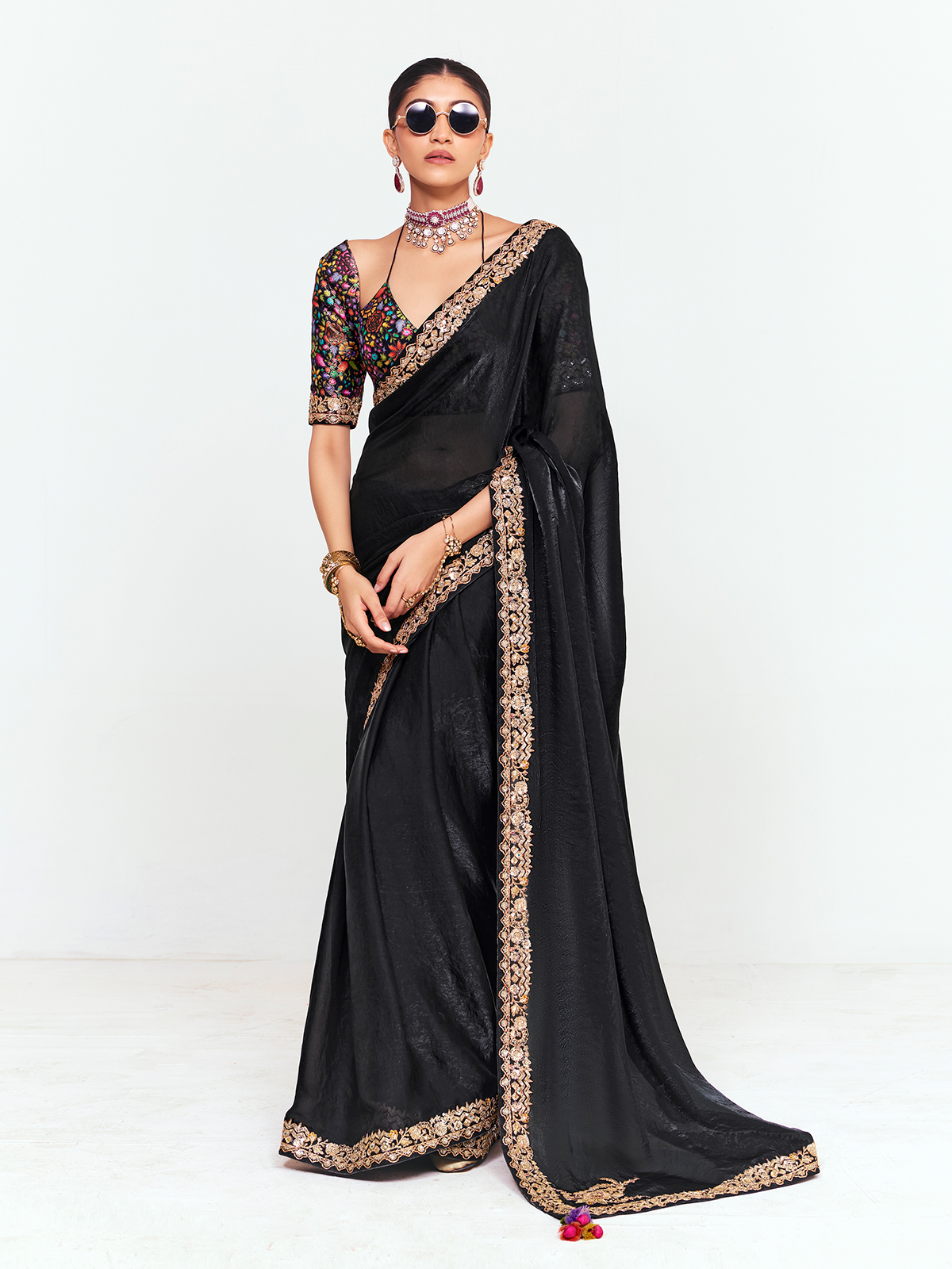 This graceful black tissue saree reflects timeless festive elegance with its soft, flowing drape. The saree is beautifully finished with a scalloped embroidered border featuring gold resham, sequins, and delicate floral motifs. Complemented with an unstitched blouse showcasing vibrant multicolored thread embroidery and peacock-inspired patterns, it creates a sophisticated festive statement.