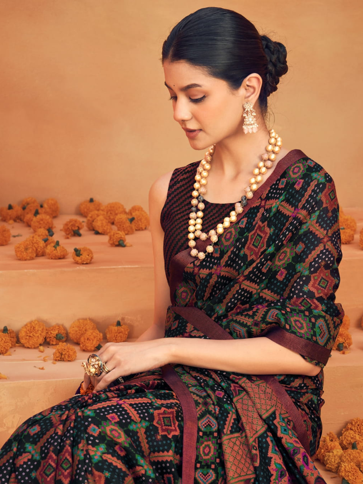 Celebrate tradition with a lightweight soft georgette saree featuring detailed print work for a rich, festive look. It includes an unstitched blouse piece, giving you the freedom to design it to your style and fit.