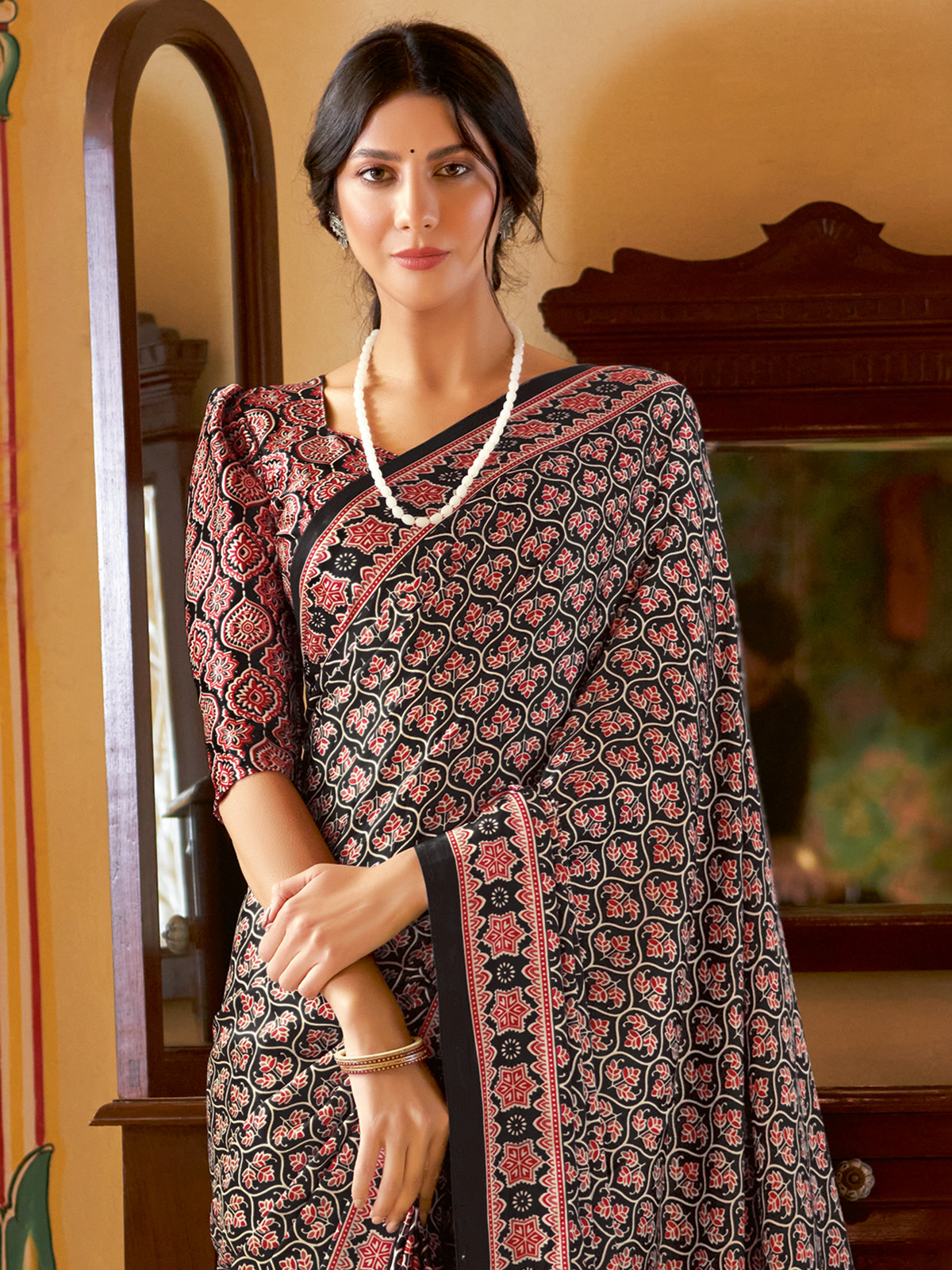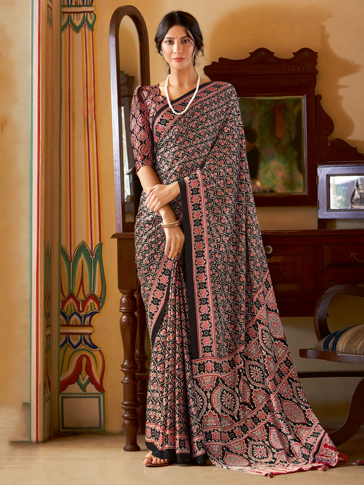 Embrace cultural elegance with a black Ajrakh printed Japan satin saree. Perfect for family gatherings and festivals, it includes an unstitched blouse piece in the same exquisite design.