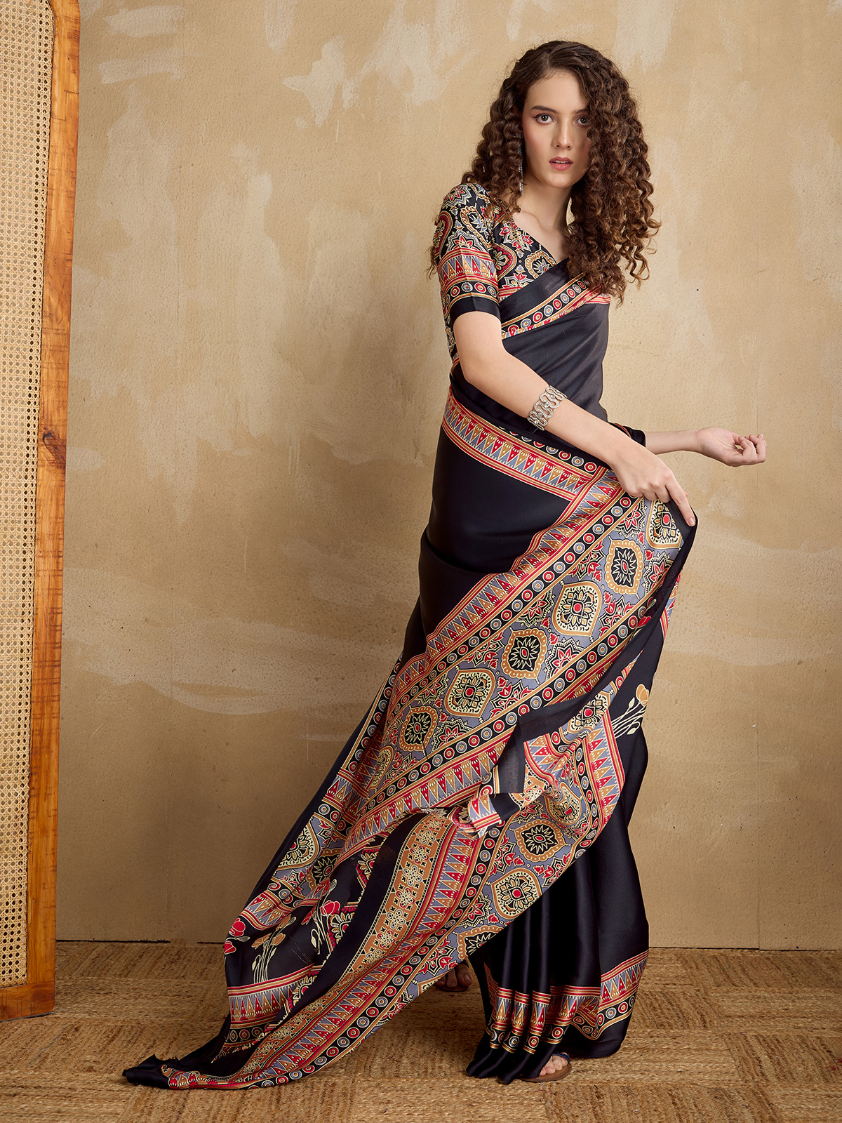 Simple yet sophisticated black satin-finish saree exudes a modern yet traditional charm, featuring a smooth, lustrous drape that creates a sleek silhouette. The design is highlighted by a vibrant multi-colored geometric and floral border in shades of red, gold, and blue, which extends into a heavily patterned pallu. Paired with a coordinated printed unstitched blouse, this ensemble is an ideal choice for evening events or contemporary festive gatherings.
