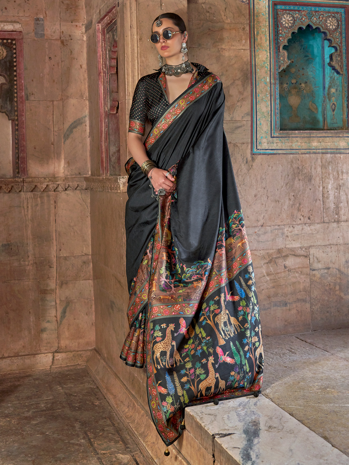 Draped in mystery, this black silk saree holds the allure of a starlit sky. Subtle prints sweep across the fabric like ink on a moonlit scroll. Complete with an unstitched blouse piece, it’s ideal for refined evenings and festive moments.