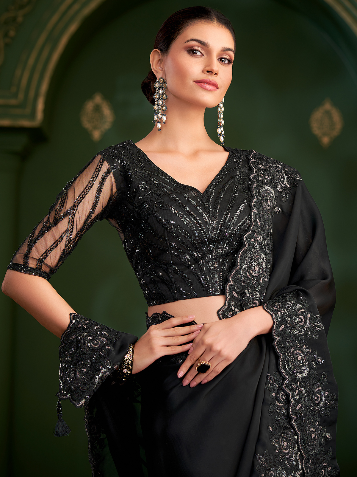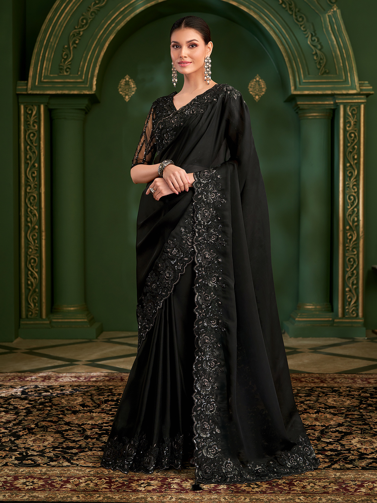 Crafted in classic black satin georgette silk saree. Features elegant embroidery highlighted with sequins and fine thread work. Paired with an unstitched blouse piece, it creates a striking and sophisticated look perfect for weddings, receptions, sangeet and party wear.