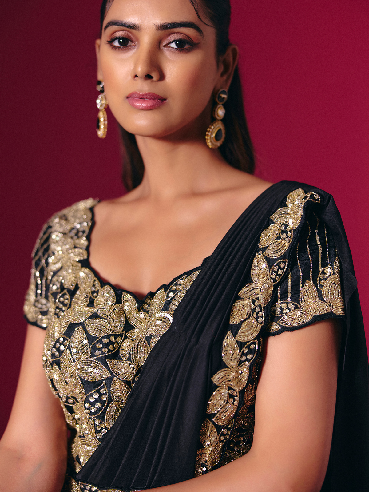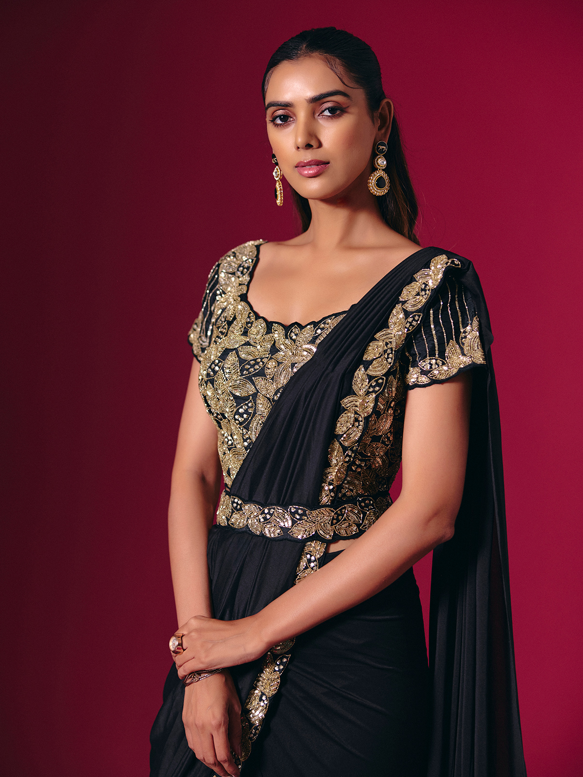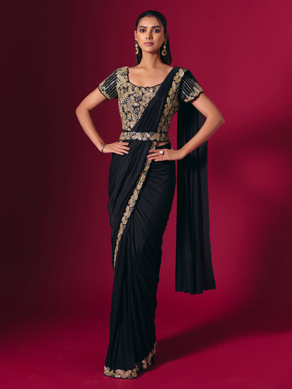 This glossy black satin lycra saree sparkles with cutdana, bead, and sequin embellishments. Paired with a designer waist belt, it creates a sleek, modern silhouette. A versatile pick for receptions, weddings, and high-style celebrations.
