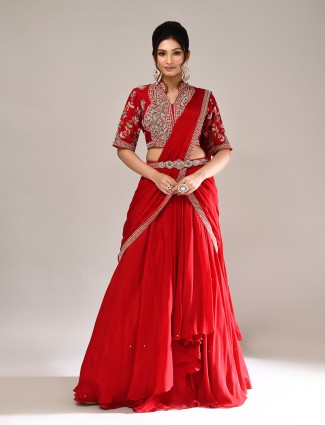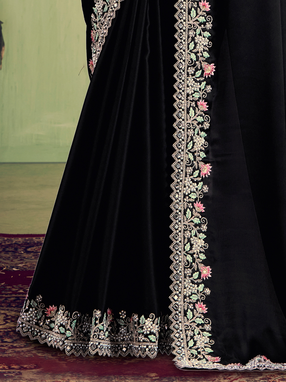 Designed to accentuate bold beauty and timeless grace, this black satin silk saree makes a striking festive statement. Richly adorned with resham, sequins, stone, mirror, and beads, it sparkles with intricate craftsmanship and luxurious detailing. Perfect for festivals, parties, and weddings, it is paired with an unstitched blouse for a complete and glamorous ethnic look.