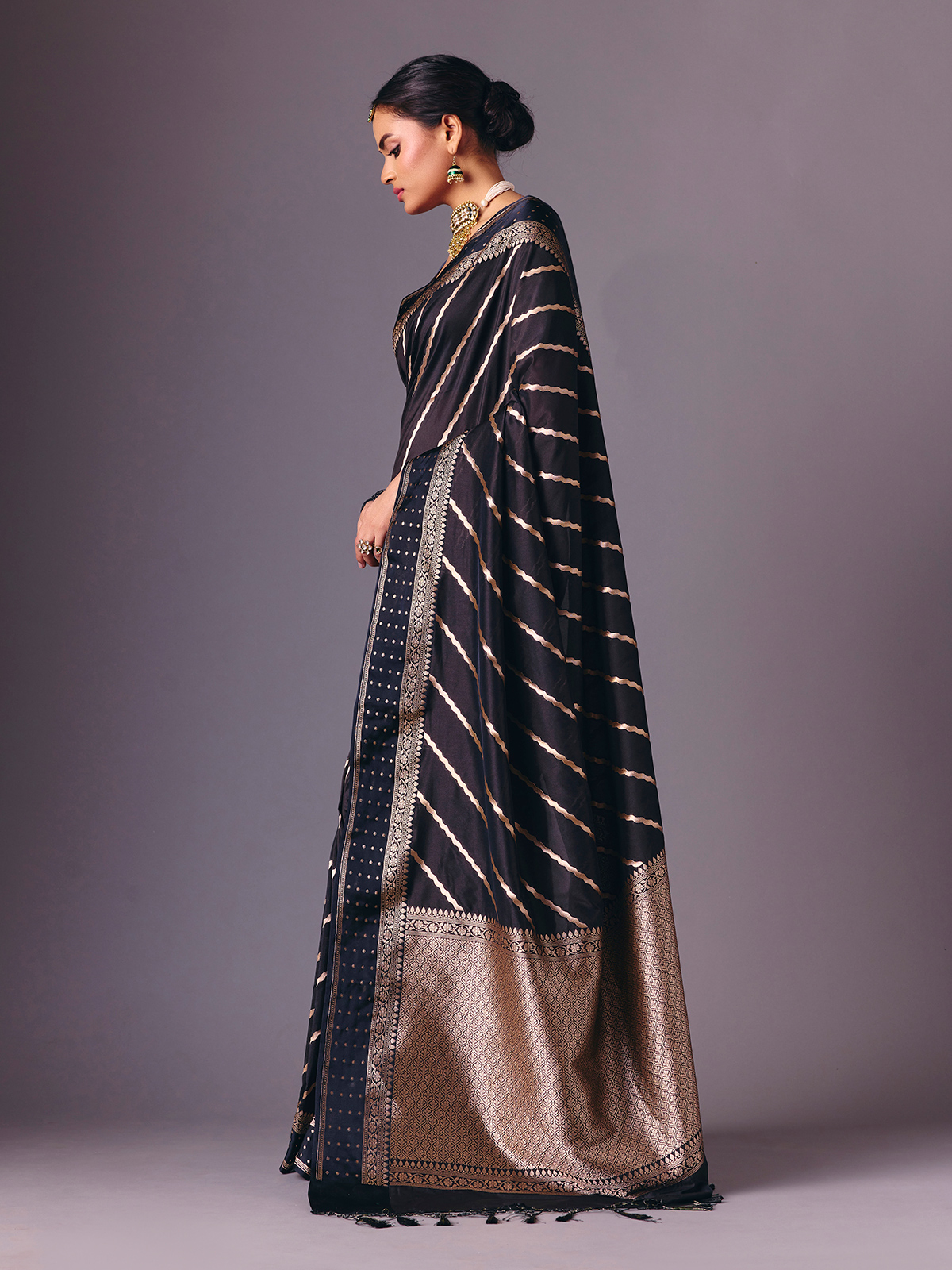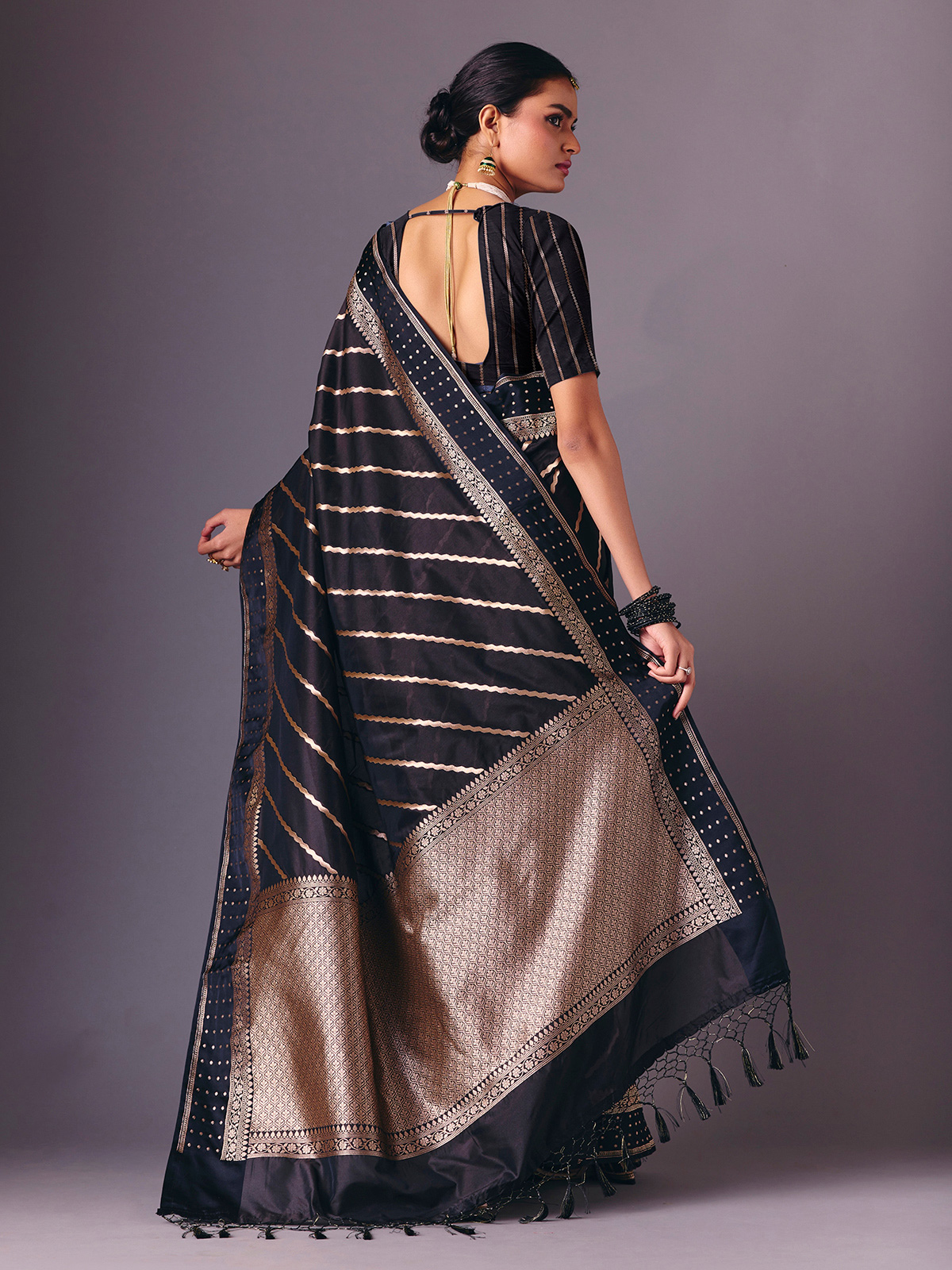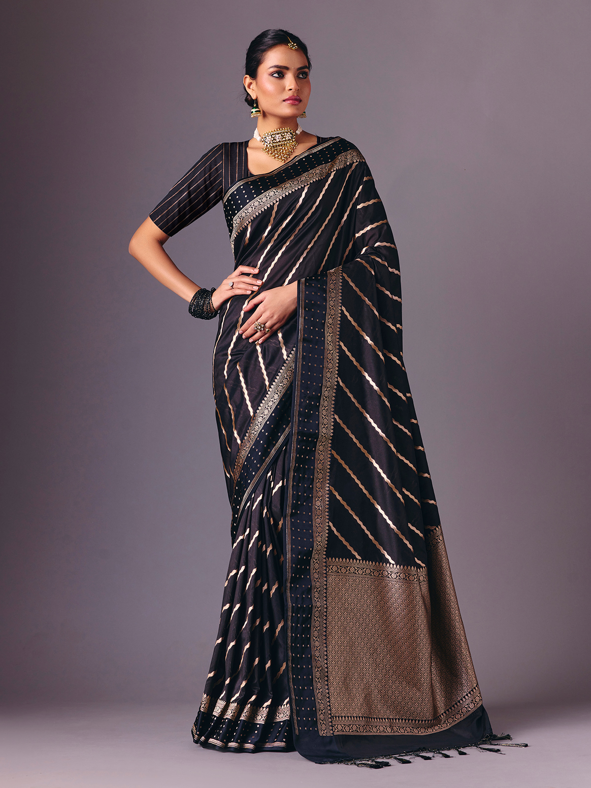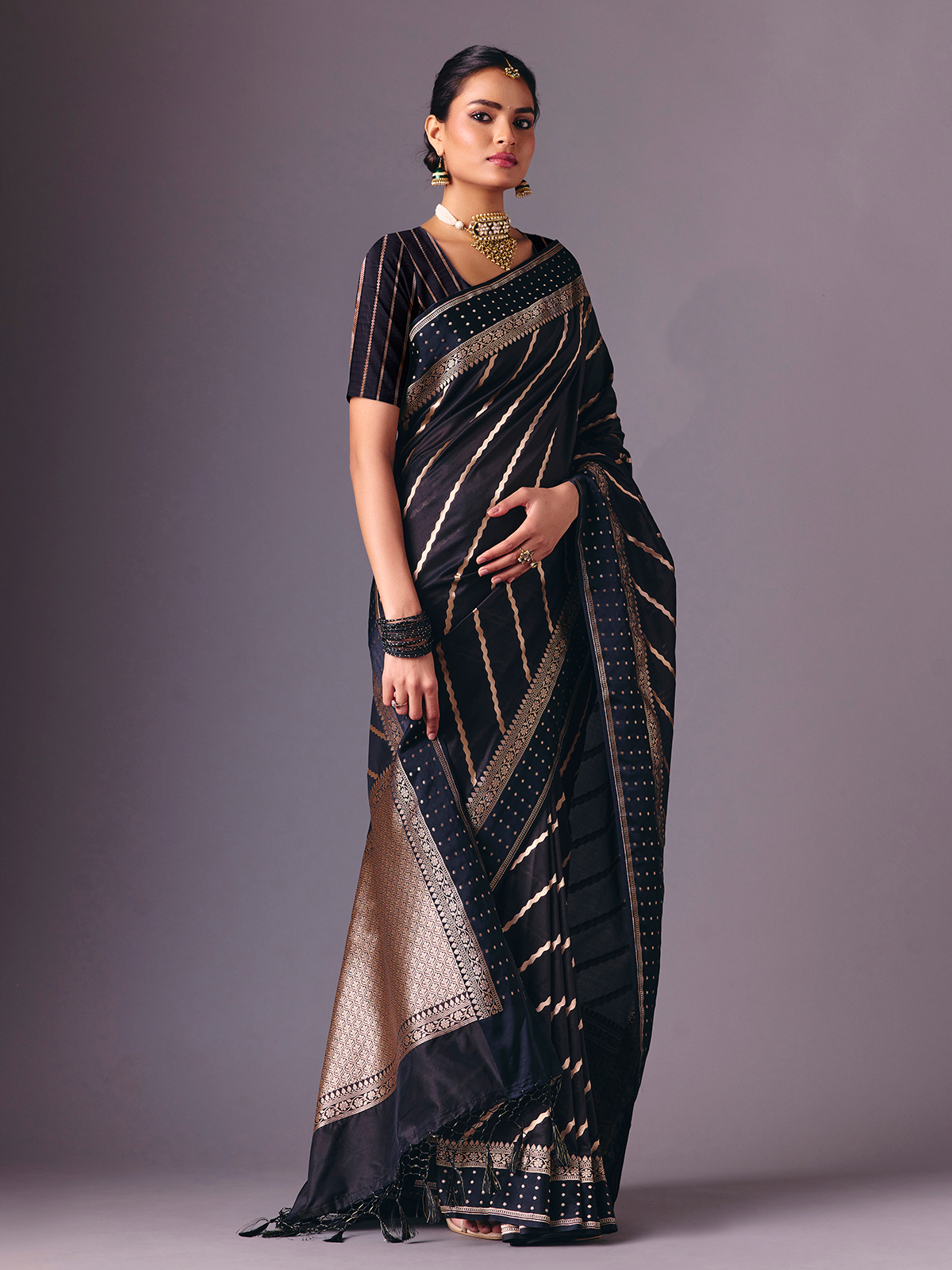 This classic black semi silk saree is enriched with fine zari weaving that enhances its elegant drape. Paired with an unstitched blouse piece, it offers a timeless festive silhouette ideal for receptions, celebrations, sangeet nights and party wear occasions.