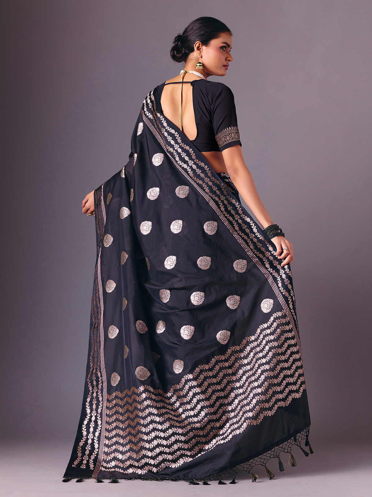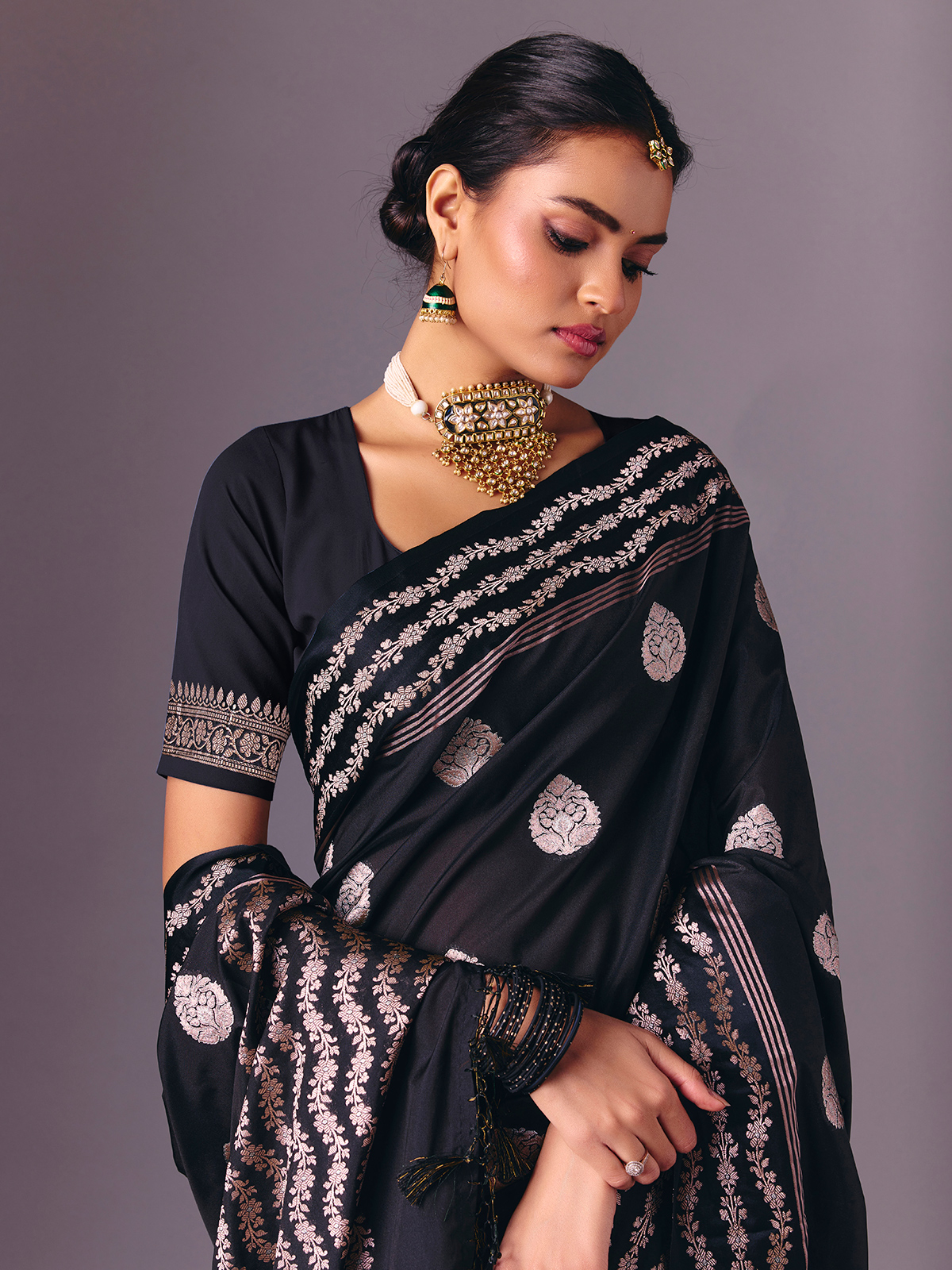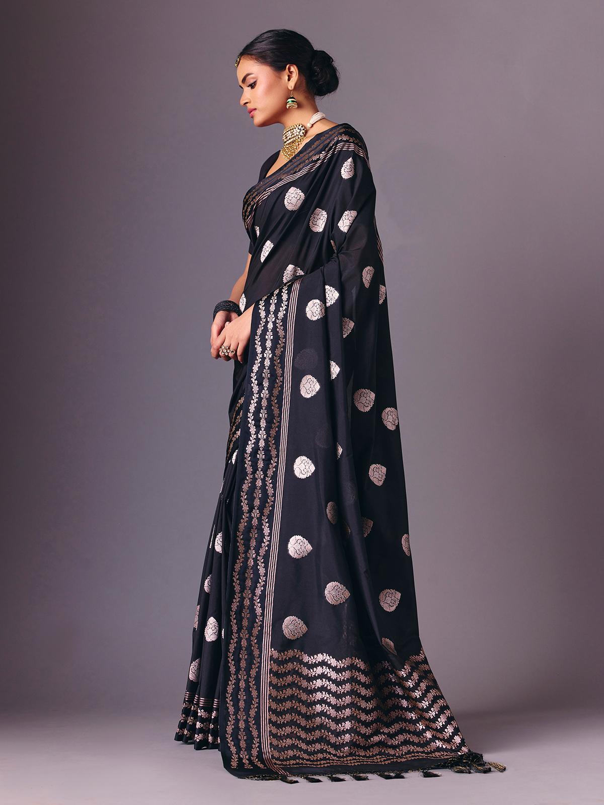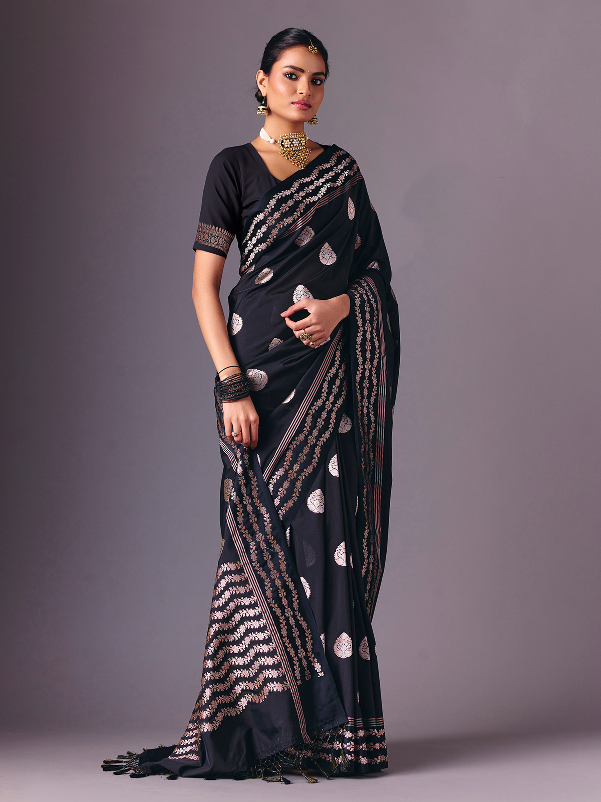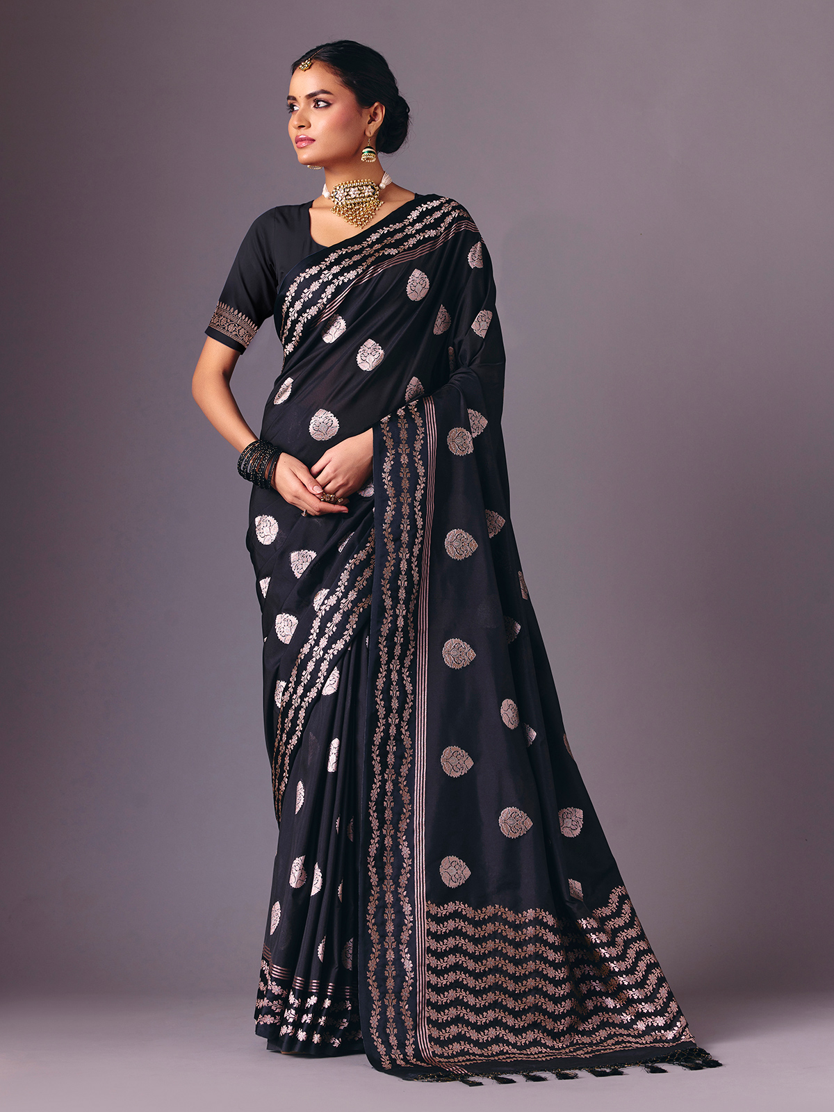 Crafted in elegant black semi silk saree. Features refined zari weaving highlighted with classic butti motifs. Paired with an unstitched blouse piece, it offers a timeless festive silhouette, making it perfect for receptions, sangeet evenings, party wear and celebratory gatherings.