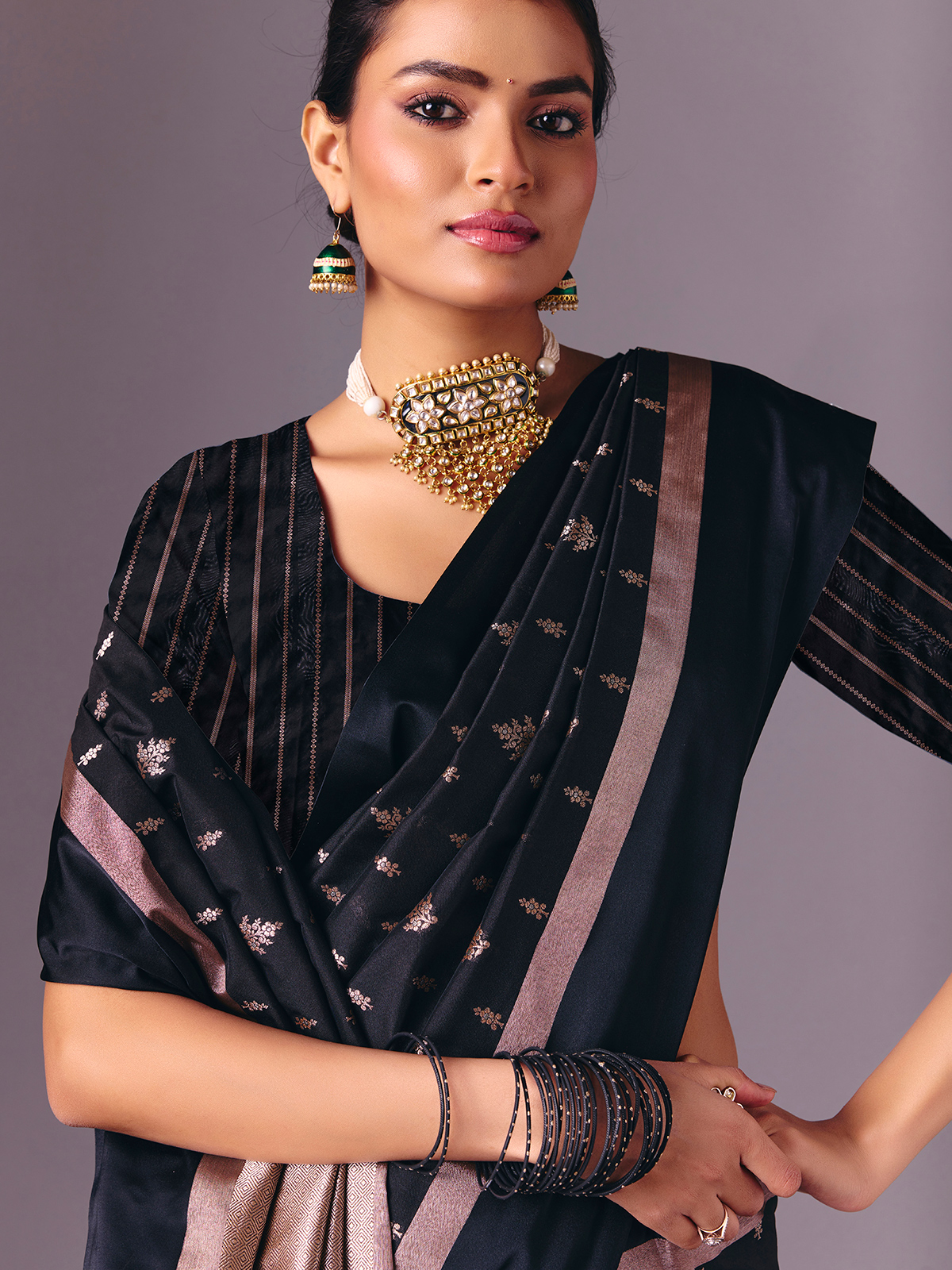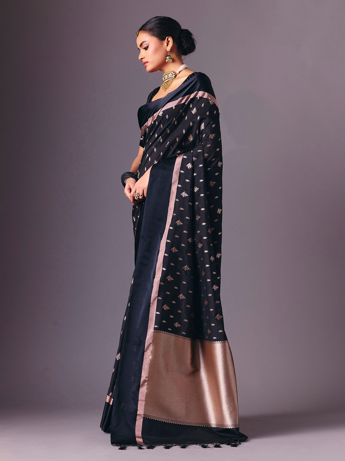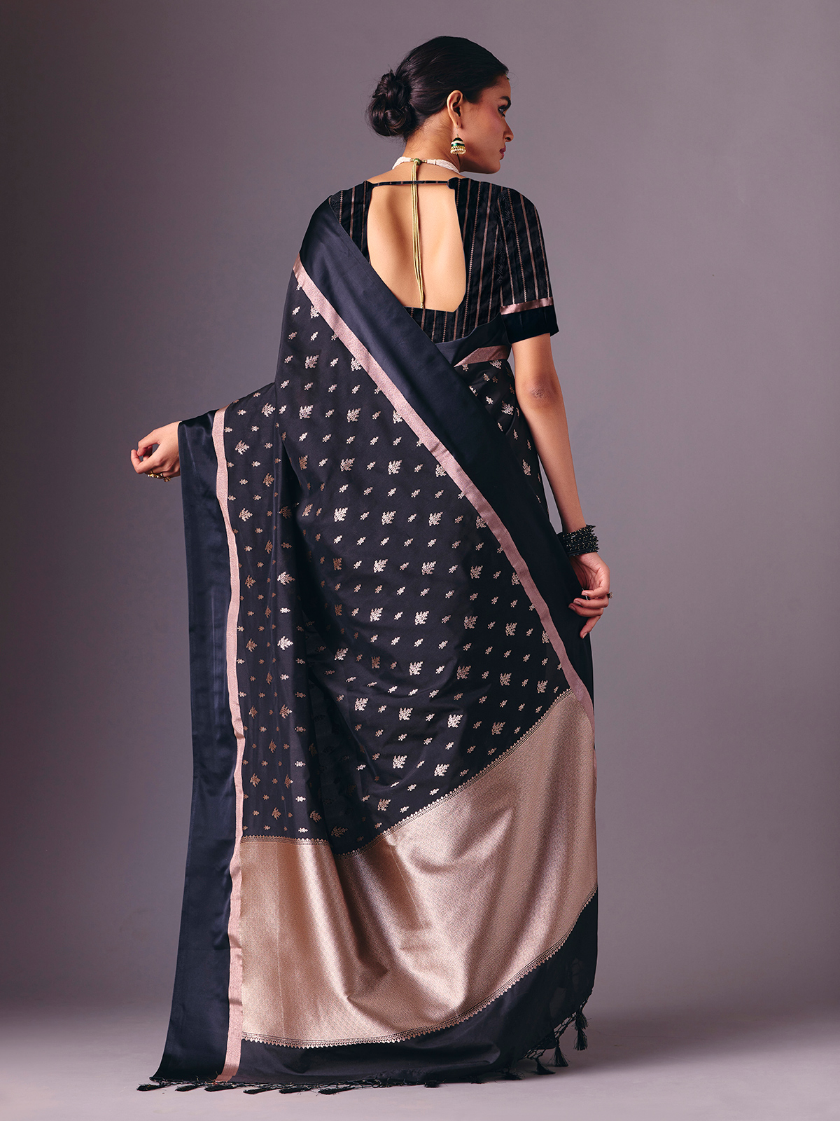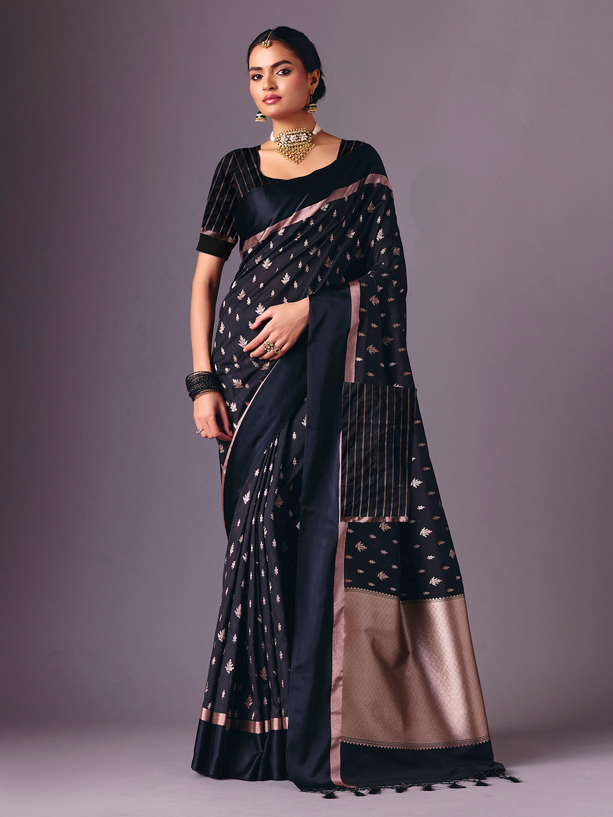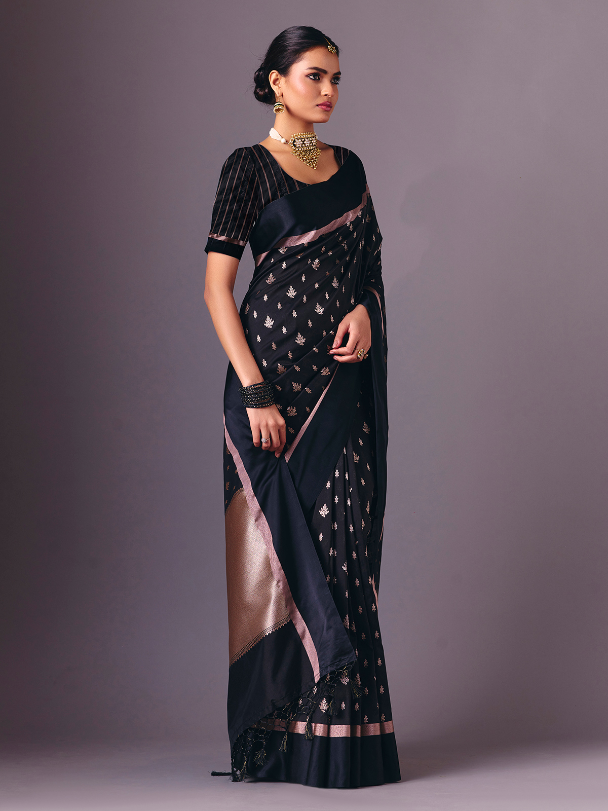 This black semi silk saree is detailed with refined zari weaving that lends a luxurious festive finish. Accompanied by an unstitched blouse piece, it creates a graceful ensemble perfect for receptions, festive evenings, sangeet nights and party wear styling.