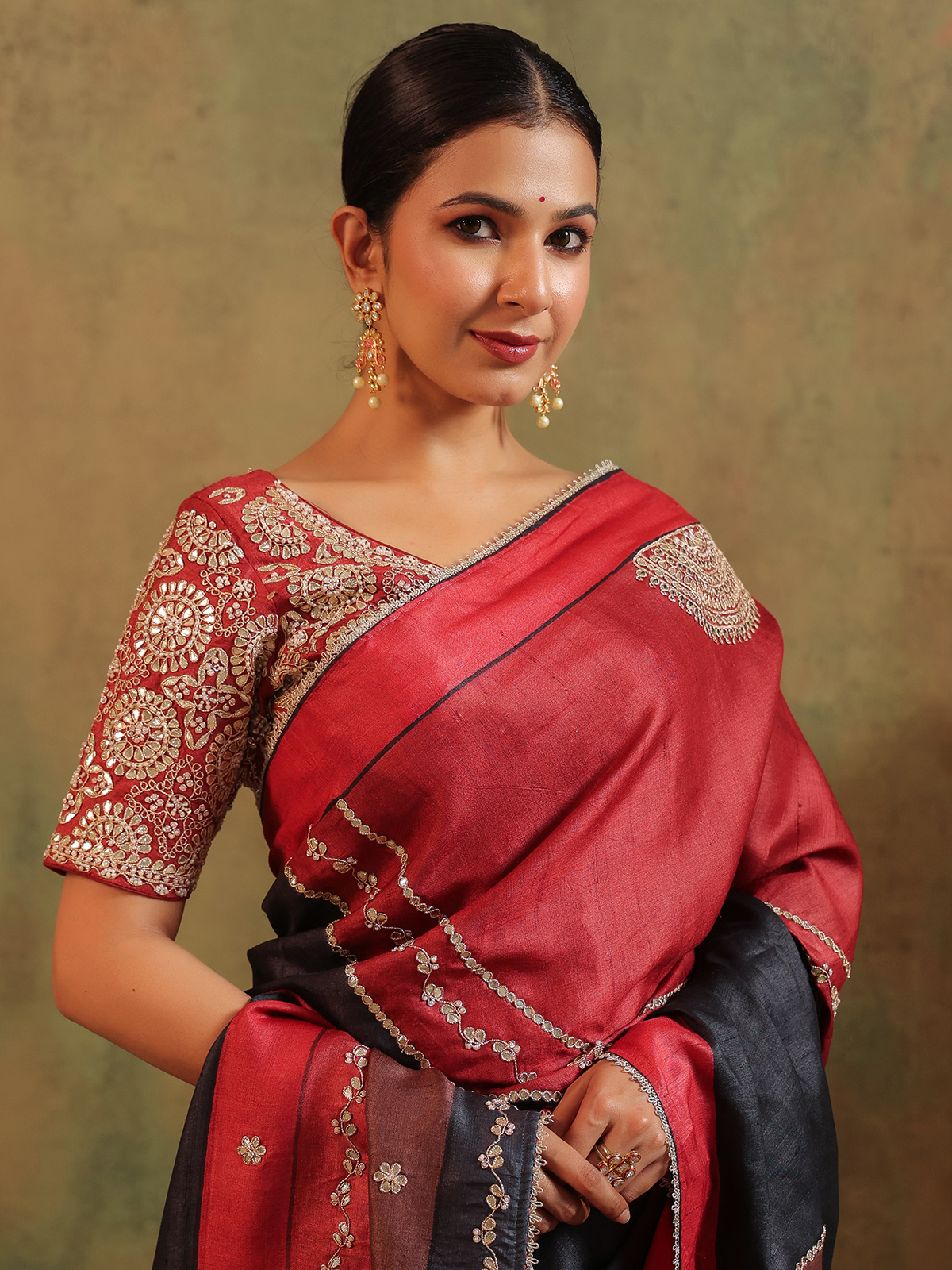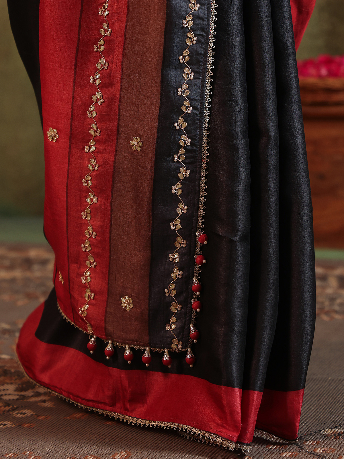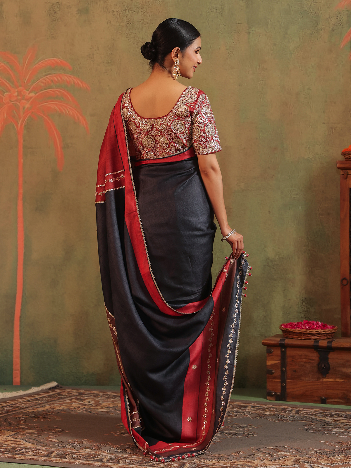 Printed with subtle flair, this black silk saree glistens with beads, sequins, cutdana, zardosi and gota embroidery that tell stories in shimmer. A blend of grace and celebration, it flows like a soft melody. Paired with an unstitched blouse piece, it is perfect for cherished wedding days and joyful cultural festivals.