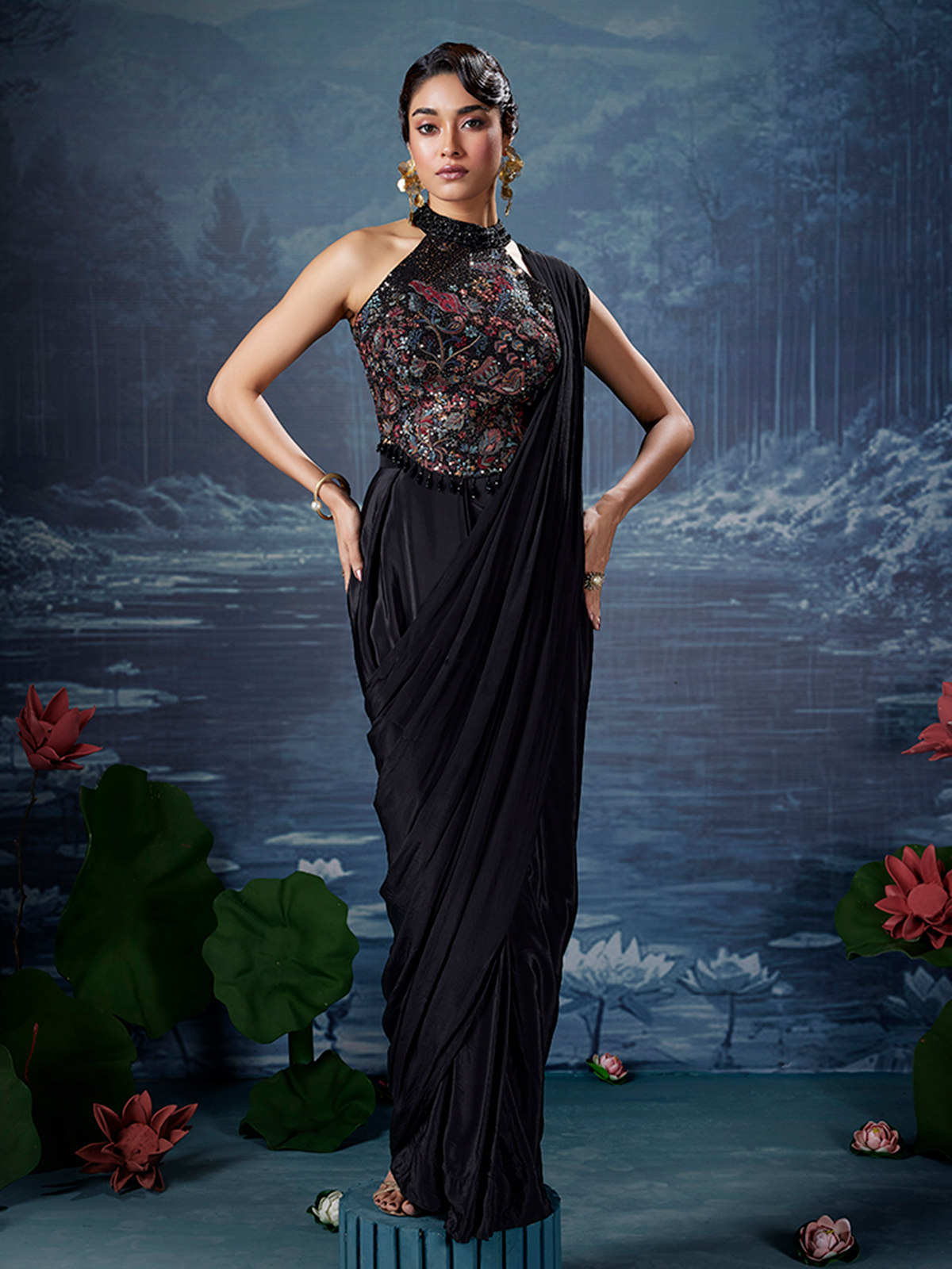 Radiate bold elegance in black silk ready-to-wear saree, its smooth texture reflecting understated confidence. Embroidery paired with sequins glows like constellations in the night sky, adding celestial charm. A readymade blouse completes the look, perfect for festive evenings and stylish party occasions.