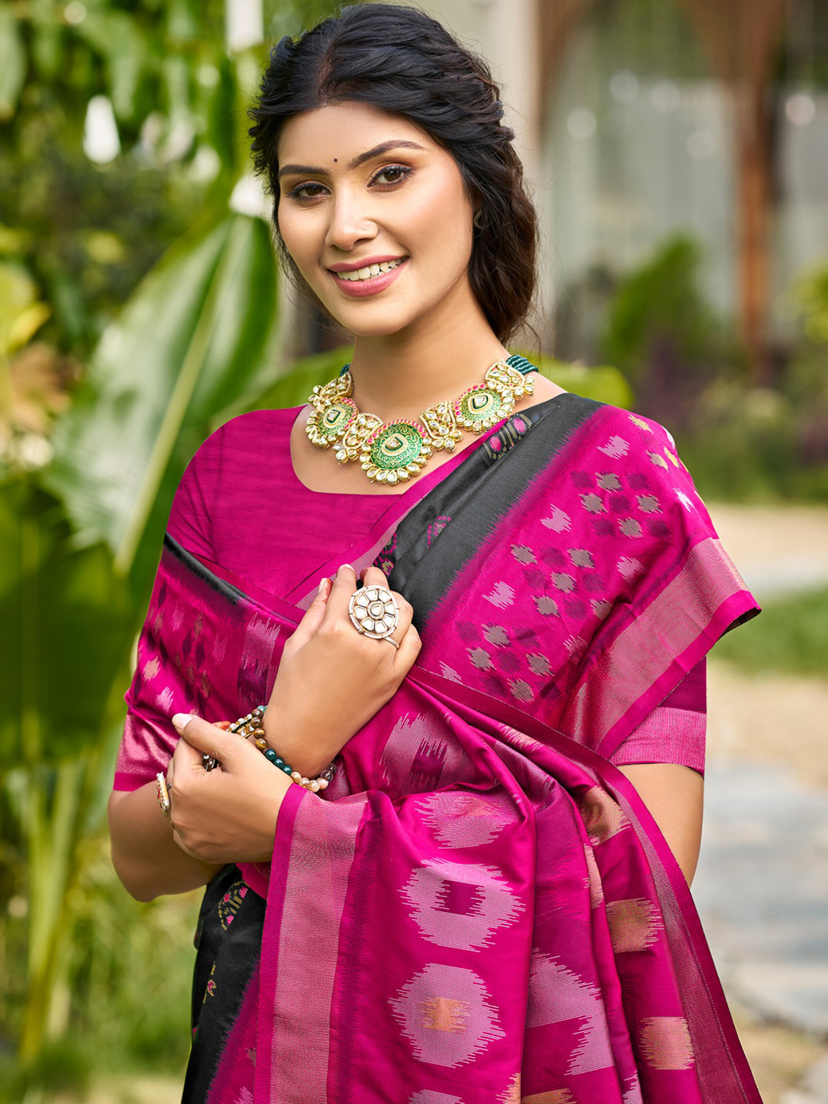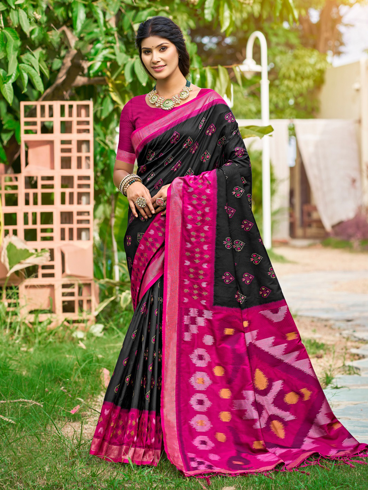 In rich black silk complemented by green and pink tones, this saree reveals a bold yet elegant festive charm. Printed motifs create soft artistic echoes across the drape, enriching its modern appeal. Paired with an unstitched blouse, it suits festivals, evening functions, and expressive cultural gatherings beautifully.