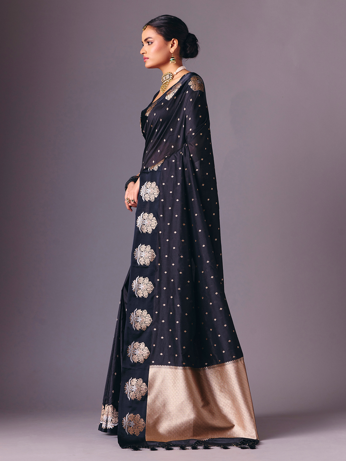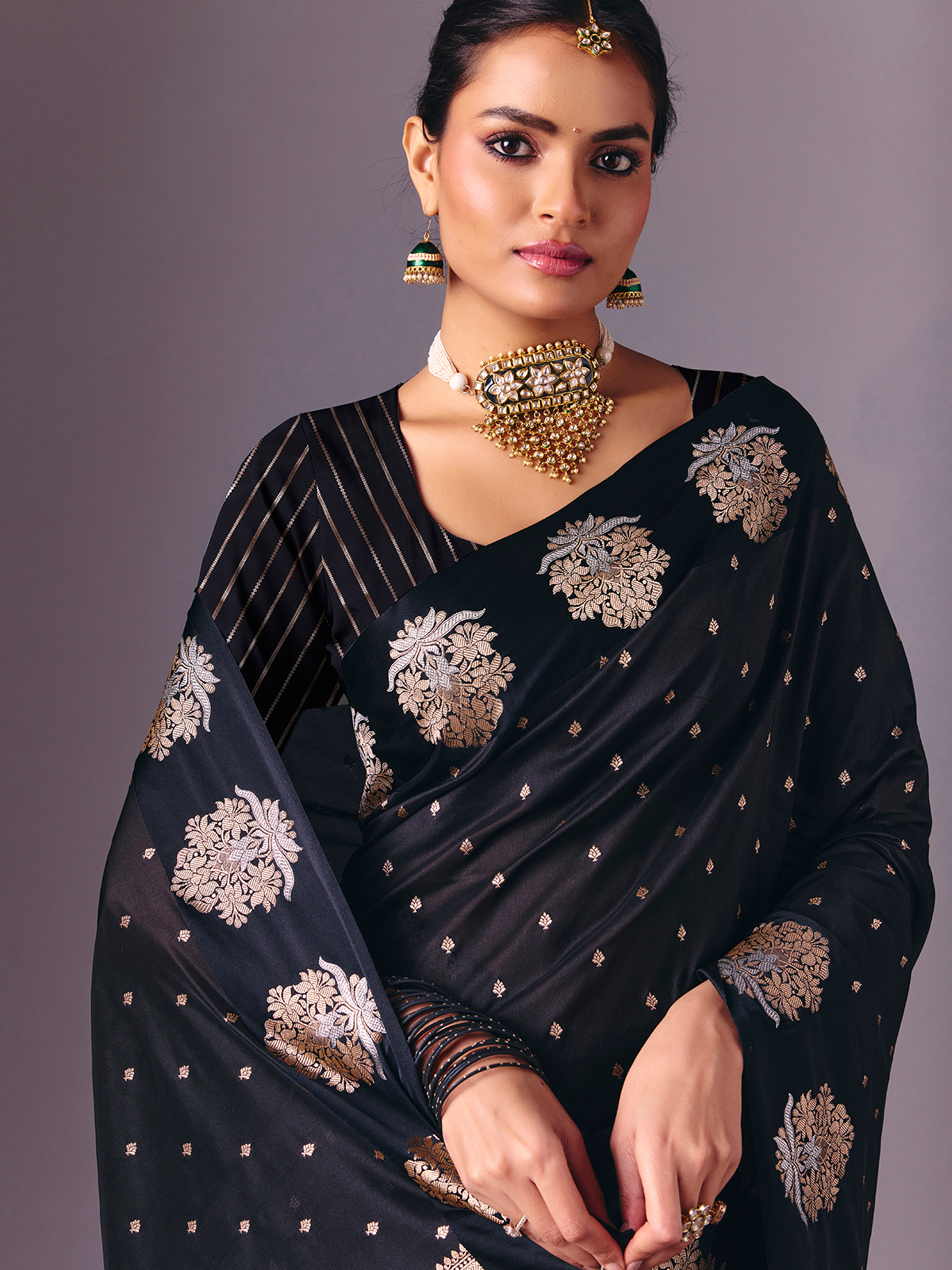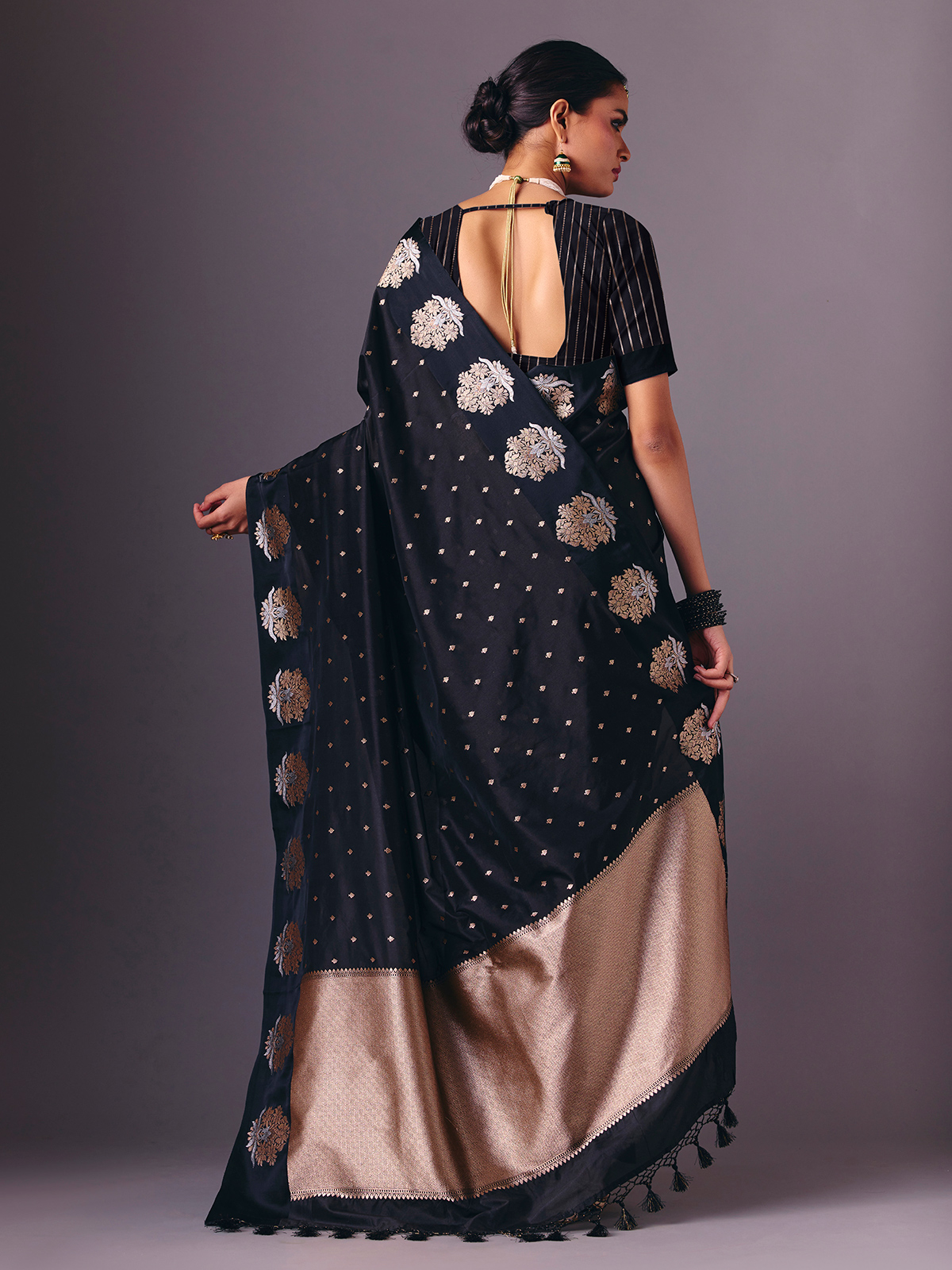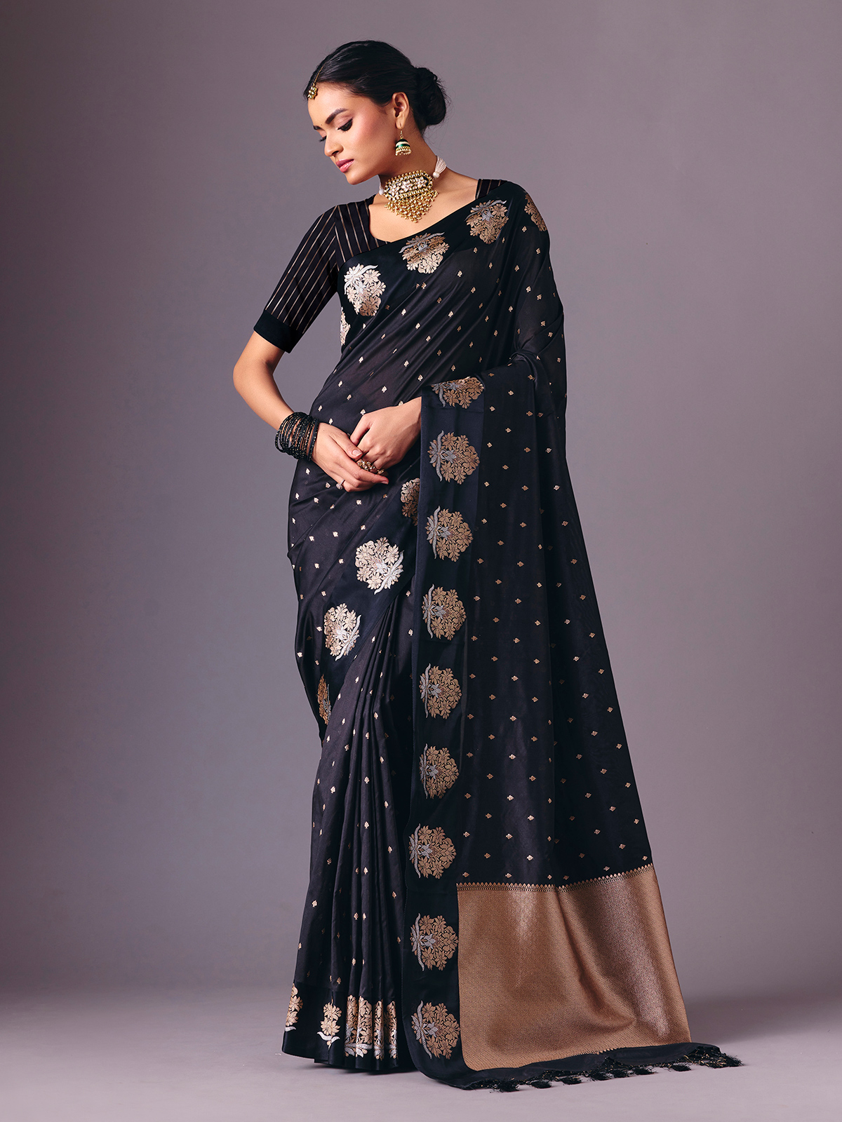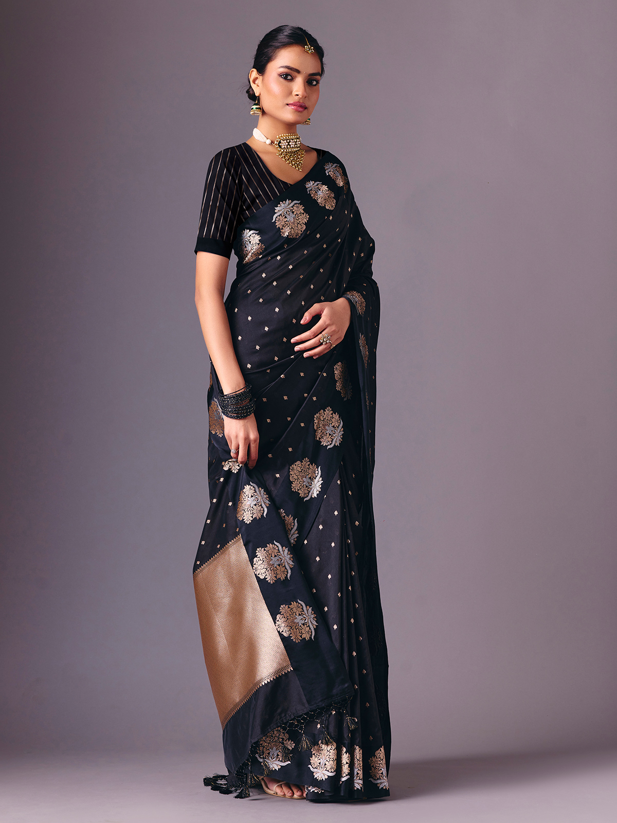Designed in luxurious black semi silk saree is adorned with elegant zari woven butti work throughout. Finished with an unstitched blouse piece, it creates a polished ethnic ensemble suitable for receptions, festive celebrations, sangeet nights and evening parties.