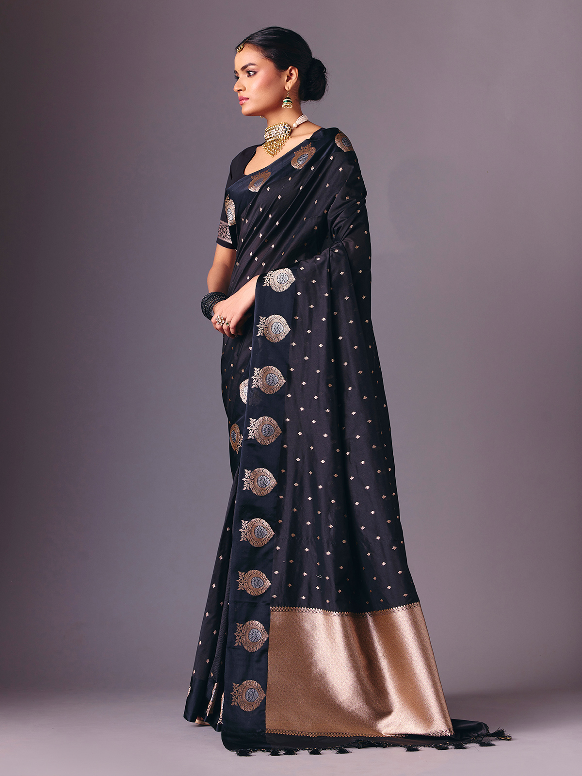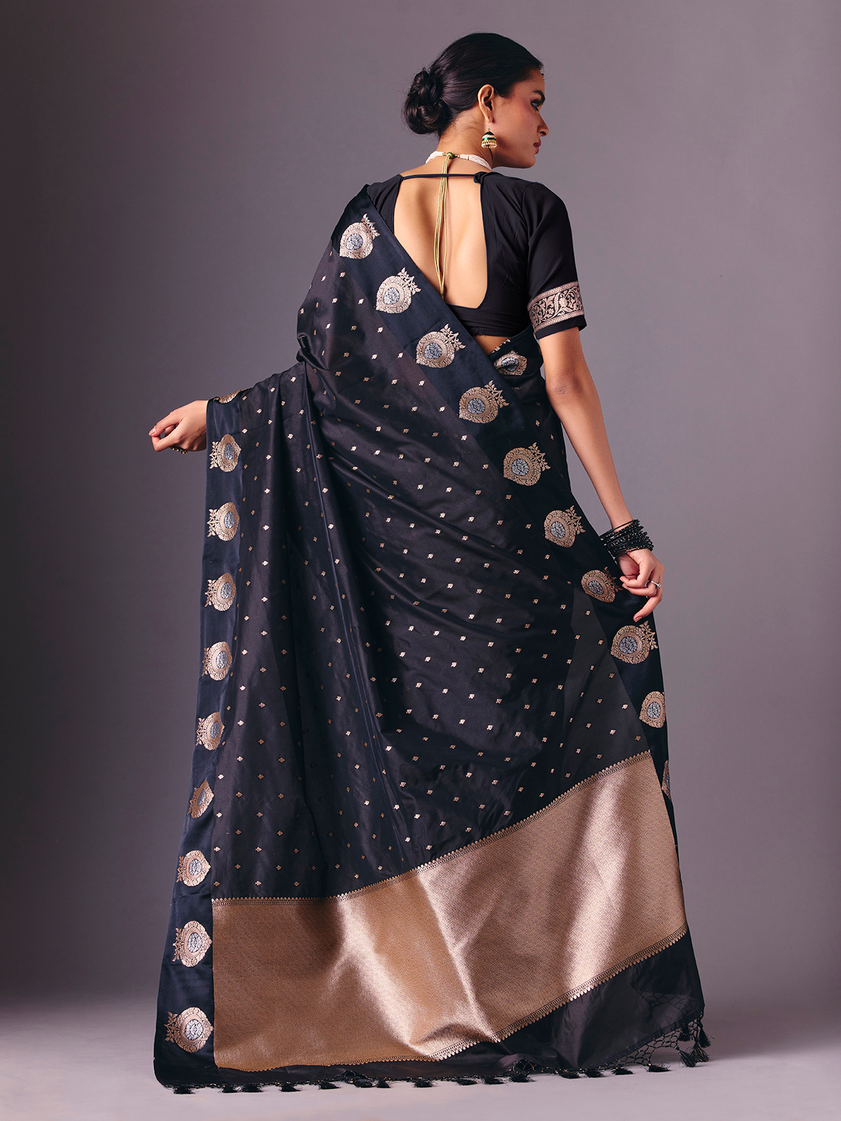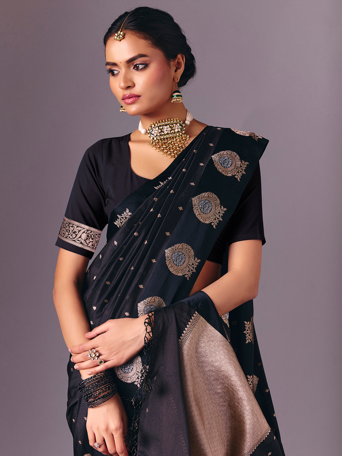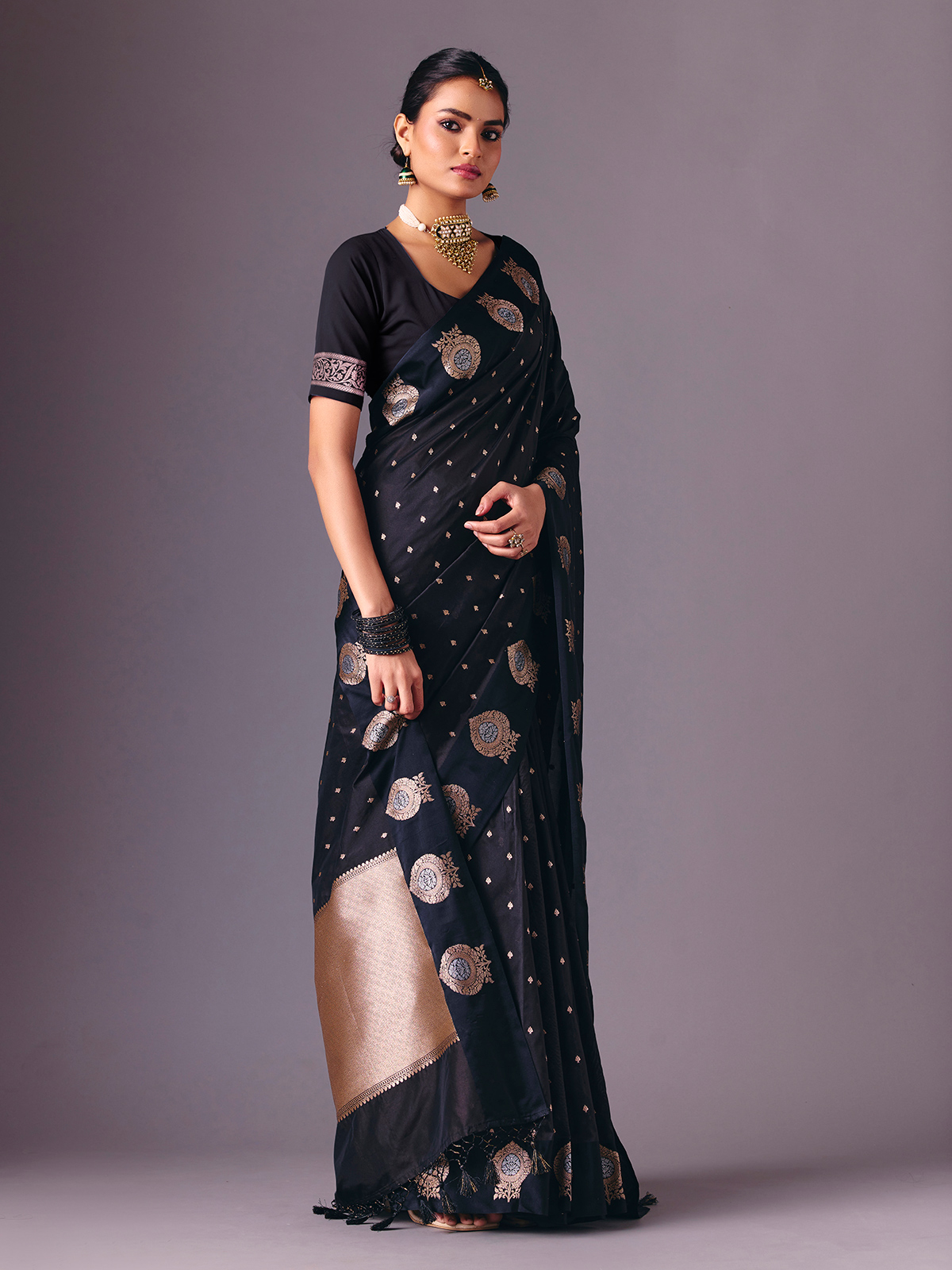 Styled in deep black semi silk saree highlights traditional zari weaving for a subtle festive glow. Complemented by an unstitched blouse piece, it creates a versatile ethnic look perfect for receptions, festive gatherings, sangeet functions and evening events.