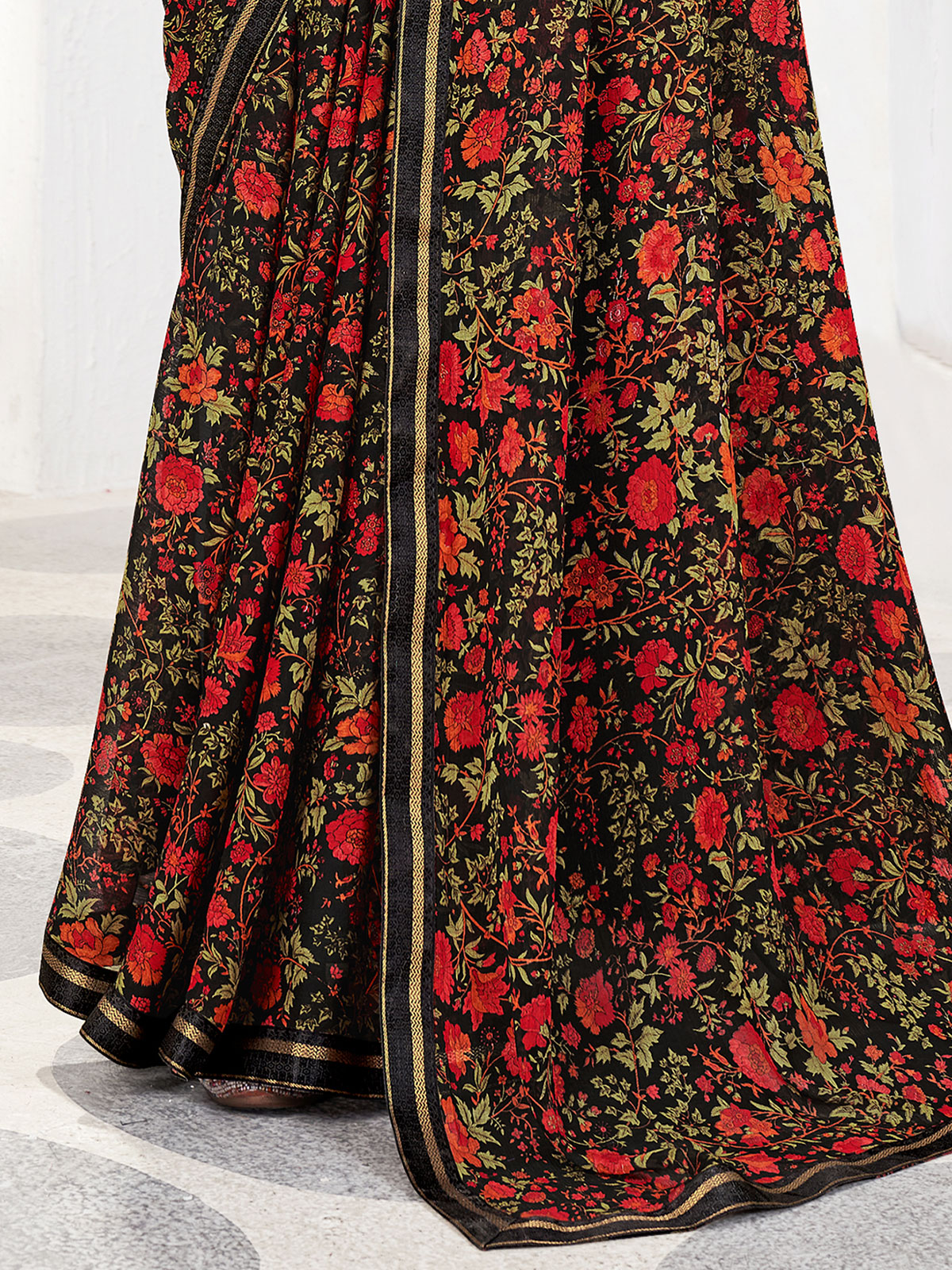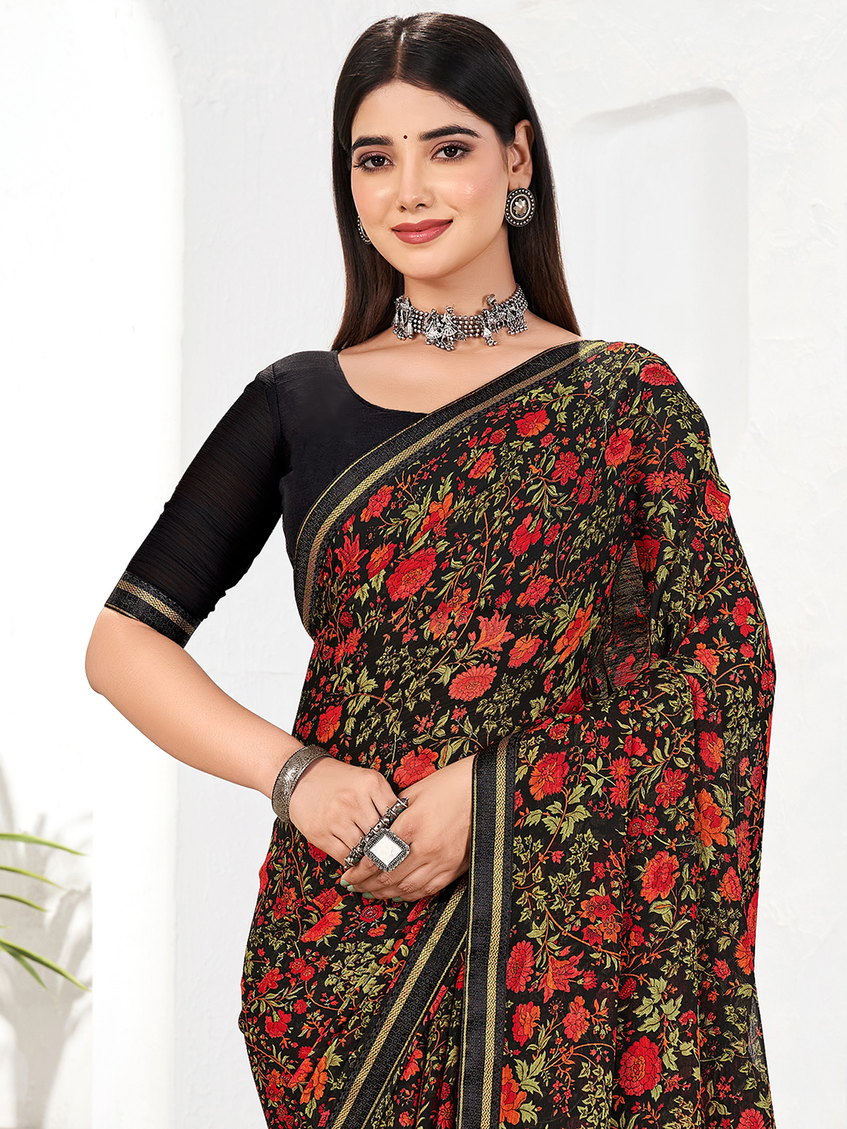 This stylish black georgette saree is adorned with refined zari work and elegant printed patterns. Lightweight and versatile, it drapes beautifully. Comes with an unstitched blouse, perfect for festive functions and casual outings.