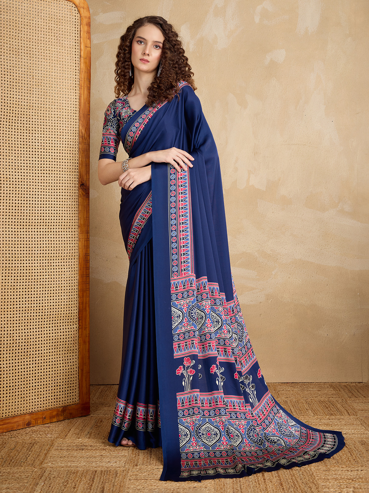 Elegant and contemporary, this blue satin-finish saree showcases a smooth, lustrous drape that creates a graceful silhouette. The design is enhanced with a vibrant multicolored geometric and floral border in shades of red, gold, and blue, flowing into a richly patterned pallu. Paired with a coordinated printed unstitched blouse, this saree is perfect for evening events and festive gatherings.