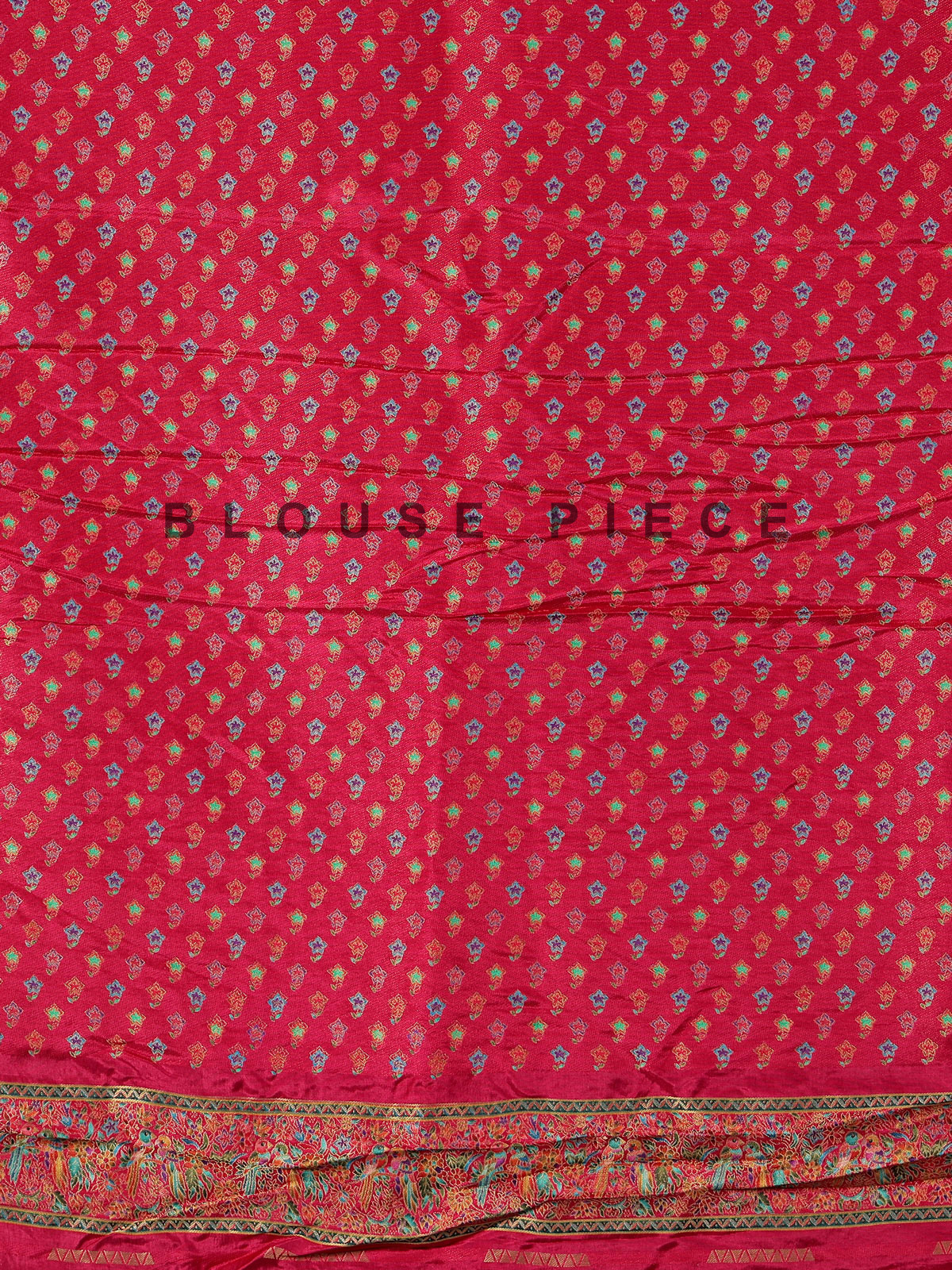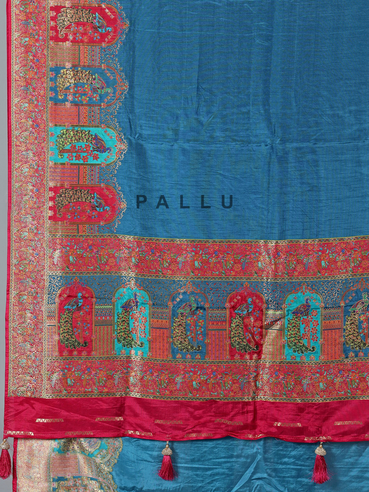 Graceful and striking, this blue art pasmina silk saree is adorned with embroidery, thread, zari, and peacock-inspired detailing. The contrasting red border and elaborate multicolored pallu enhance its traditional charm, while the unstitched blouse makes it perfect for weddings, receptions, and festive events.