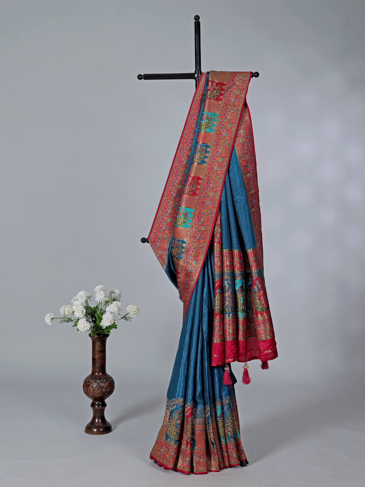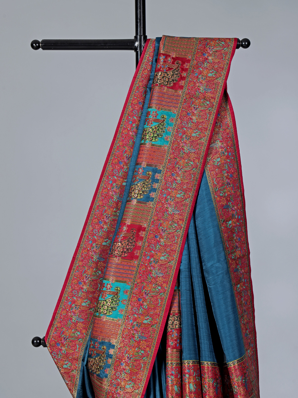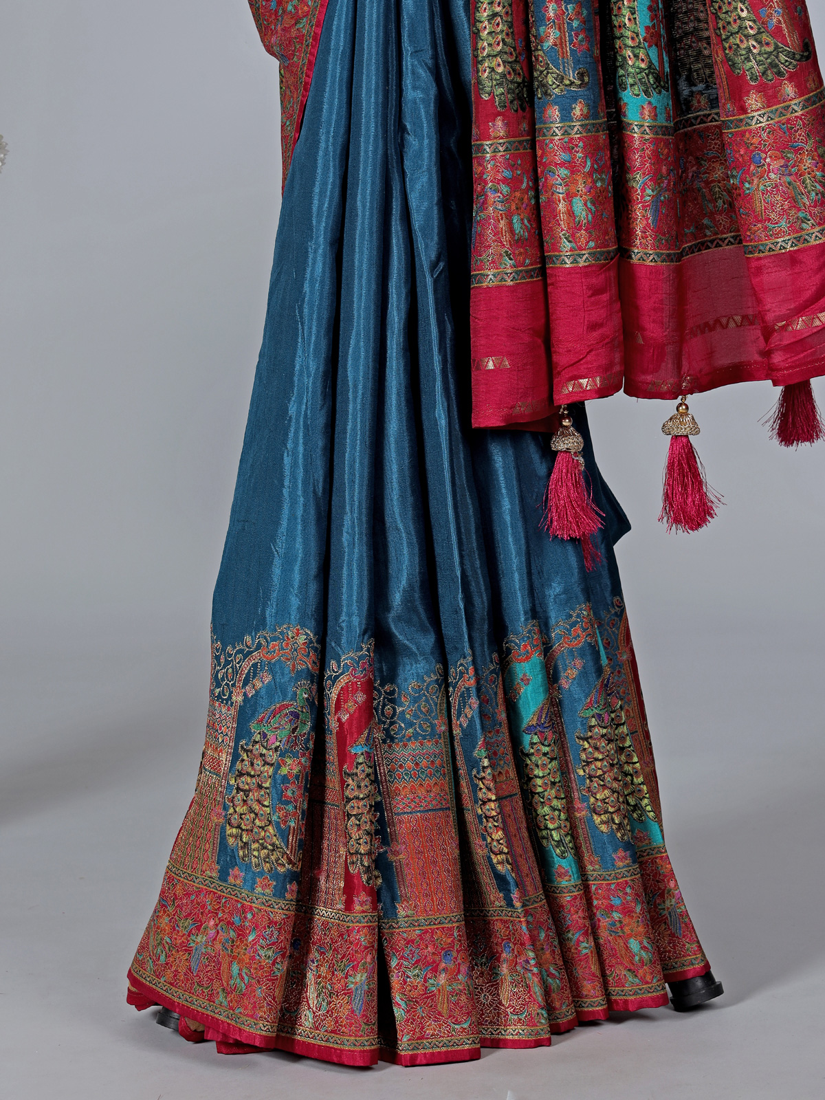 Blue Art Pashmina Silk Saree Enhanced With Intricate Peacock Embroidery