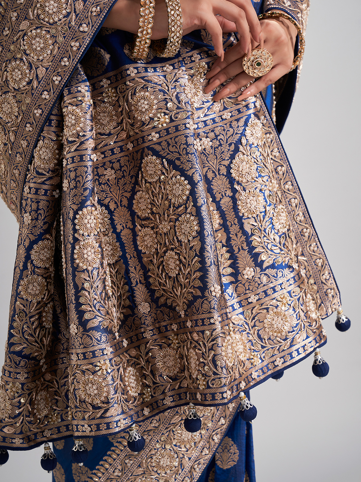 This blue banarasi silk saree is a tribute to festive elegance, enriched with zardosi, cutdana, beads, and sequins. Tailored for wedding wear, it comes with an unstitched blouse piece.