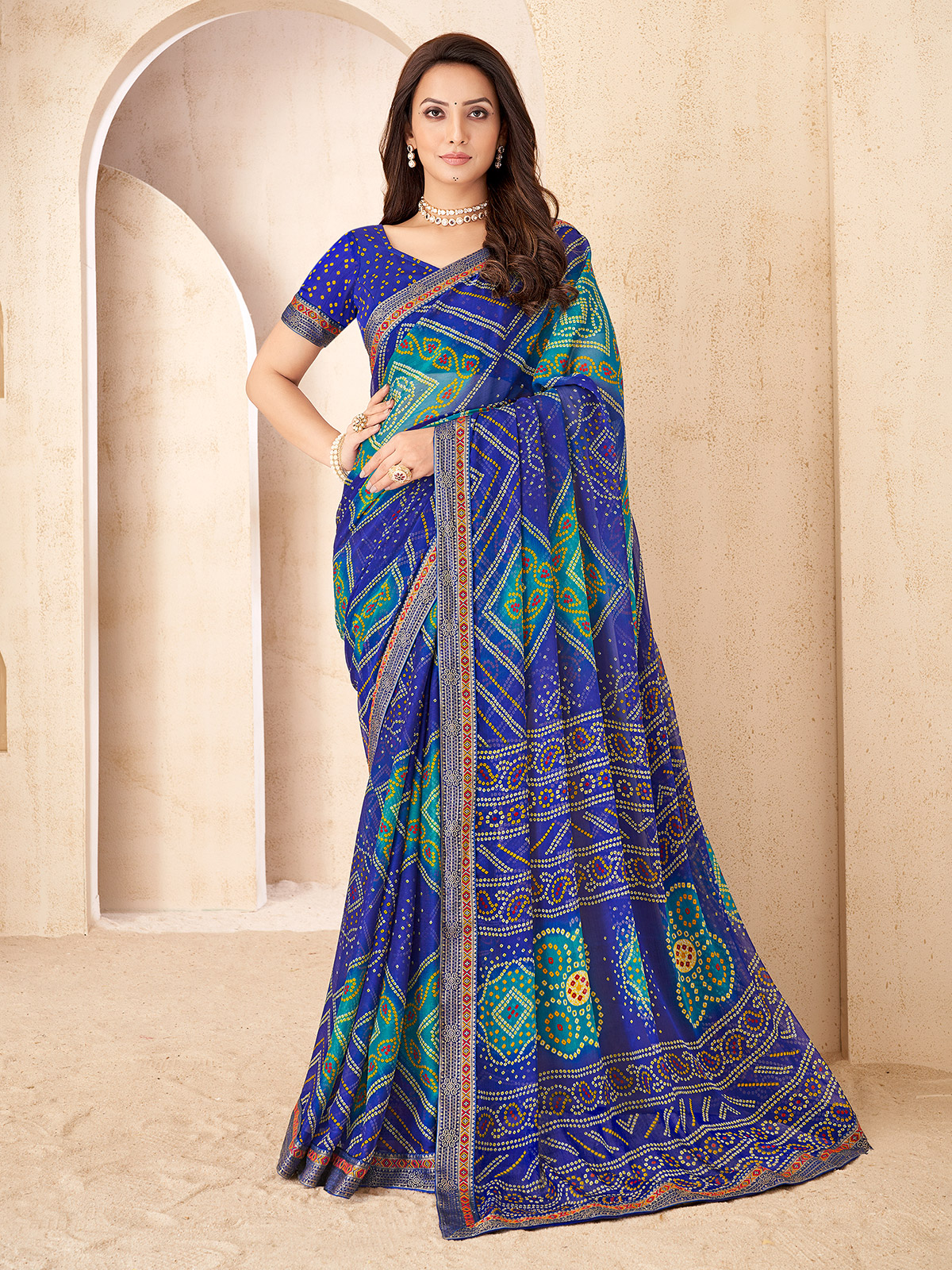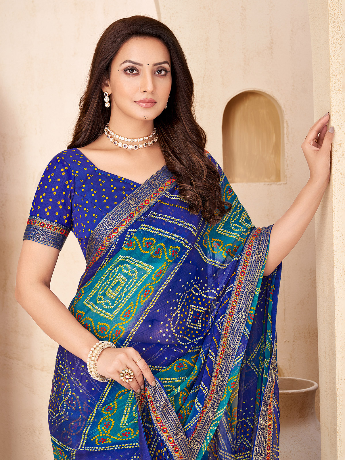 Gracefully blending tradition and sophistication, this blue chiffon saree showcases exquisite bandhani print. A regal choice for festivals, it offers a refined, elegant look. Includes an unstitched blouse piece.
